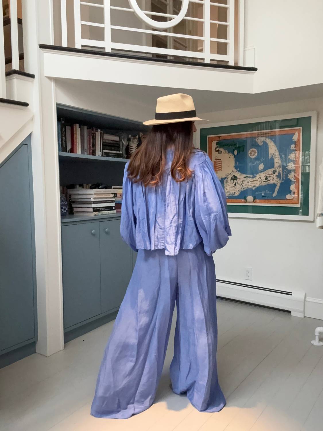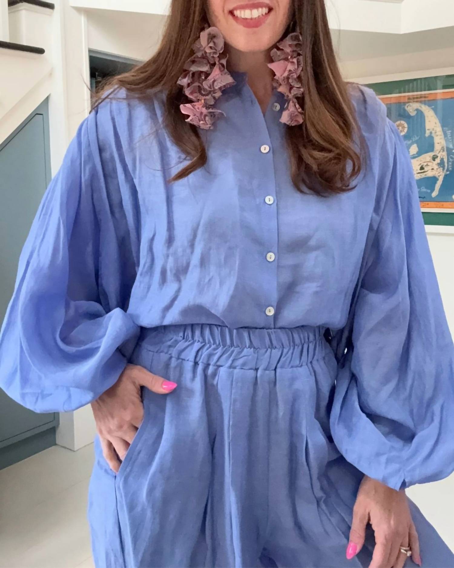 Perfectly tailored and soft to the touch. Introducing the Callisto Button Down Shirt by Pearl & Caviar, a stylish essential perfect for any summer occasion or travel. This women's shirt features a classic crewneck and long sleeves, crafted from a luxurious linen/rayon blend. Its solid lavender hue is both vibrant and adaptable, designed to be worn solo or paired with matching wide-leg pants for a coordinated outfit. Closure: Button closure.