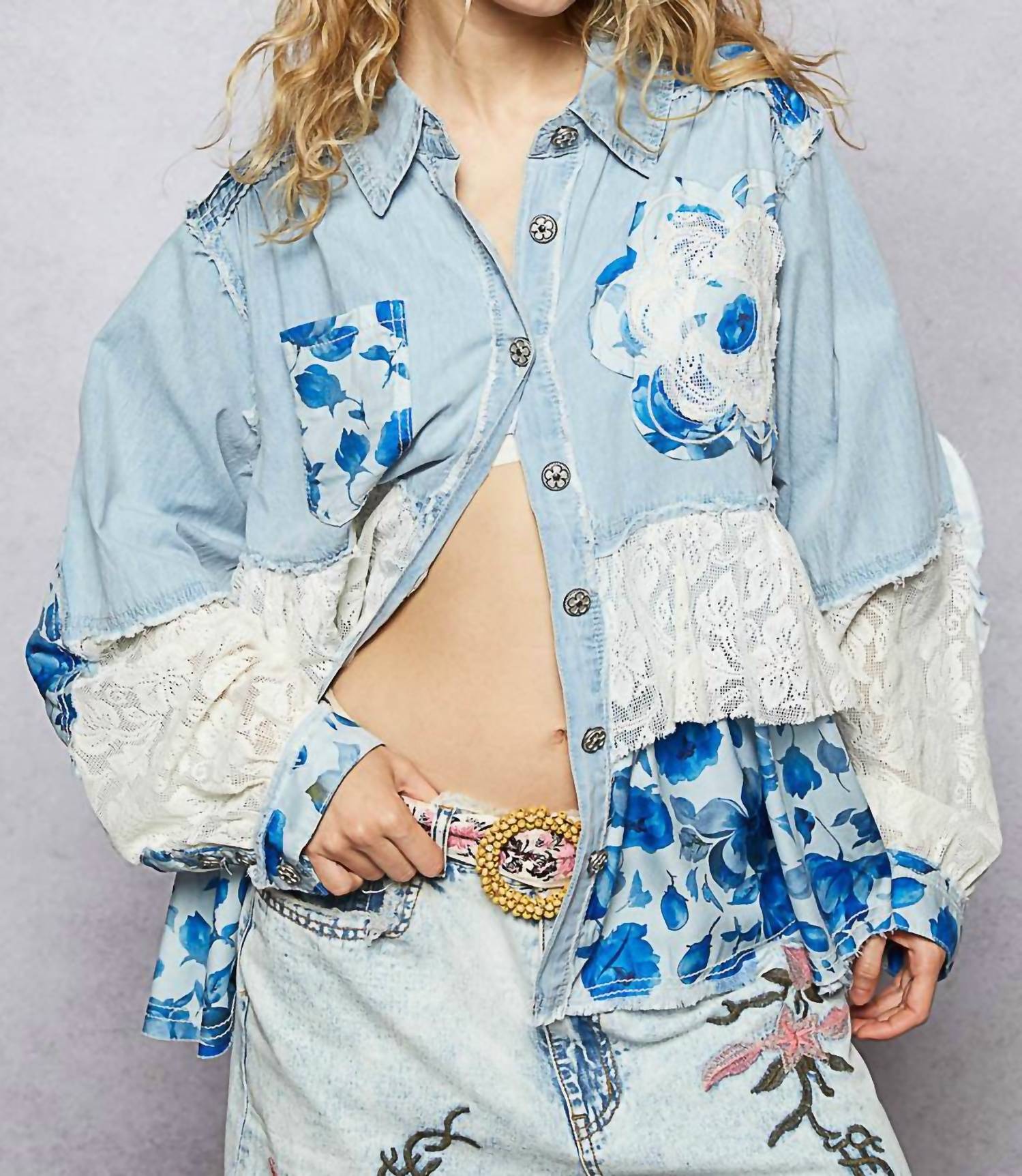 Pol - Patchwork Denim Shirt With Lace Trim Details