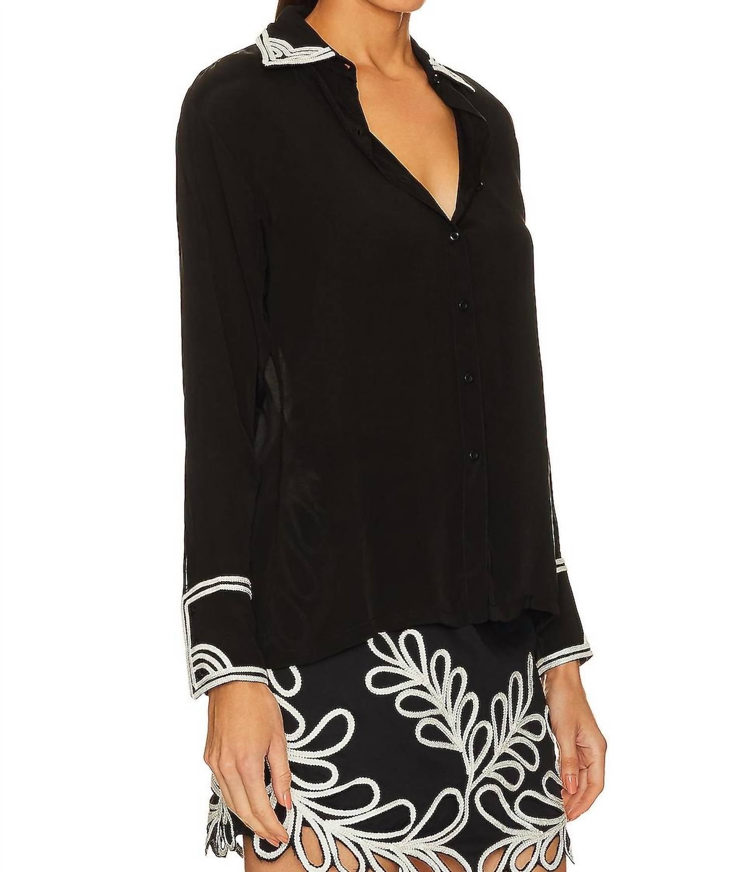 This button down shirt is comfortable yet polished. Unveil sophistication with the Karina Grimaldi Long Sleeve Sheer Embroidered Top in timeless black. This silk blend shirt, made with 80% Silk and 20% Viscose, is a delicate masterpiece featuring refined white embroidery on the cuffs and collar. Crafted in India, it embodies elegance with its long sleeves and button closure, ideal for a workwear trend this spring. Care: Dry clean only.