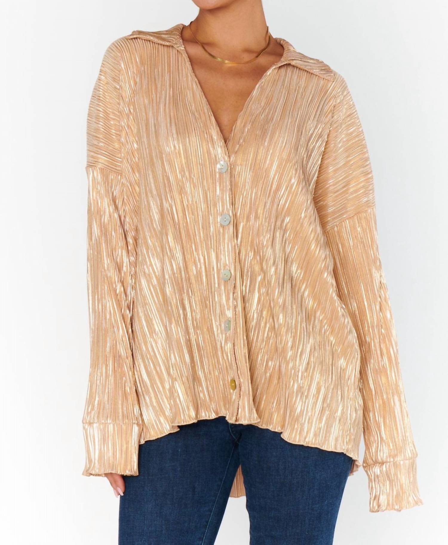 A classic button down shirt that will never go out of style. Introducing the Everywhere Top by Show Me Your Mumu, a chic and versatile addition to your wardrobe in a shimmering gold pleat. This oversized button-down features long sleeves and a textured pattern, perfect for dressing up or down. It is crafted with a flattering V-neckline for a stylish finish. Closure: Button closure.