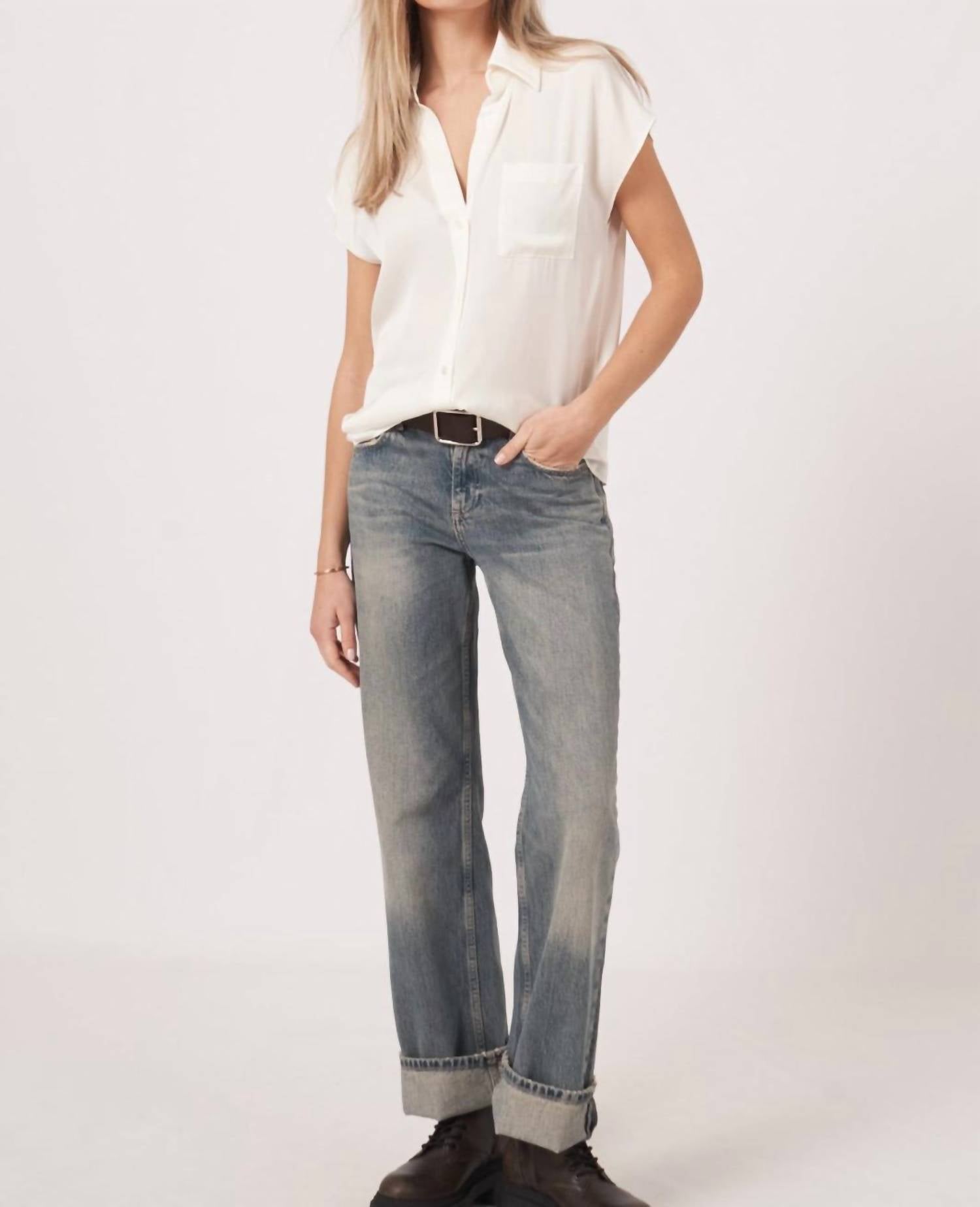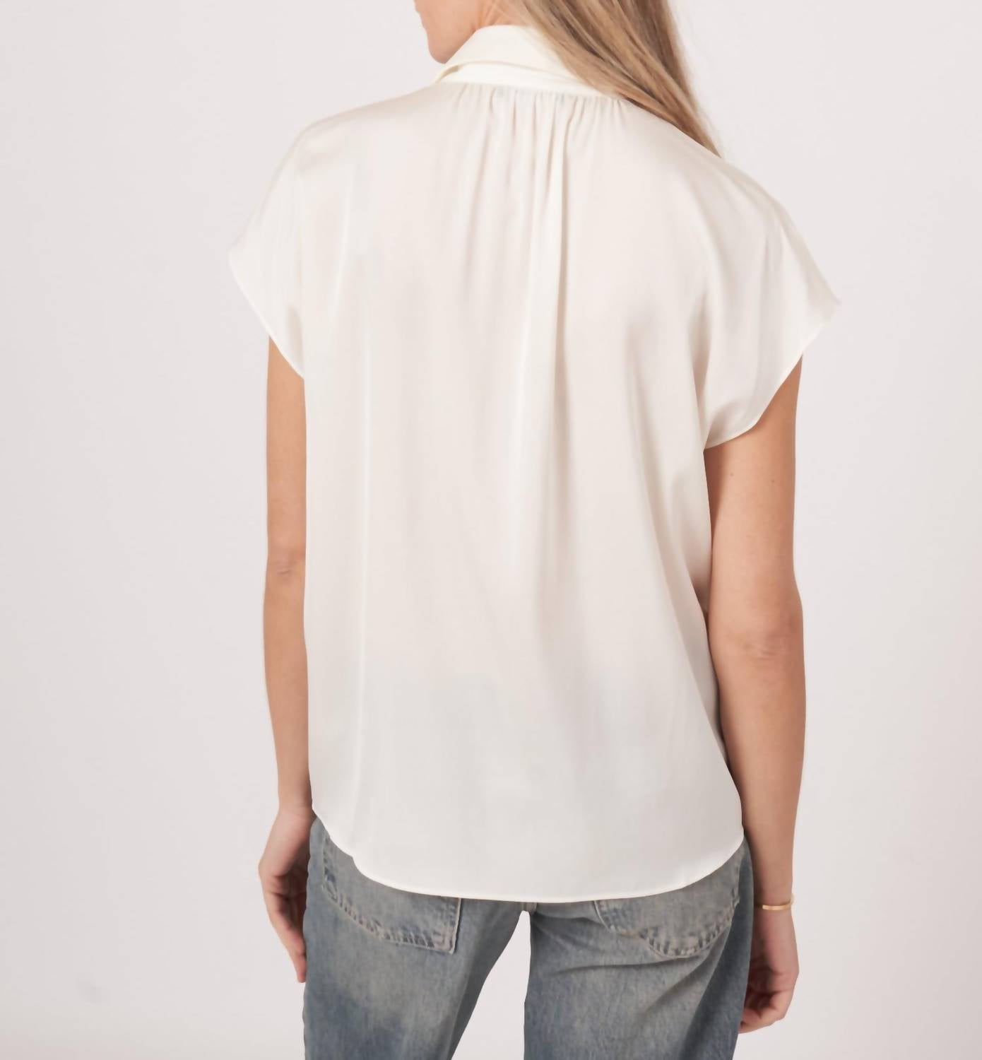 A classic button down shirt that will never go out of style. Elevate your summer wardrobe with the Silk Top With Pocket by REPEAT Cashmere, an embodiment of minimalist elegance. This sleeveless blouse, featuring cap sleeves and a shirt collar, is crafted from a premium stretch silk blend composed of 95% Silk and 5% Elastane. It offers a loose fit with a drop shoulder design, complemented by a button placket and a convenient patch chest pocket on the left side. Available in Cream and Pearl, this versatile top can be gently hand washed or dry cleaned for enduring style.