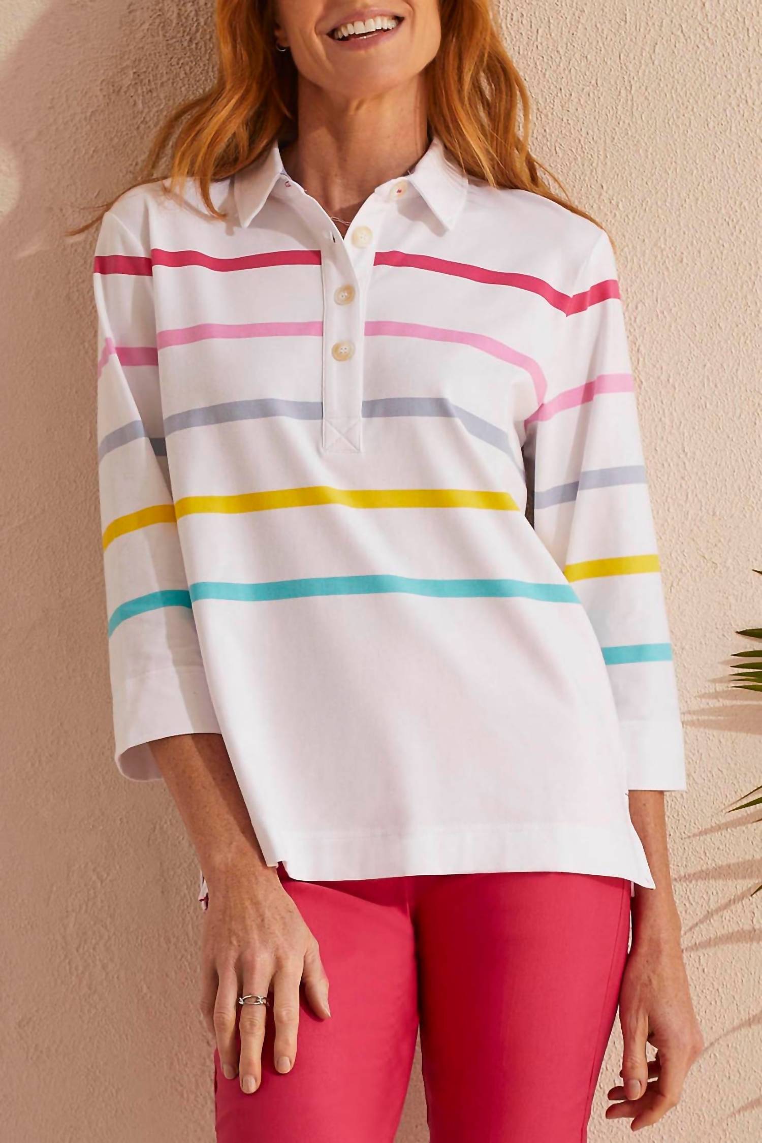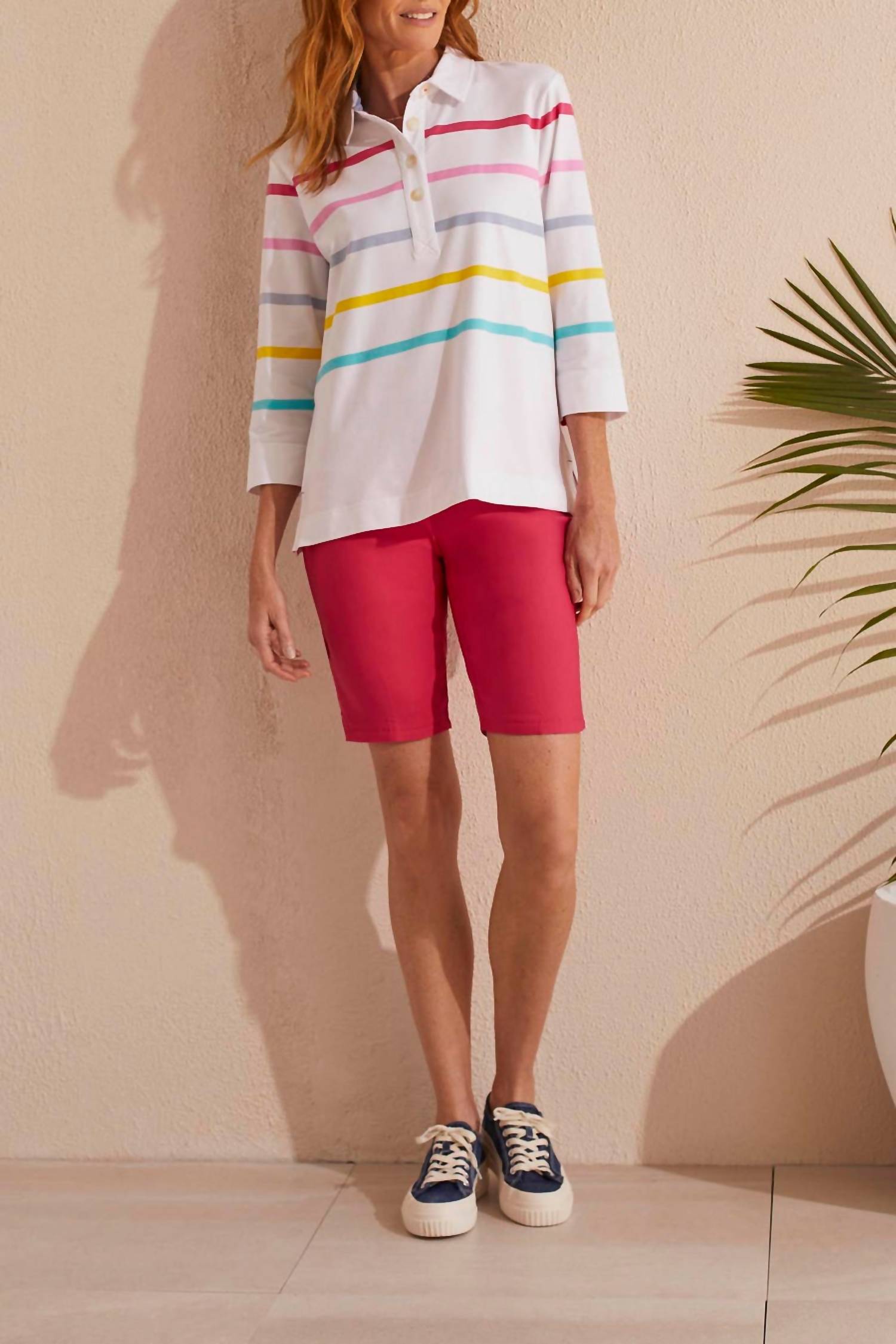 A classic button down shirt that will never go out of style. Introducing the Stripe Polo Shirt by TRIBAL, a vibrant addition to your wardrobe in a playful Raspberry stripe. Crafted from a high-quality cotton blend, this button-down shirt features three-quarter sleeves and a classic collar, providing ideal arm coverage for a comfortable fit. Designed with a button closure, it's both stylish and easy to wear. Care for this piece effortlessly with a machine wash, ensuring it remains a staple for seasons to come.