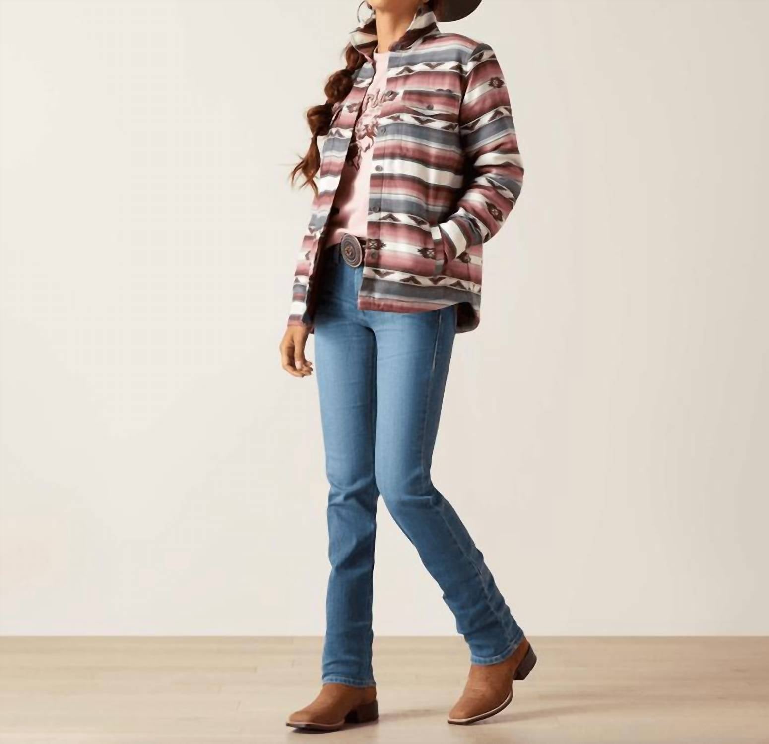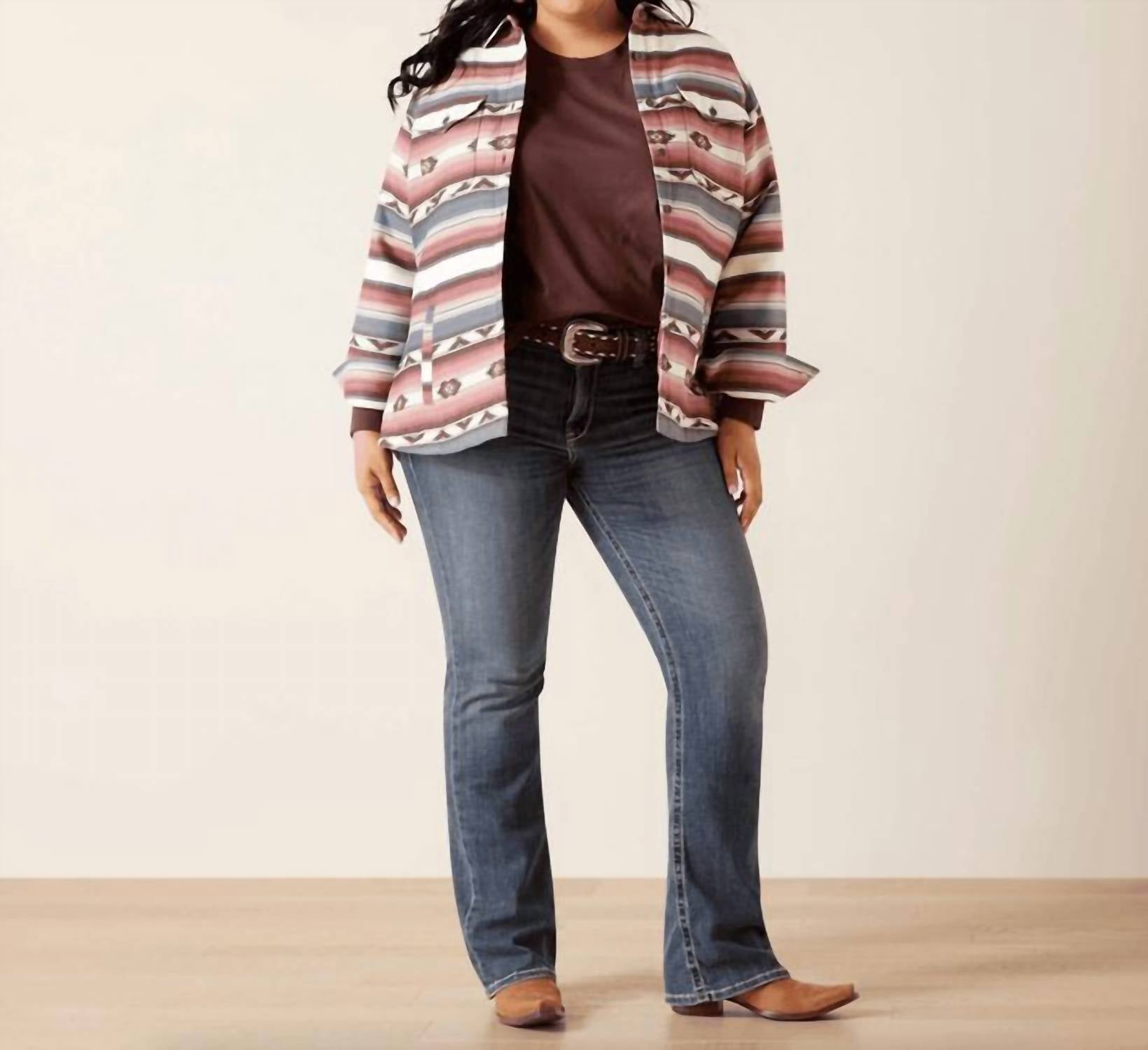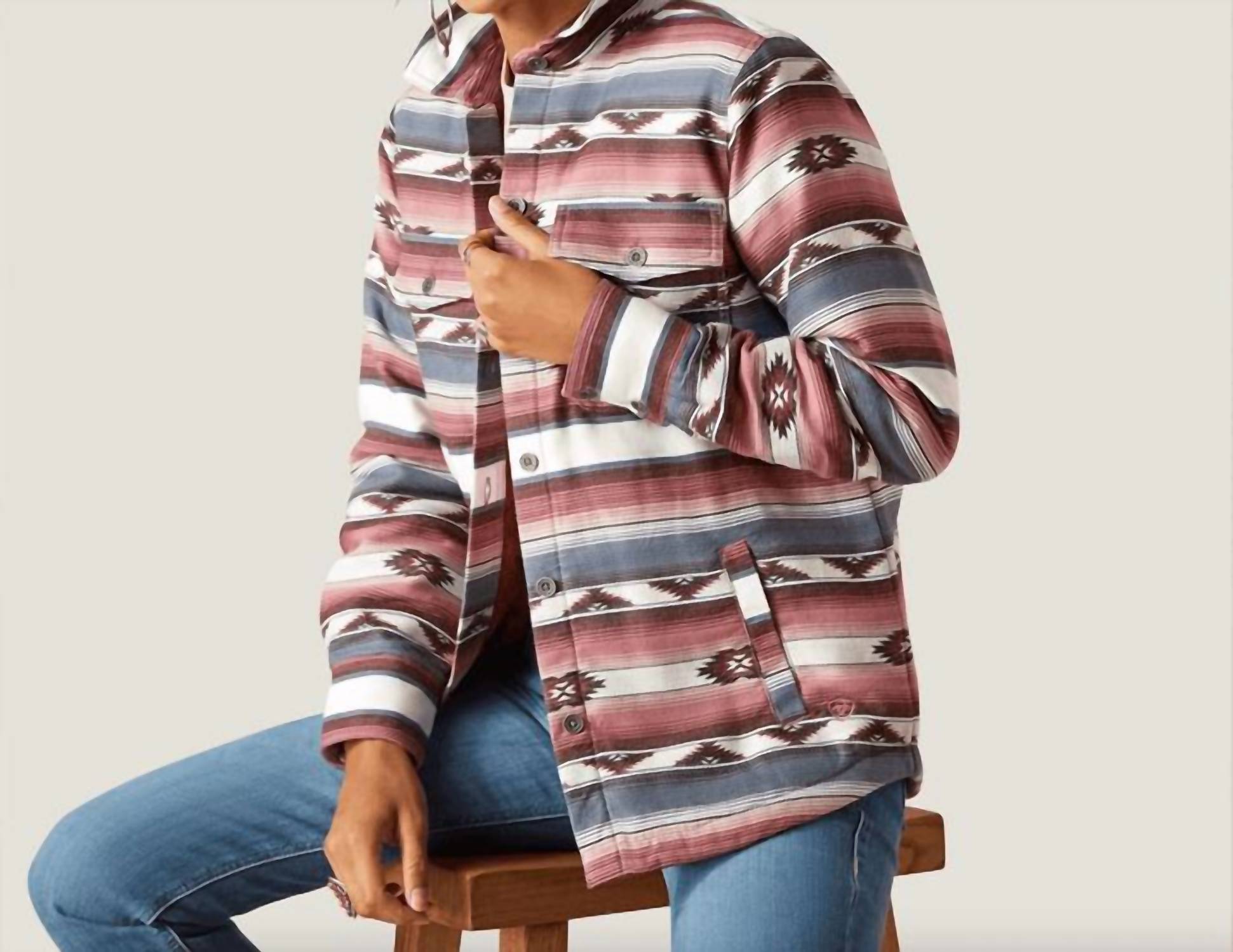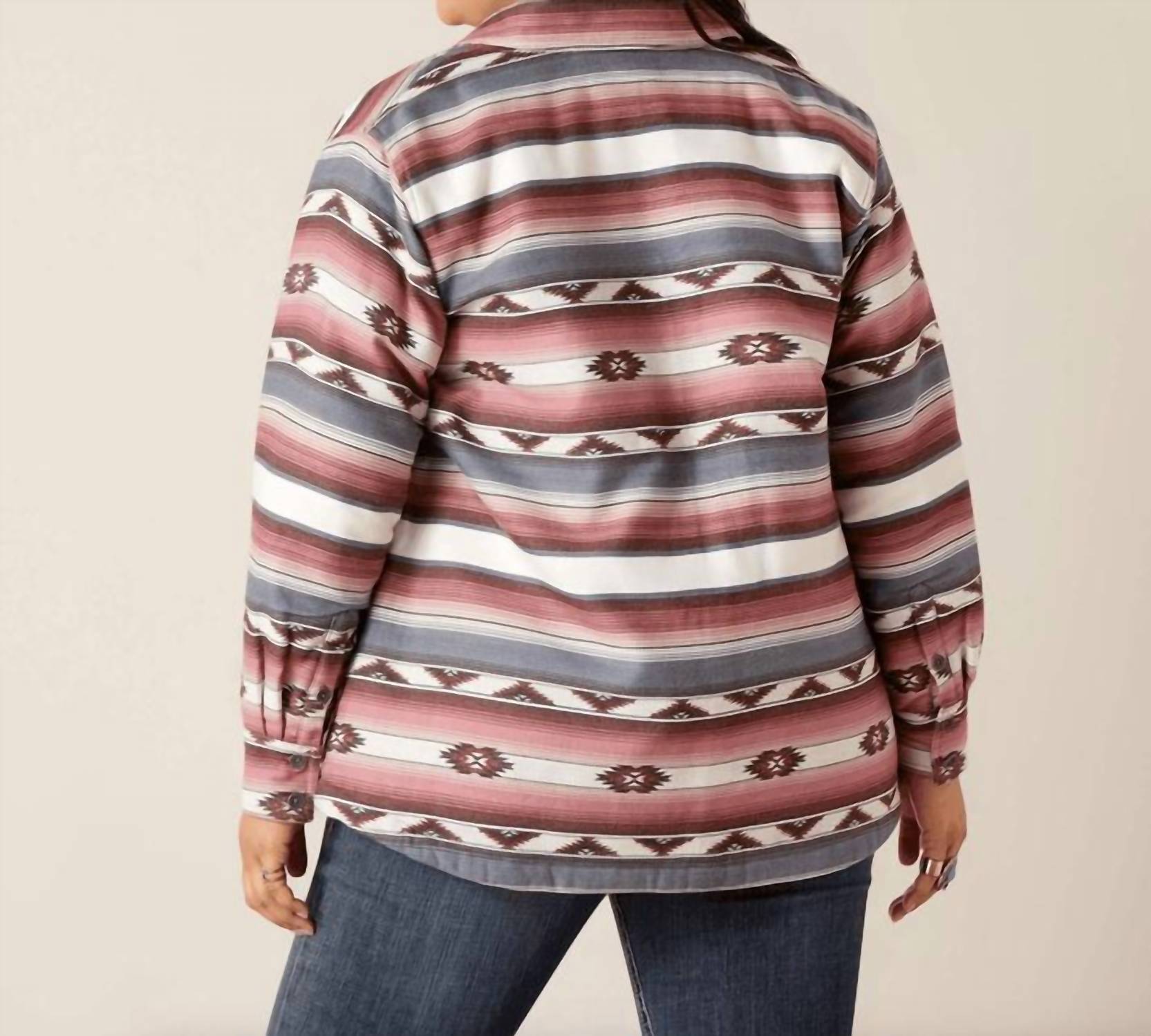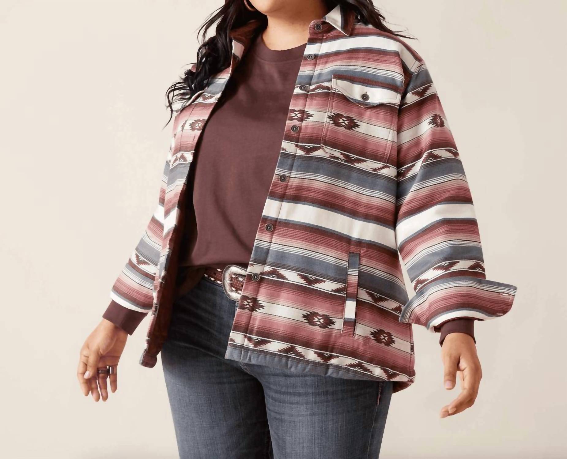 This button down shirt is comfortable yet polished. Introducing the ARIAT Serape R.E.A.L Shacket, a patterned button-down shirt perfect for holiday parties and spring occasions. This women's shacket boasts long sleeves and a cotton composition, ensuring comfort and style. It features metal button snaps for closure, with practical front chest pockets and snap hand pocket closure for added functionality. The quilted poly fill lining enhances warmth, making it a versatile addition to your wardrobe.