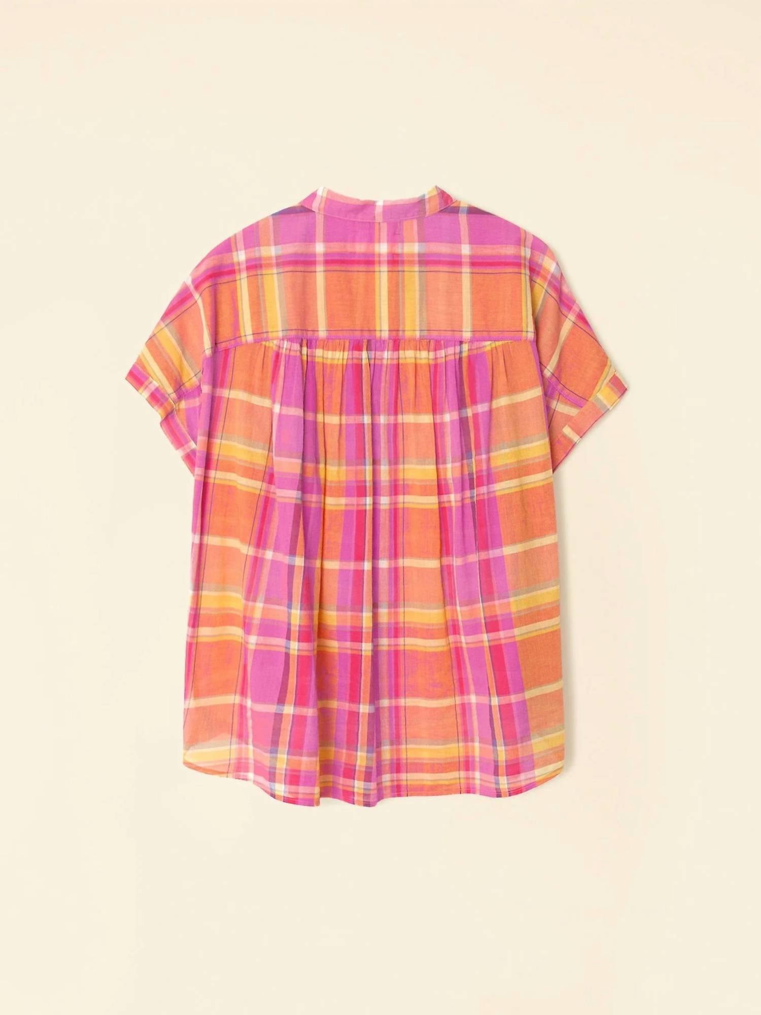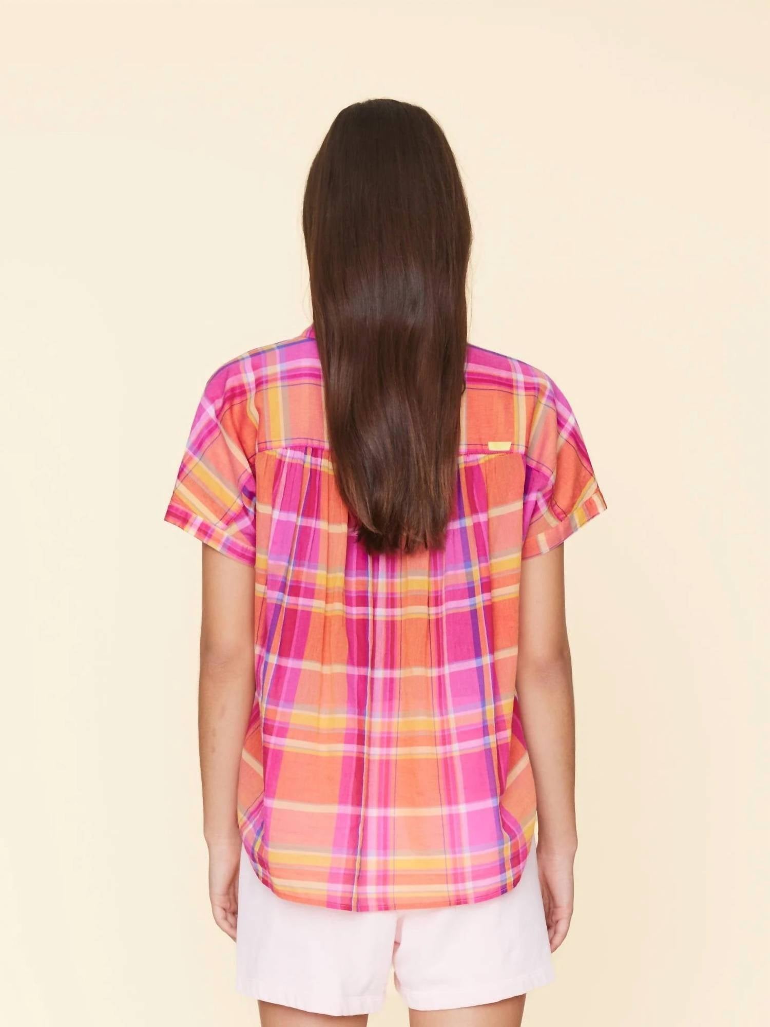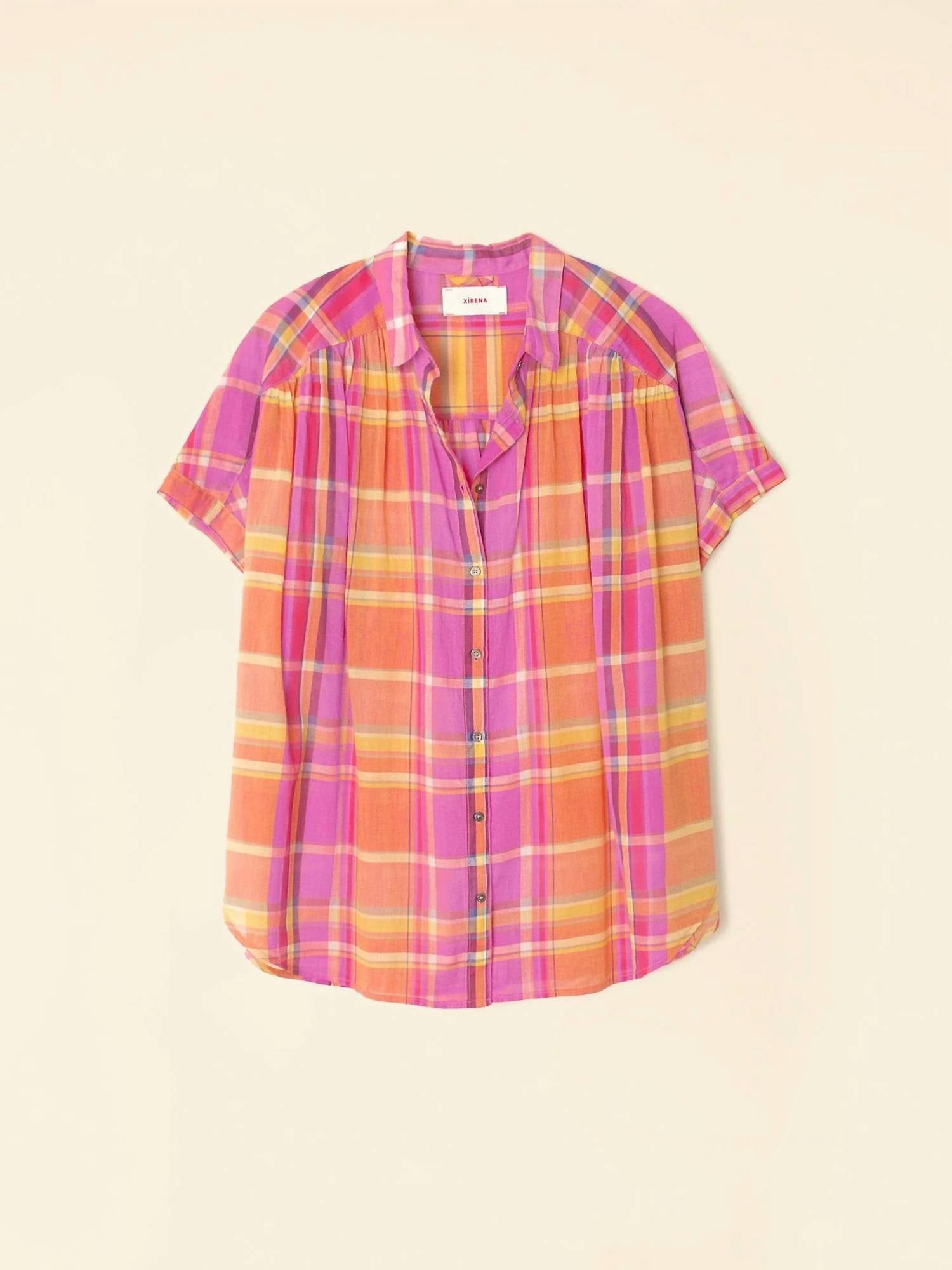 This button down shirt is comfortable yet polished. Introducing the Paxton Shirt by XIRENA, a vibrant short sleeve essential in Coral Blaze. Crafted from lightweight 100% Madras Cotton Plaid, this shirt offers a charming button-front design with cap sleeves and shirred details for a textured look. Expertly made in Los Angeles, it features a stylish high-low shirttail hem, perfect for adding a modern twist to your wardrobe. Care for it with ease using machine wash on a gentle cycle and low tumble dry.