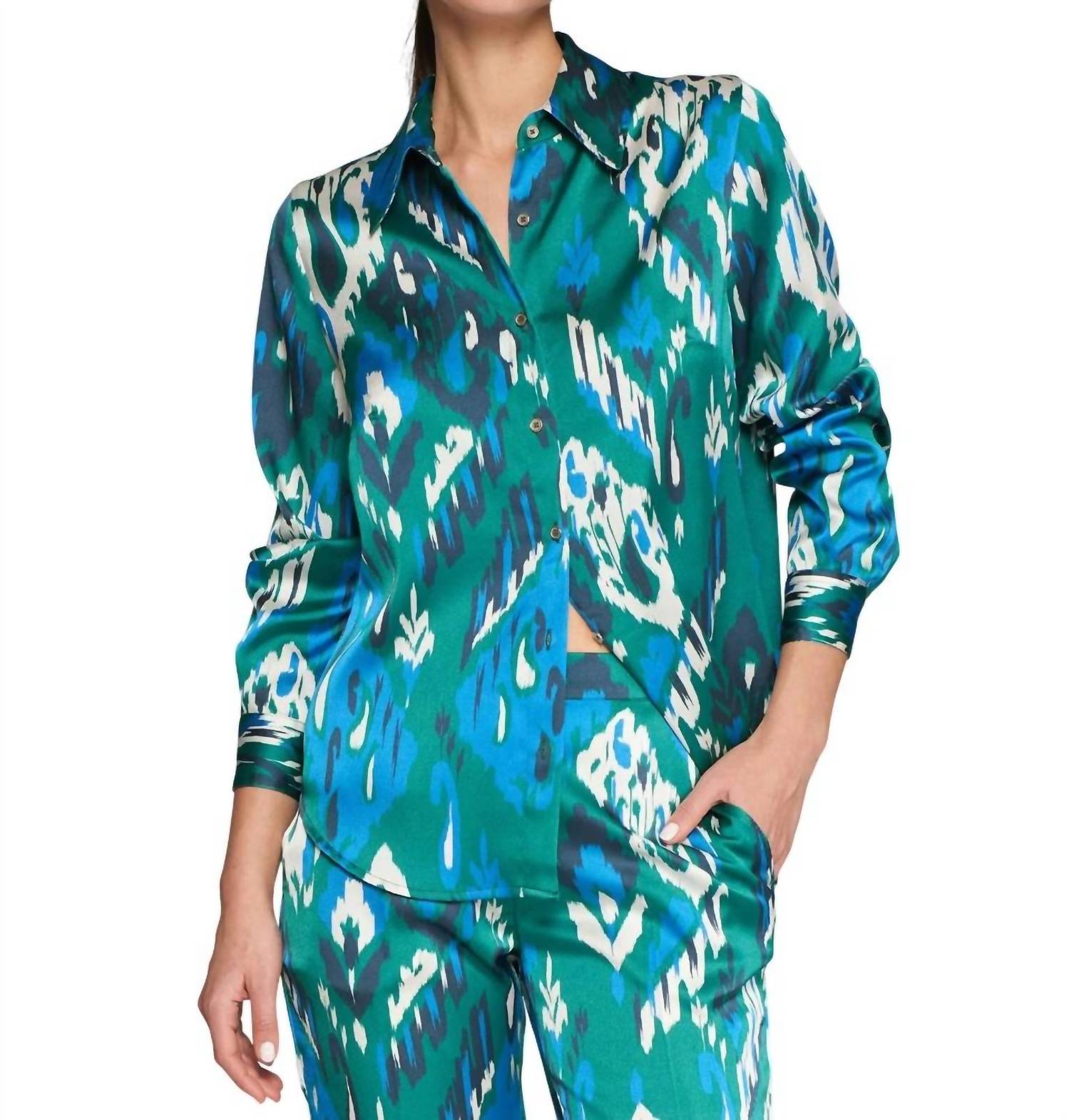 A stylish long sleeve button-up shirt in a striking blue-green ikat print. Crafted from 100% polyester, this eye-catching piece combines high-quality material with a unique design perfect for any occasion. Closure: Button. Hand wash and lay flat to dry.