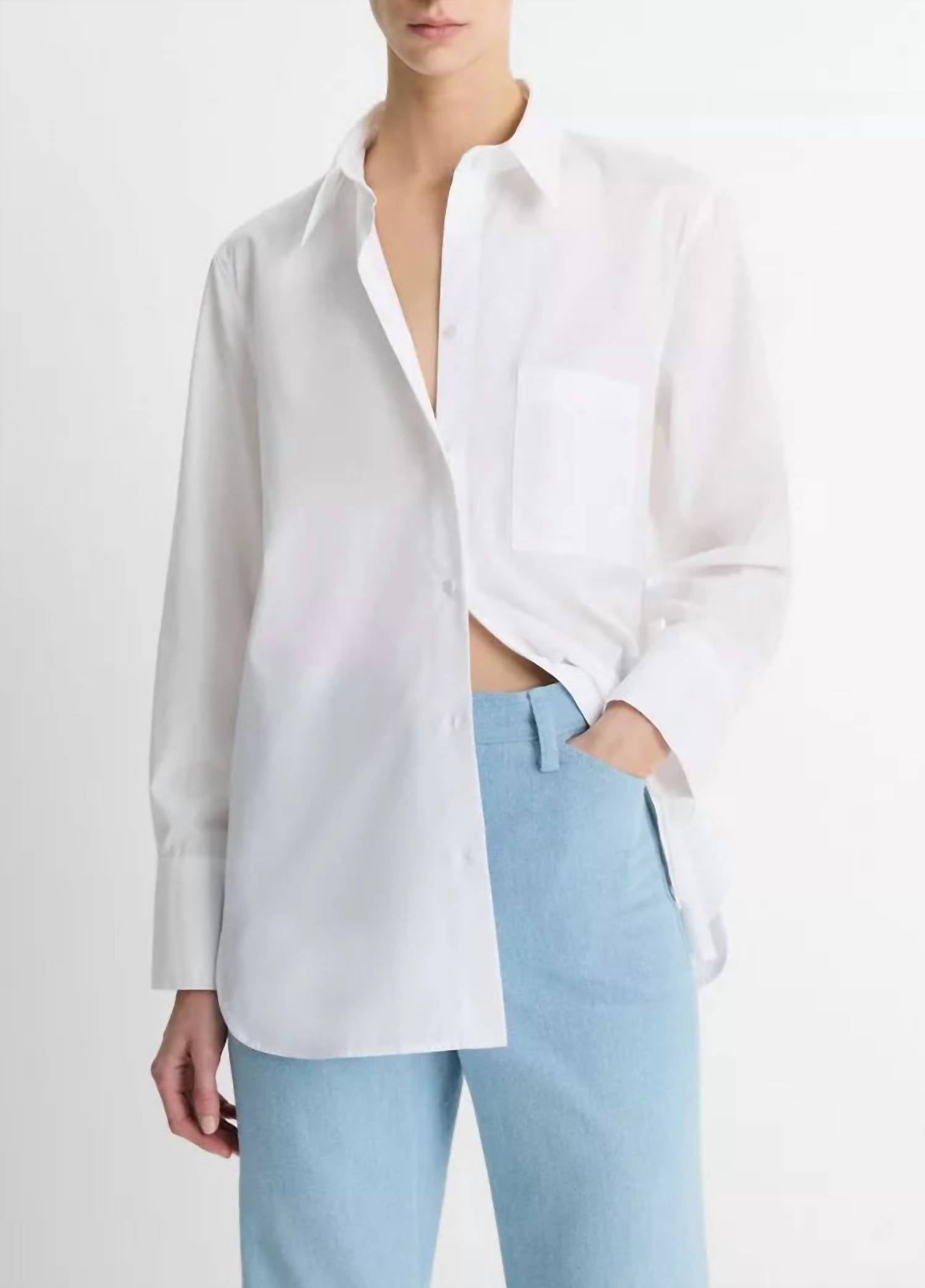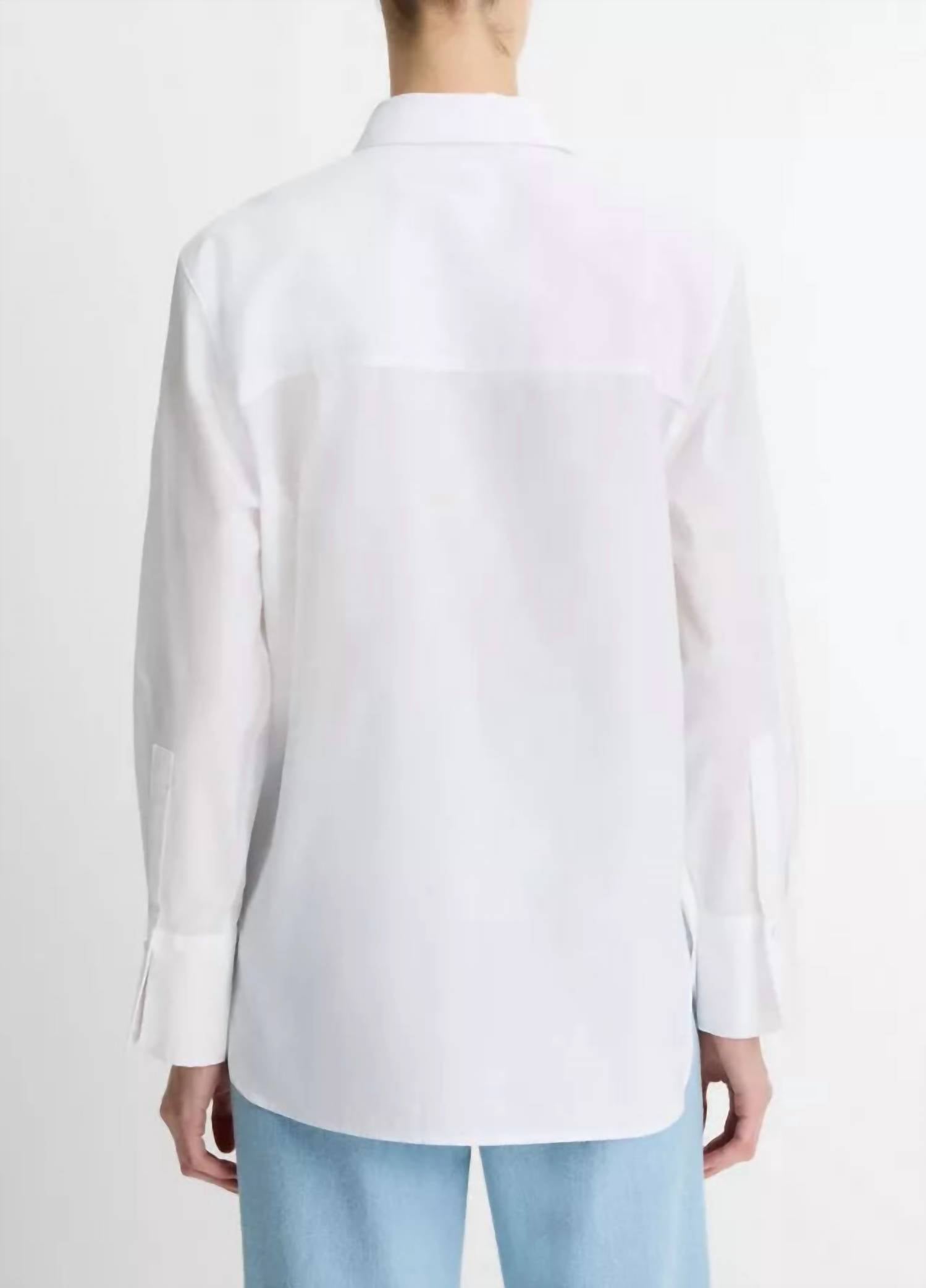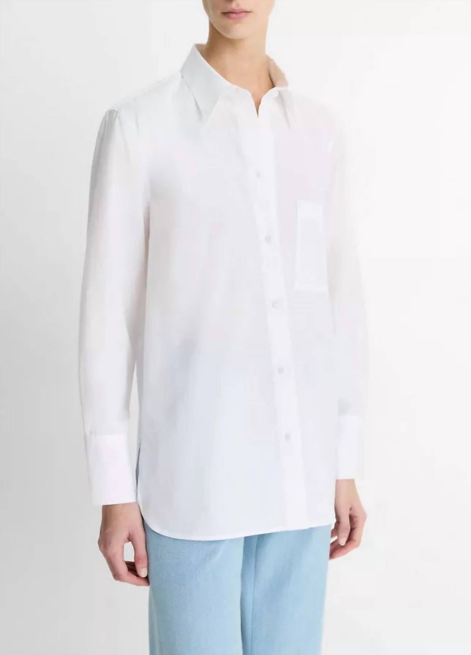 This button down shirt is comfortable yet polished. Experience the effortless elegance of Vince's Cotton Relaxed Straight Shirt in Optic White. This long-sleeve button-down is crafted from 100% premium Japanese cotton, featuring a crisp cotton poplin finish with self-covered shank buttons. Measuring 29.37 inches in length, the shirt includes a patch chest pocket and a back shoulder yoke for added style. Care is easy: machine wash cold with like colors, line dry, and warm iron if needed or opt for dry cleaning. Perfect for various occasions, from spring workwear to summer outings.