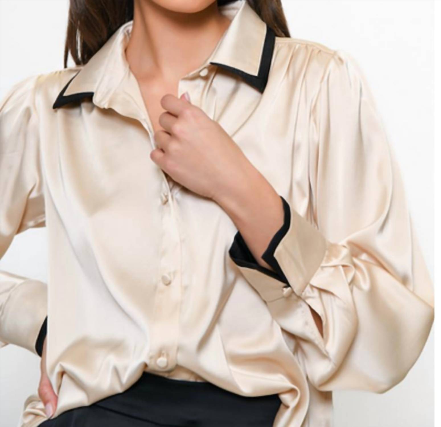 A classic button down shirt that will never go out of style. The Kodie Top by Hutch is an exquisite long sleeve button-down shirt, perfect for the Spring season and ideal for a church occasion. Crafted from silky satin in a luxurious champagne color, it features a doubled sharp dress collar and a covered button front detail. The top measures 23 inches from the high point of the shoulder. For best care, it is recommended to dry clean only.