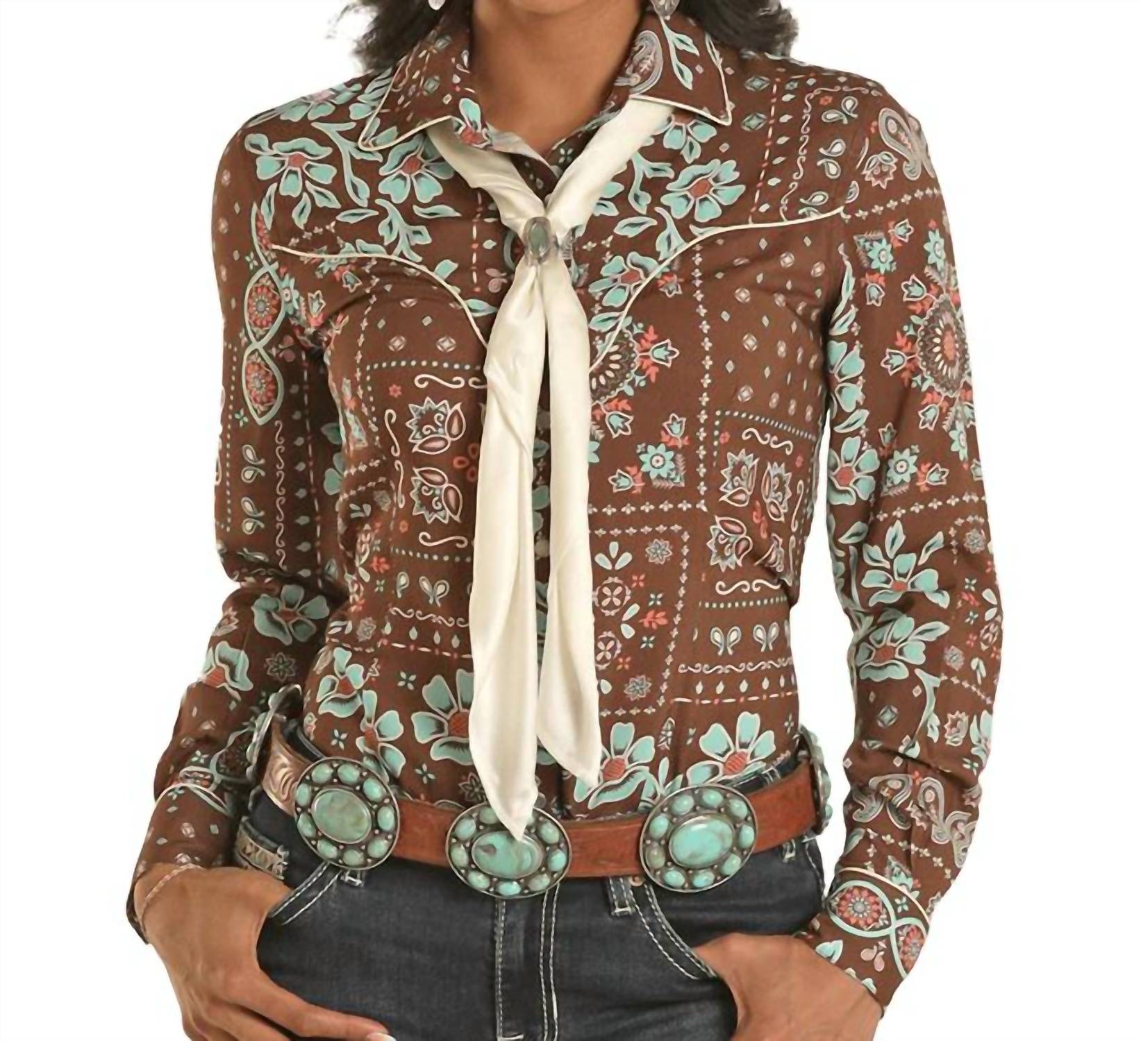 This button down shirt is comfortable yet polished. Experience retro flair in stylish women's shirt. Features long sleeves and collared neckline. Crafted from 100% Rayon for a comfortable fit. Boasts a classic snap front closure and snap cuffs for easy wear and a touch of Western charm. Designed in a rich brown color. Perfect for those seeking a vintage-inspired look.