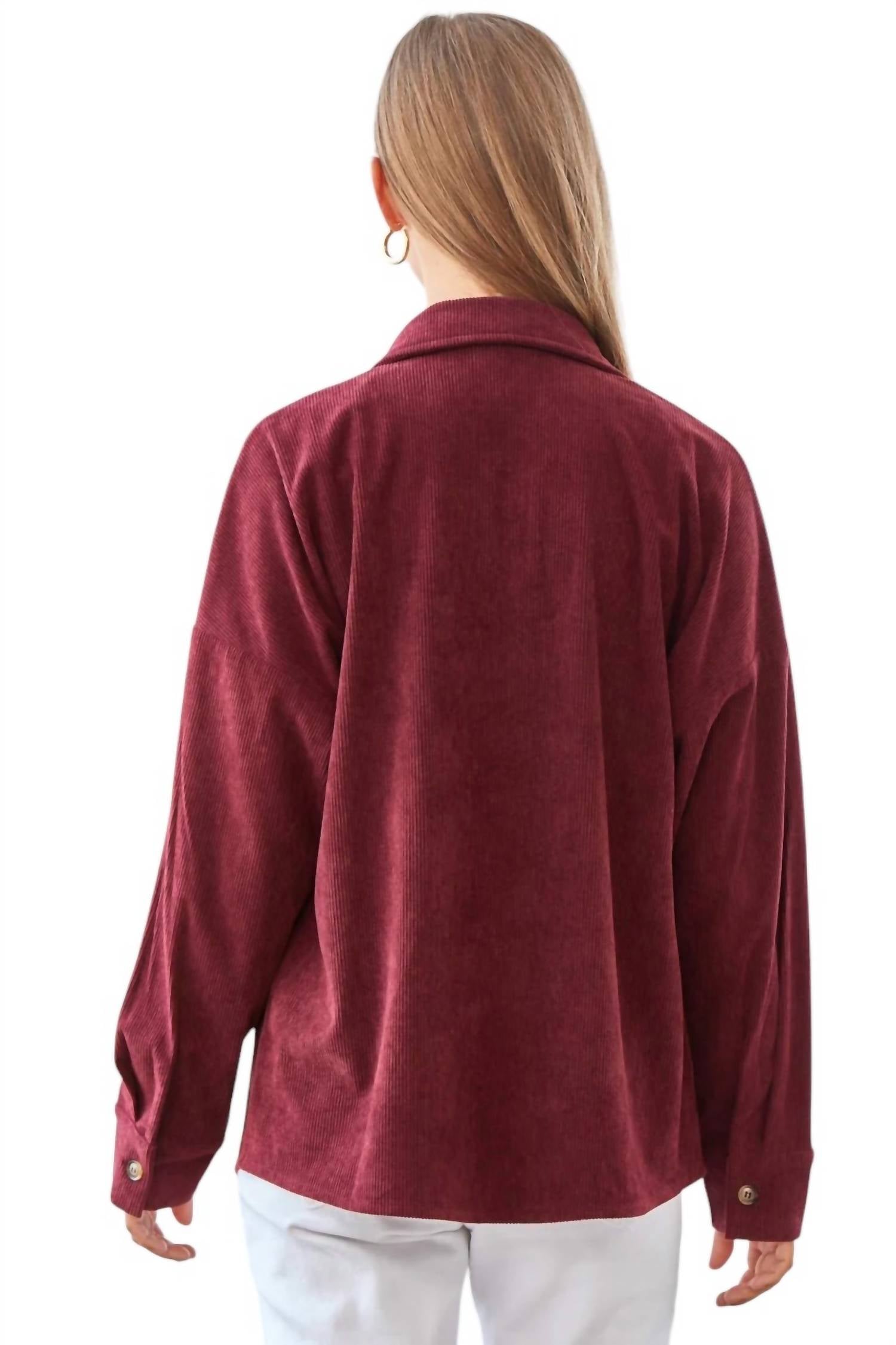 This casual button-up shirt is made from corduroy fabric and features collar detailing, long sleeves, and a chest pocket. It is made from 95% polyester and 5% spandex.