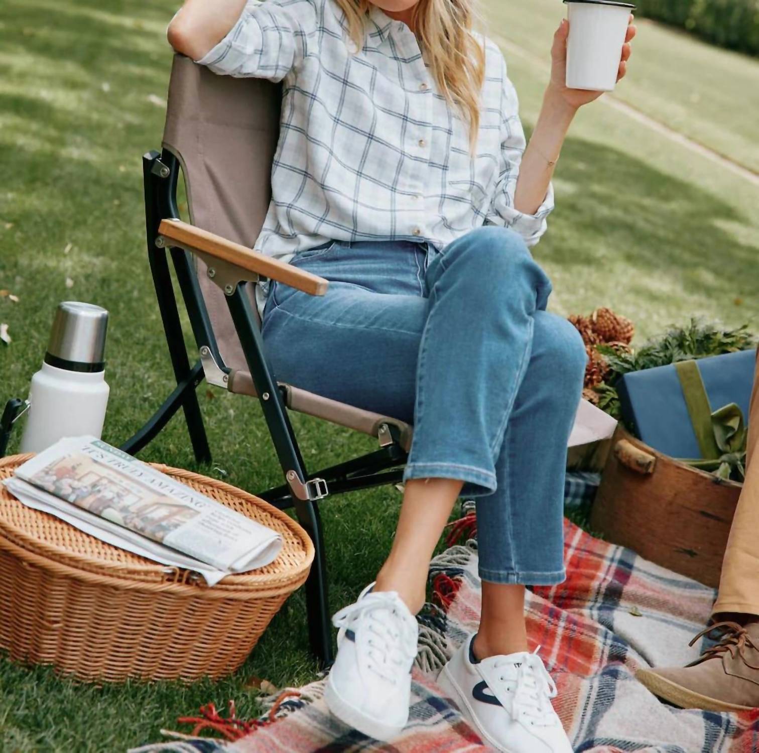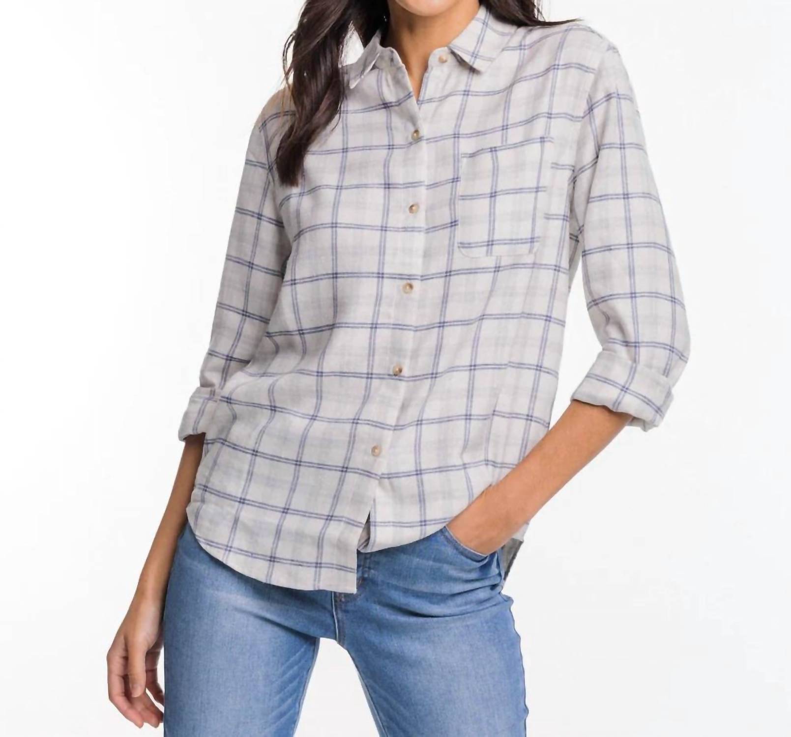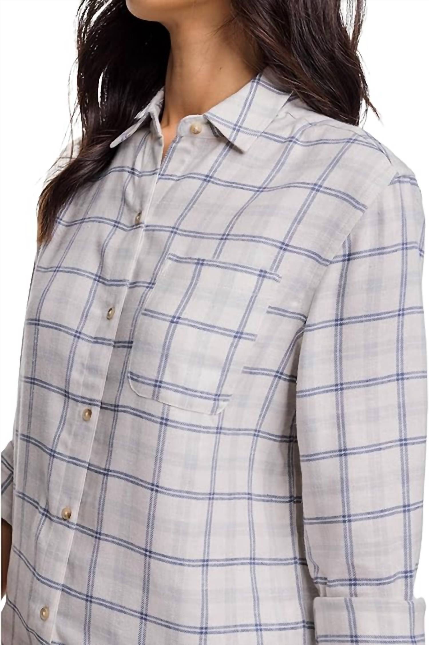 Perfectly tailored and soft to the touch. Introducing the Niki Chilly Morning Plaid Shirt by Southern Tide, perfect for casual fall outings or Thanksgiving travel. This women's button-down features long sleeves and a comfortable collar neckline in a marshmallow color plaid print. Crafted from hemp, it offers a soft feel with practical details like a chest pocket and relaxed fit. Closure: Button closure. Care: Machine wash and tumble dry. Ideal for a preppy look during your festive adventures.