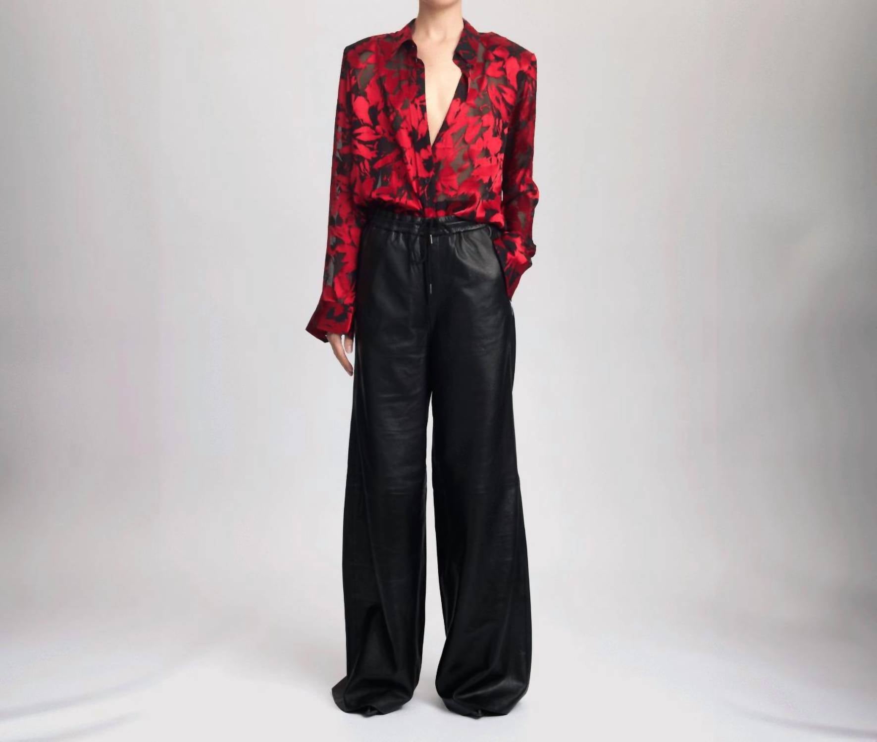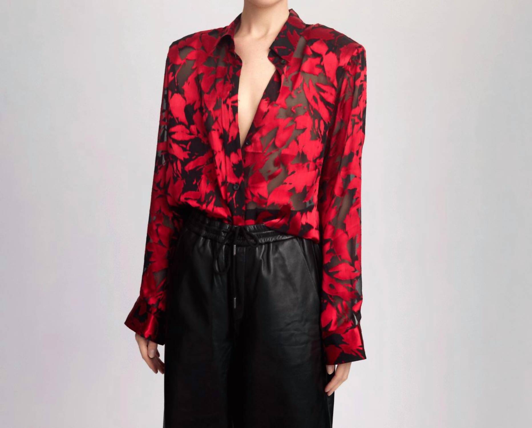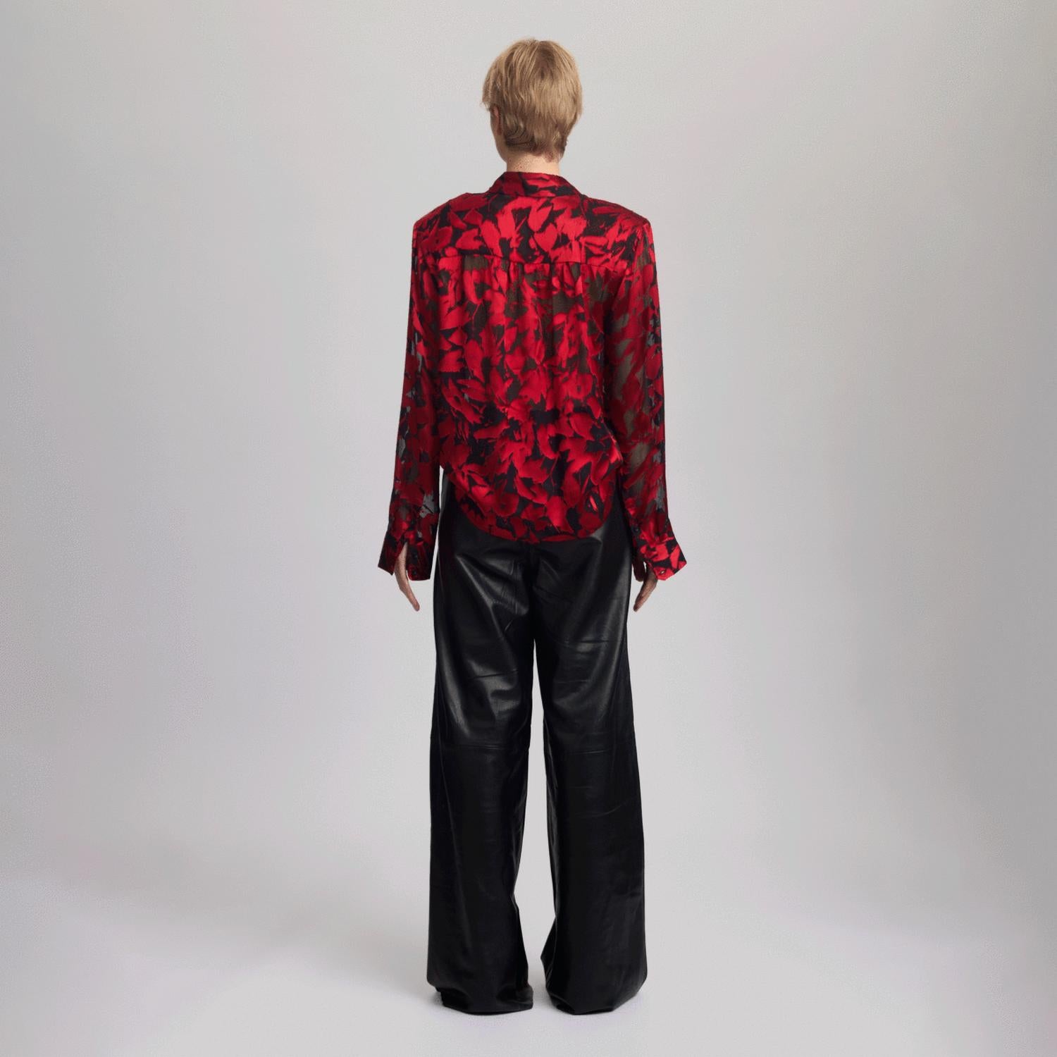 A classic button down shirt that will never go out of style. Introducing the Elvagz P Silk Shirt by Gestuz, crafted for the modern woman who desires a blend of style and sophistication. This long sleeve blouse showcases a semi-sheer, red and black floral print with an impeccable silk blend of 75% Viscose and 25% Silk for a luxurious feel. It features a classic button-down silhouette with a straight fit and removable shoulder pads for versatile styling. Elevate your workwear wardrobe this spring with a timeless piece that exudes elegance.