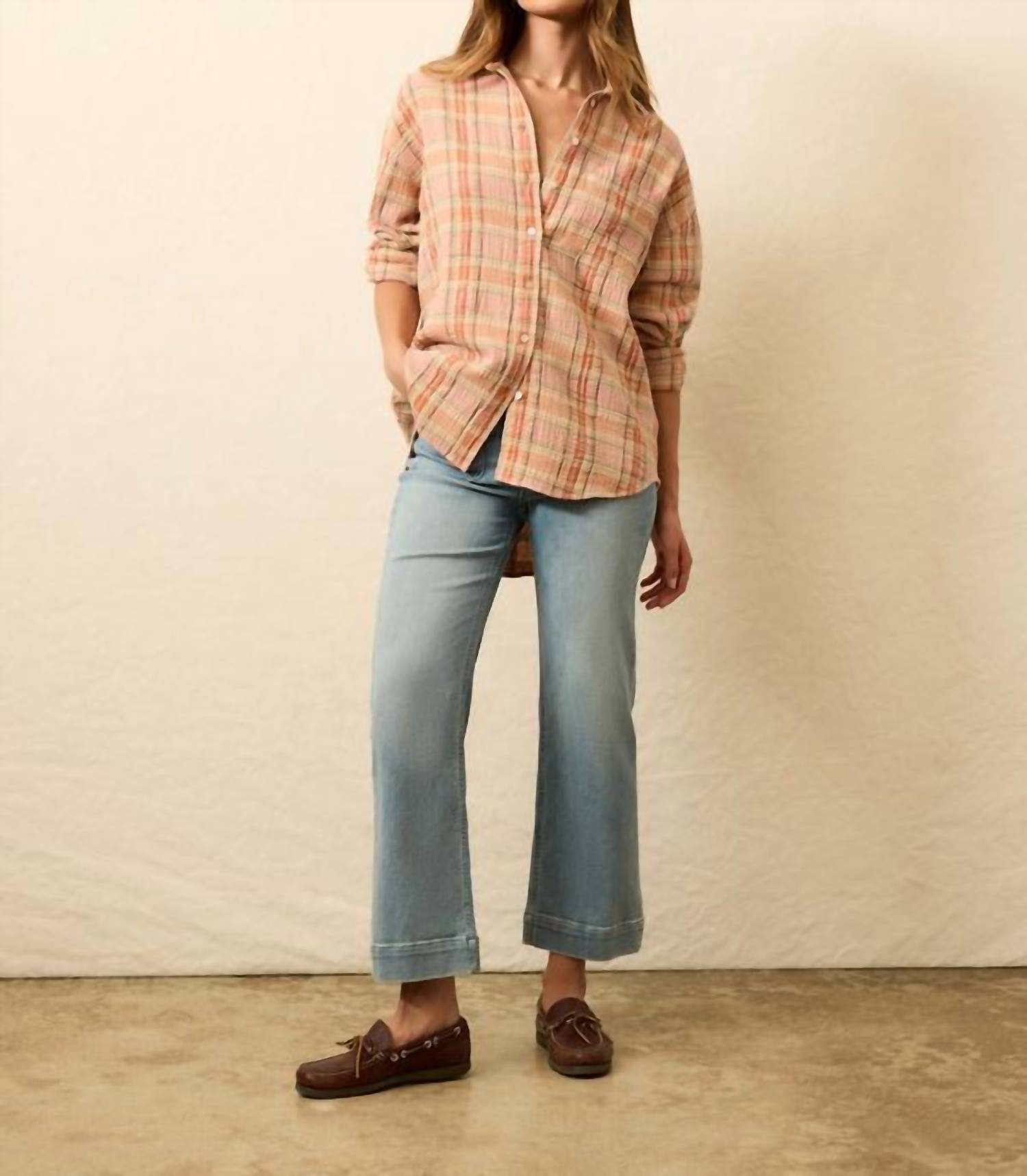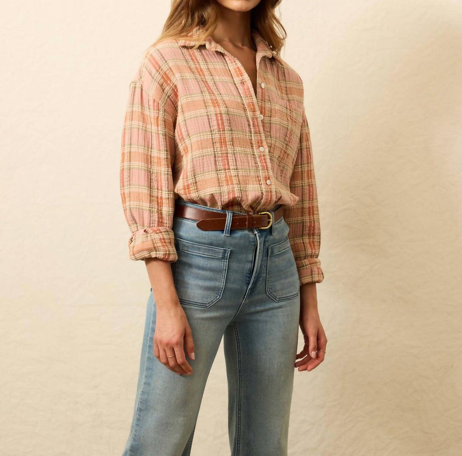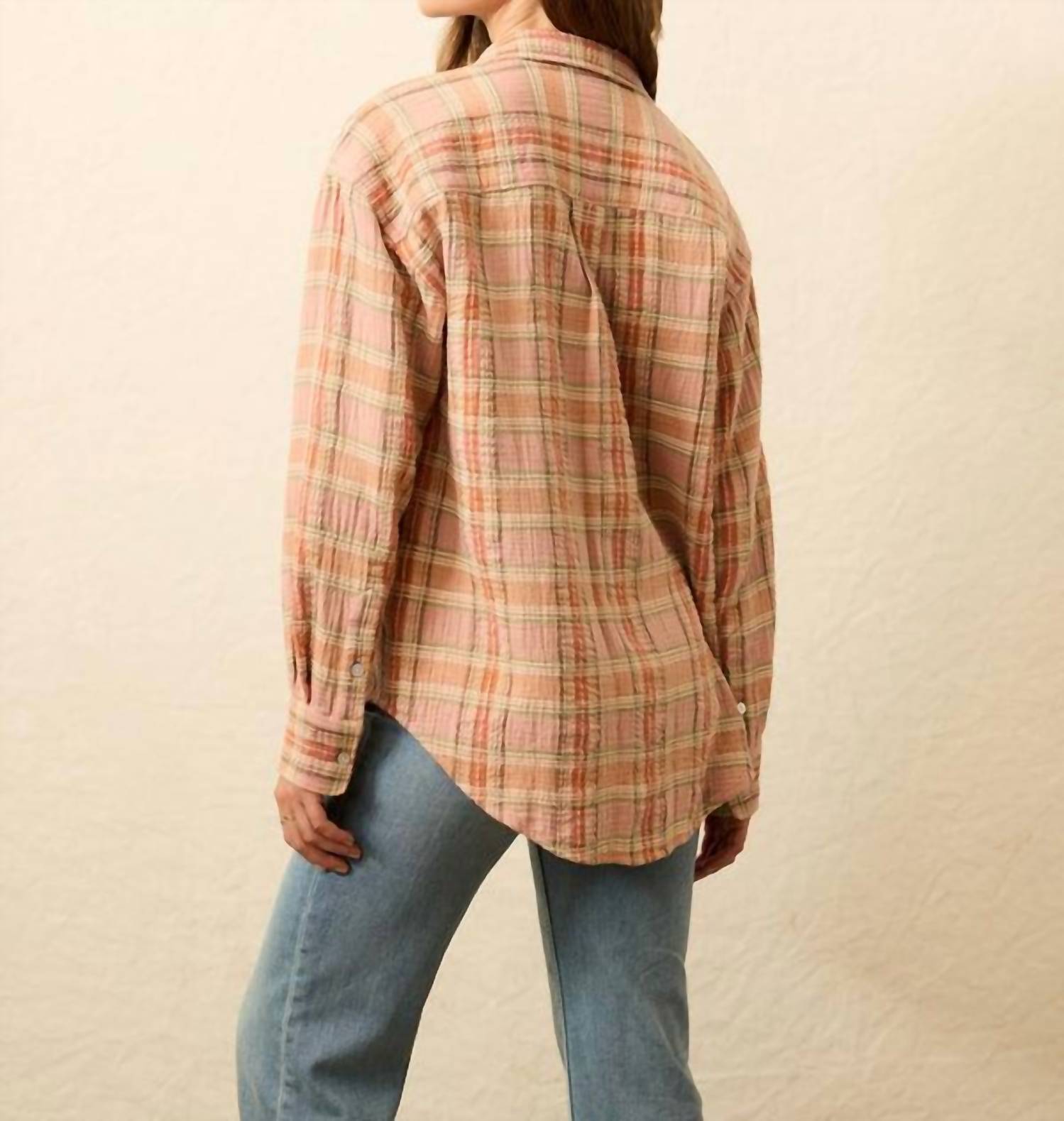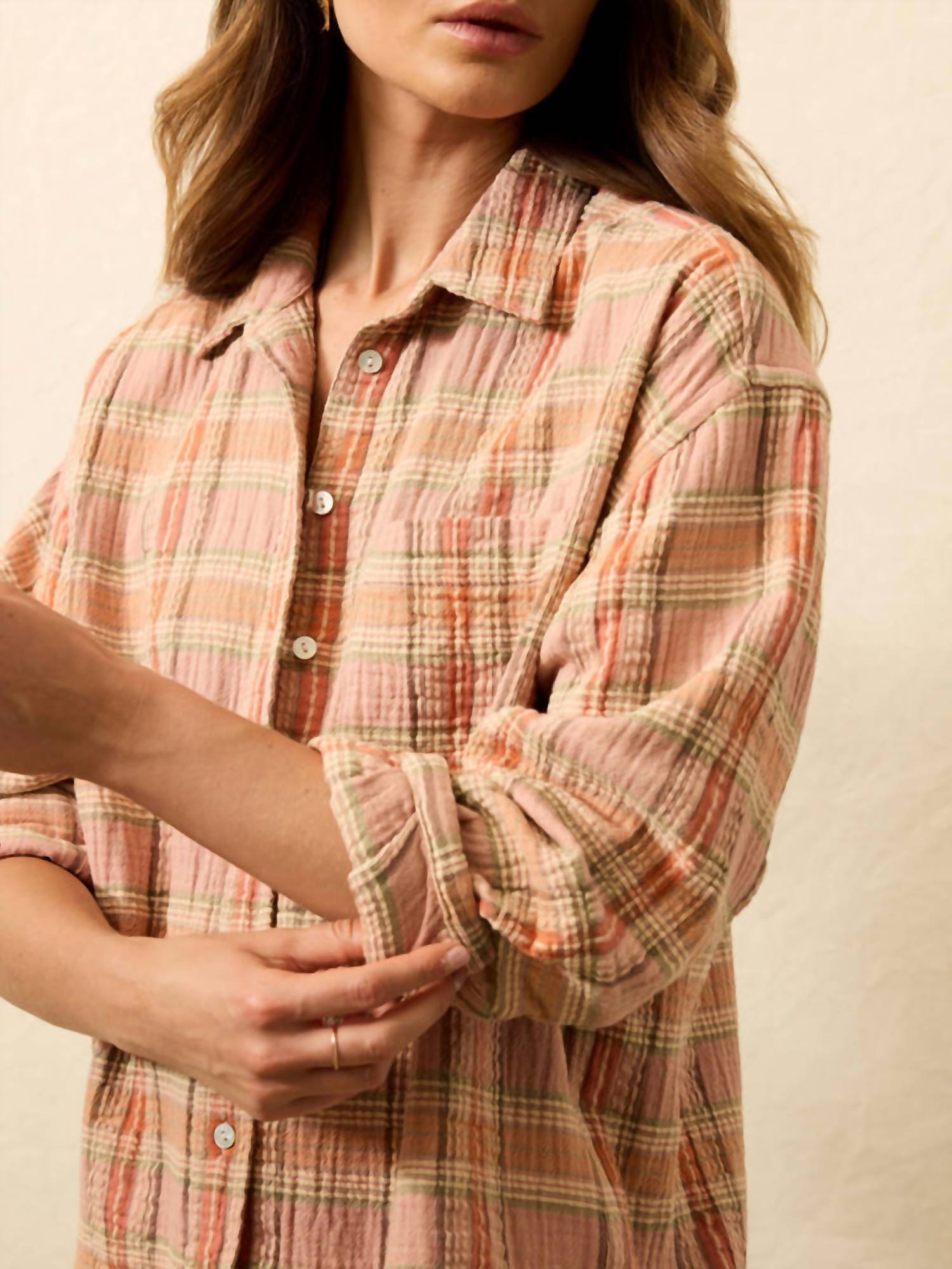 Perfectly tailored and soft to the touch. The Faherty Dune Cotton Gauze Relaxed Shirt in Tinted Rose is the perfect blend of style and comfort with its long sleeves and plaid check pattern. This women's button-down features a collar neckline and is crafted for laid-back elegance with a relaxed fit. Closure: Button closure. Care instructions: Machine wash and tumble dry. Ideal for any spring occasion.