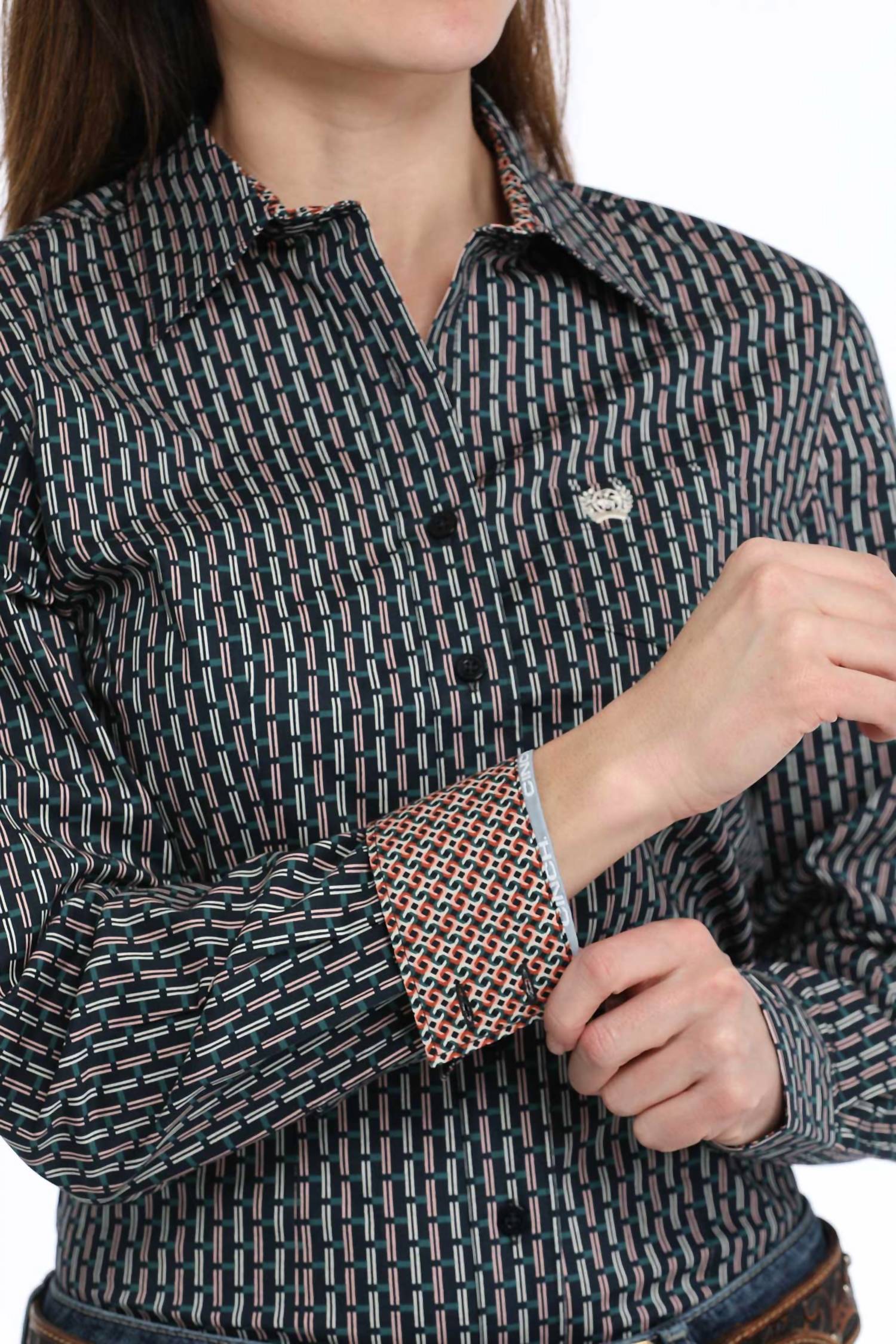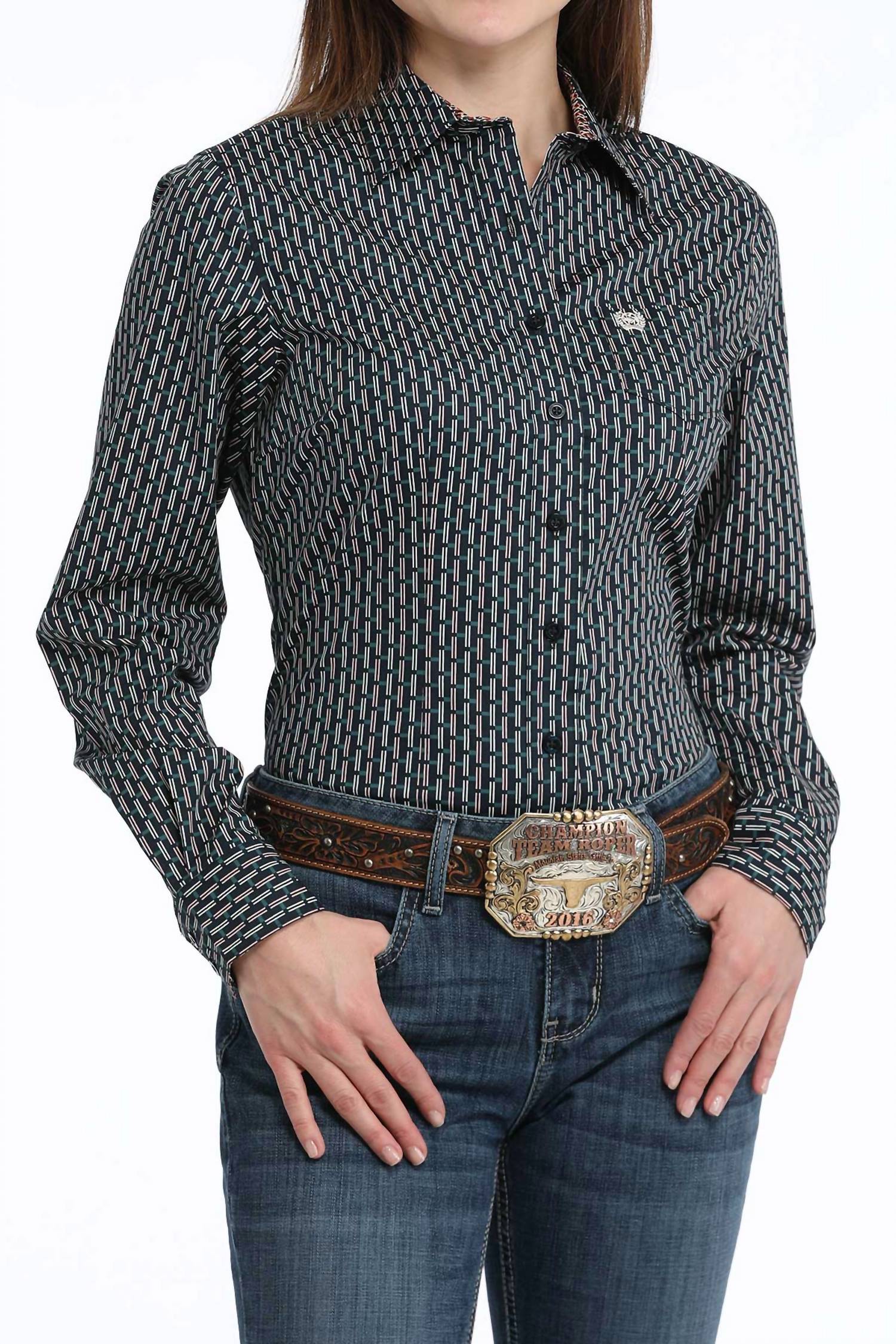 A classic button down shirt that will never go out of style. Add a touch of flair to your spring wardrobe with the Women's Long Sleeve Print Shirt by CINCH, perfect for holiday parties. Featuring a patterned navy design, this button-down shirt effortlessly blends style and function. With a classic collar neckline and convenient pockets, it's an ideal choice for versatile wear. Closure: Button closure.
