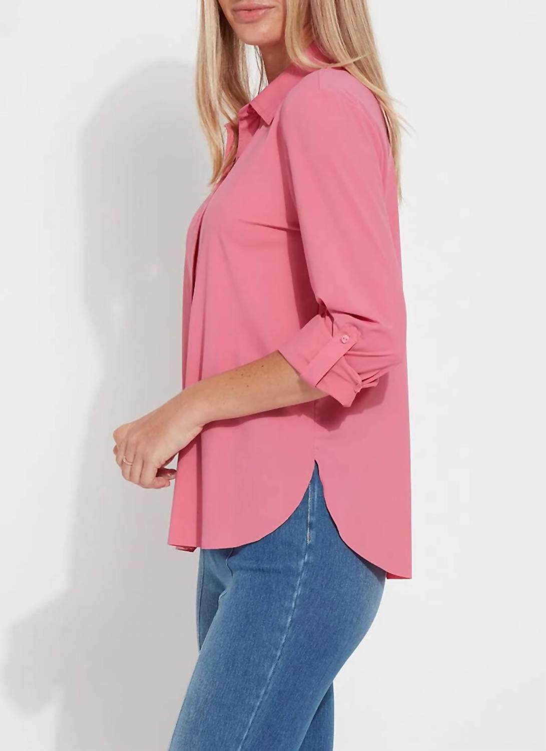 Perfectly tailored and soft to the touch. Discover the Lysse Roll Tab Connie Button Down Shirt in a striking Coral Rose, an essential for any spring workwear wardrobe. This shirt, tailored with long roll-tab sleeves and a classic collar neckline, is crafted from 75% polyester and 25% elastane microfiber, providing 4-way stretch for all-day comfort. Designed with a slimmer fit and a hip-length curved hem, it is perfect for evening events and stylish enough for Valentine's Day. Made for easy care, simply machine wash and line dry; closure is a convenient button closure.