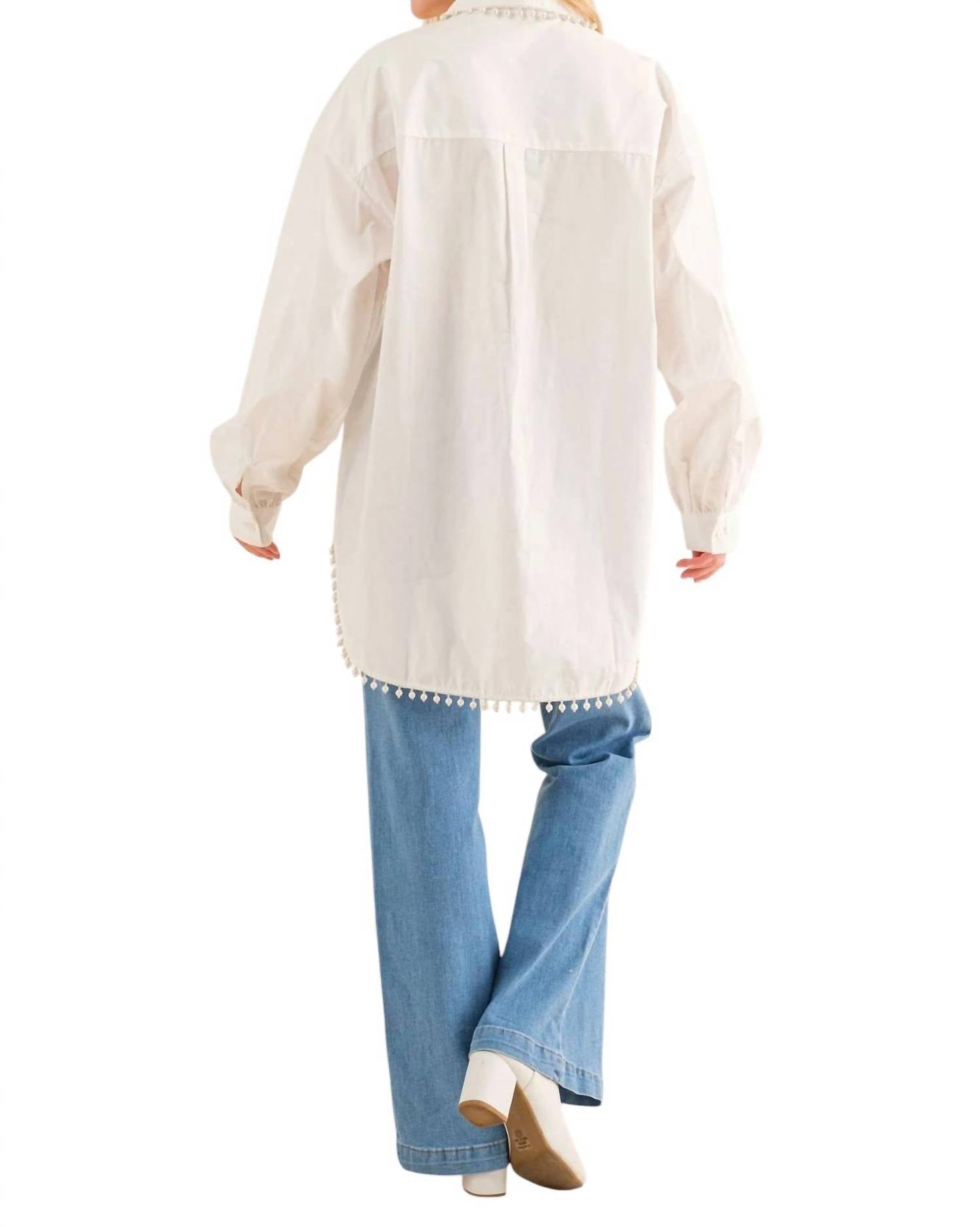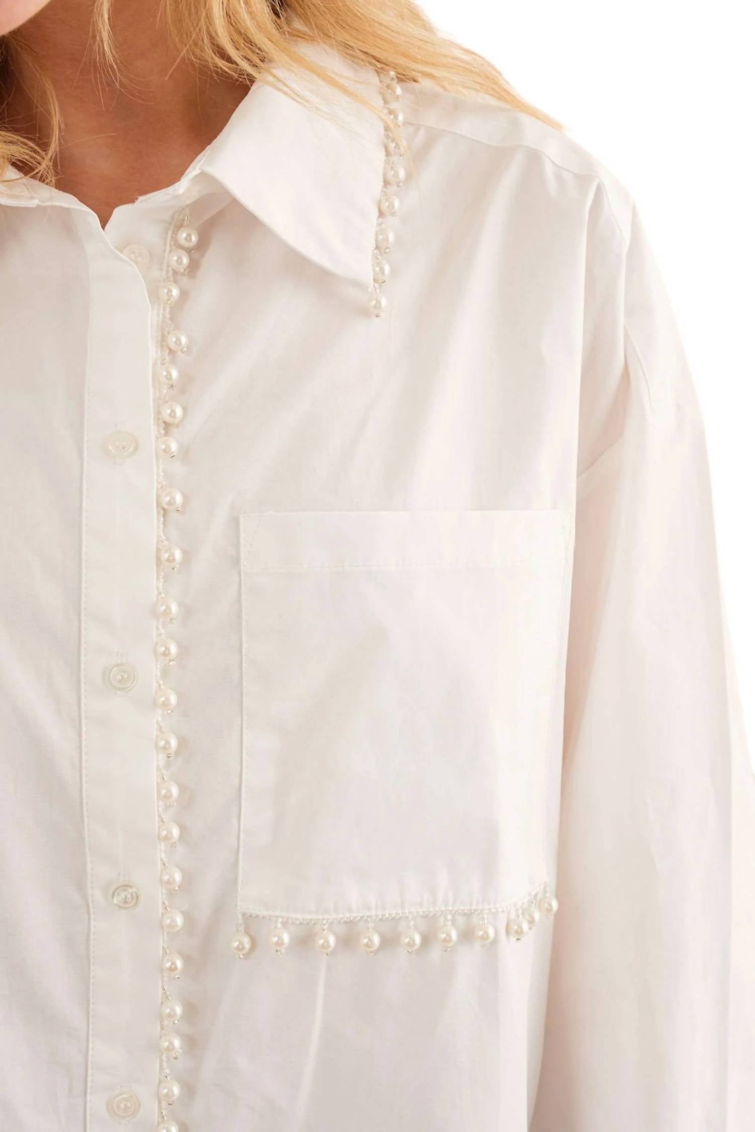This oversized button-down shirt features long sleeves, a collared neck, and a chest pocket. It has a hi-low hem, and pearl trim accents. Made from 65% Polyester and 35% Cotton.