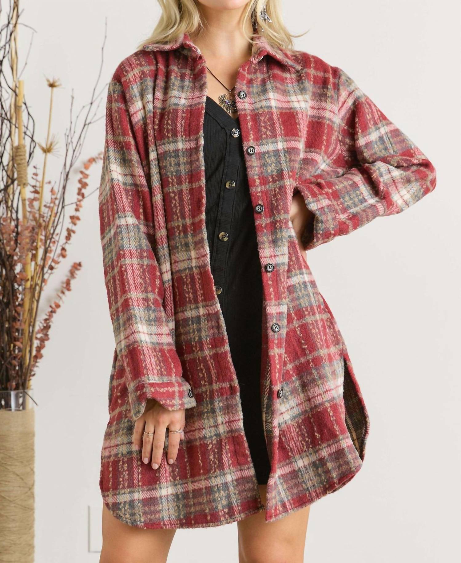 This button down shirt is comfortable yet polished. Unveil effortless style with the ADORA Button Down Flannel Shacket in a rich burgundy hue, designed for the bold maximalist. This women's long sleeve shacket is crafted from 100% polyester, featuring a classic plaid and check pattern that's ideal for fall travel occasions or everyday casual wear. Made in China, it provides warmth and comfort with a button closure and stylish collar neckline. Care for this piece by hand washing to maintain its quality and longevity; a perfect addition to your festive wardrobe with its Christmas-inspired palette.
