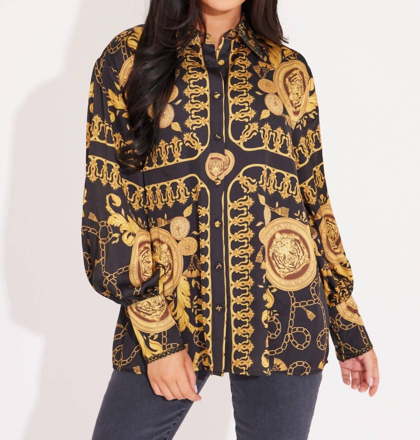 A classic button down shirt that will never go out of style. Elevate your wardrobe with the Sadie Top by Alden Adair in a chic Donatello color, perfect for those feminine touches. This button-up shirt features long sleeves and a scalloped trim detail on the sleeves, pocket, and collar. Made from 100% Polyester, it is crafted in China with a convenient button closure. Care instructions recommend machine wash cold and tumble dry low.