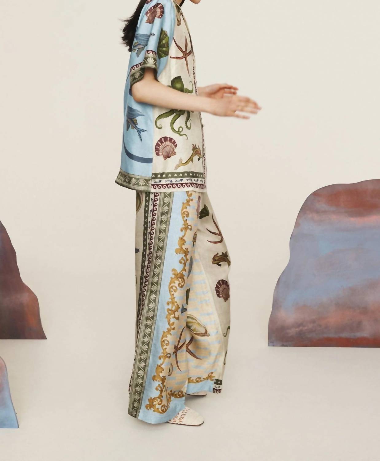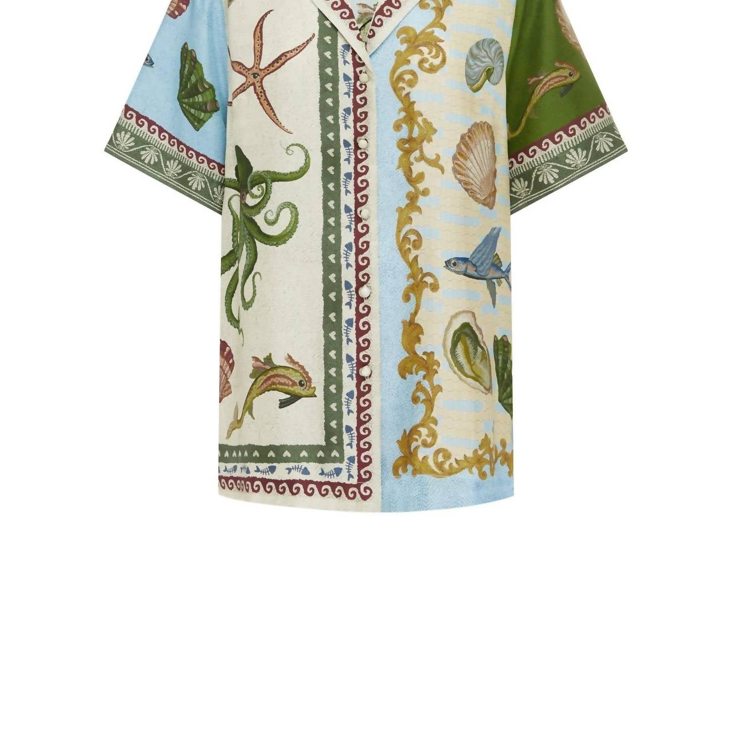 A classic button down shirt that will never go out of style. Elevate your wardrobe with the Bath House Silk Shirt by ALEMAIS, perfect for any holiday party this spring. Crafted from 100% silk twill, this short-sleeve shirt showcases a relaxed silhouette with a graphic pattern in a vibrant multi-color design. It features a point collar and self-covered button closure for a polished finish. With fine attention to detail, this shirt epitomizes luxurious comfort and style tailored for women.