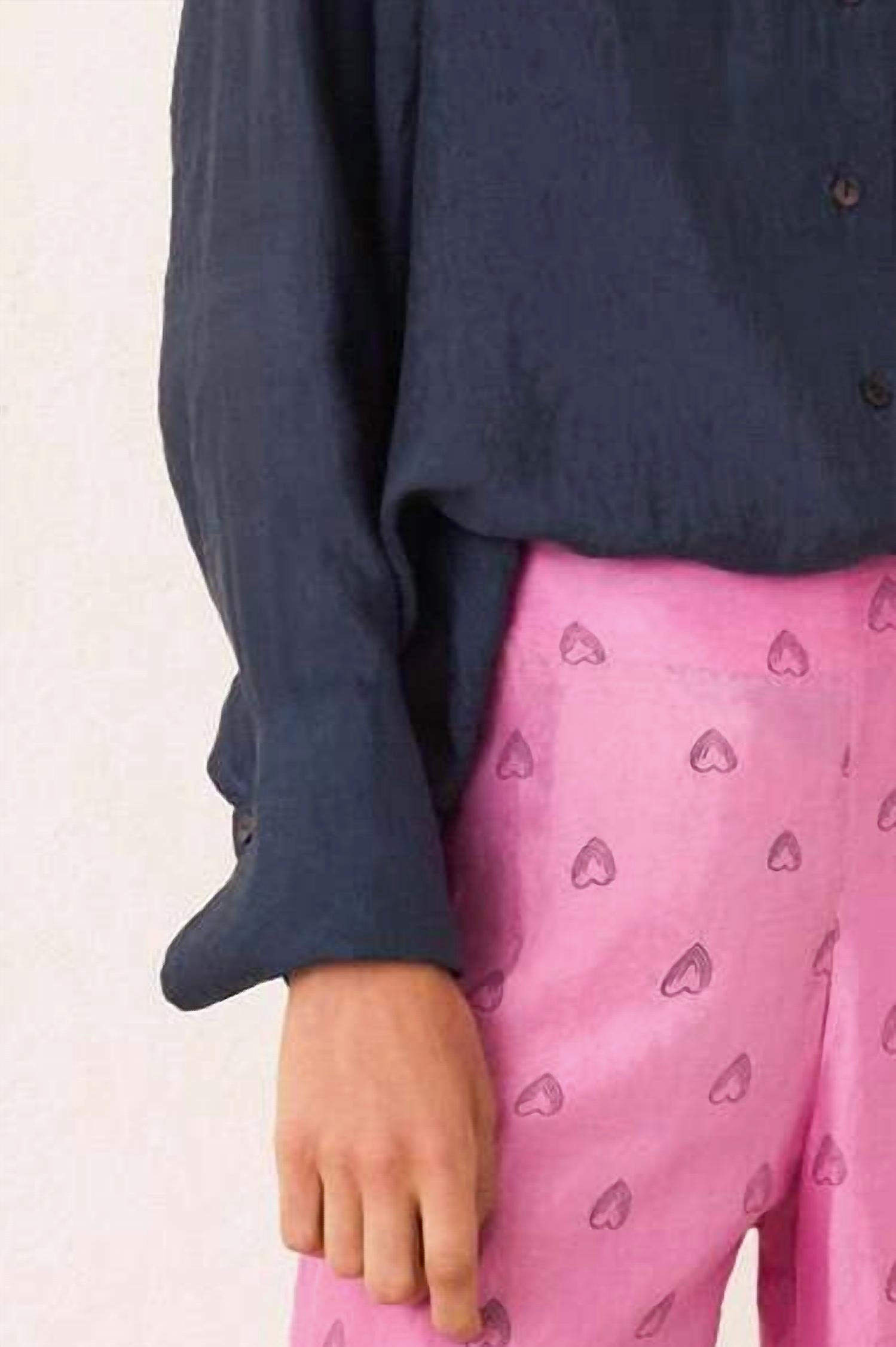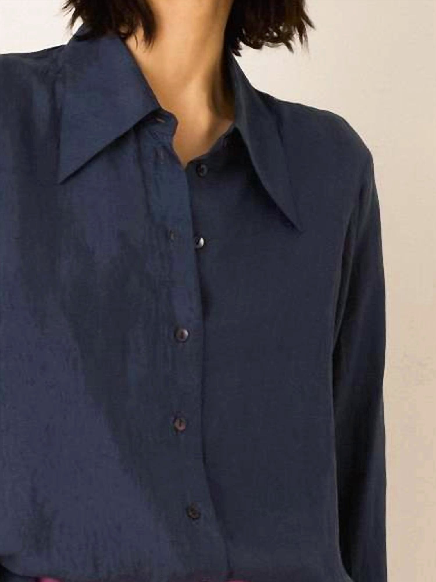 Perfectly tailored and soft to the touch. Meet the Dana Silk Shirt by Alix of Bohemia in an alluring Midnight hue, a minimalist masterpiece for your spring wardrobe. This button-down shirt boasts long sleeves and is crafted from 100% silk, exuding a glossy lustrous finish complemented by an elongated point collar and double cuffs. Closure: Secure with buttons through the front. Care instructions recommend dry cleaning to maintain its elegance.