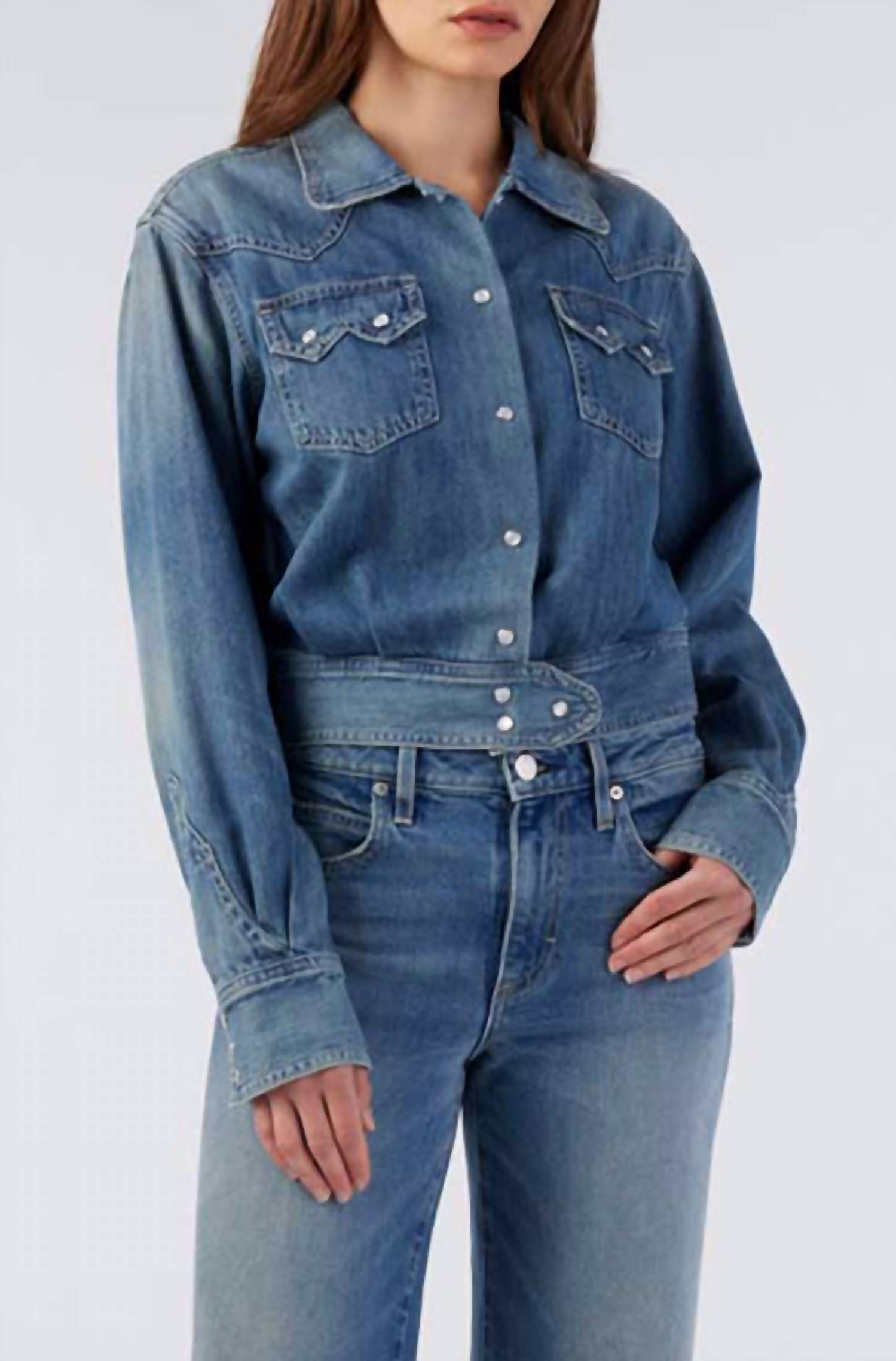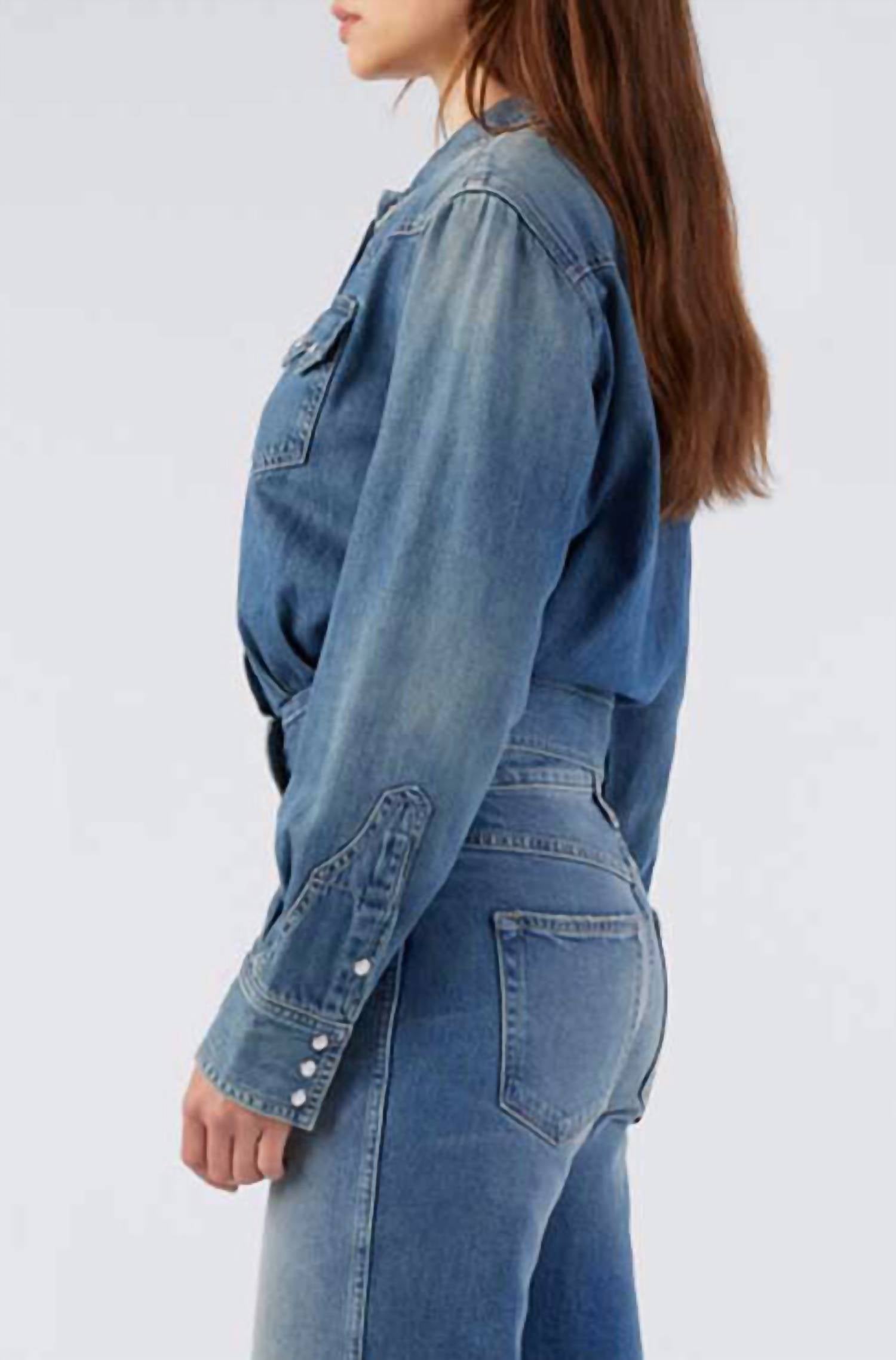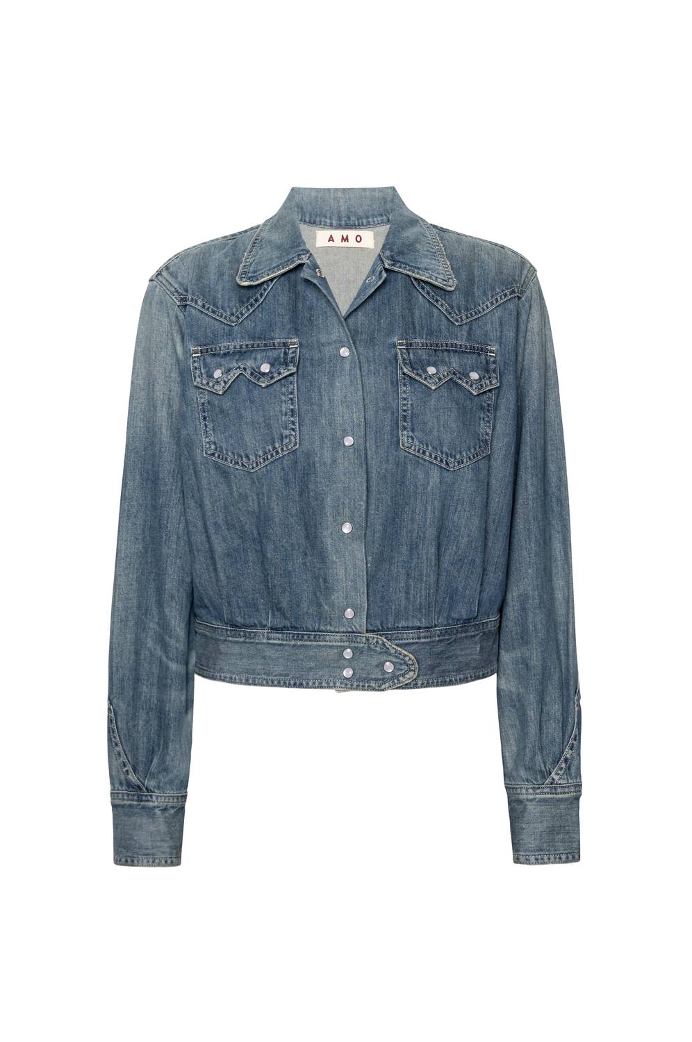 Perfectly tailored and soft to the touch. Discover the Alexis Shirt by AMO, a vintage-inspired piece that doubles as a top or jacket in timeless Immortal. With long sleeves and a cropped length of 20.75 inches, it's expertly crafted in the USA from 100% cotton for a solid, preppy look. Complete with front patch pockets and a pearl snap closure at the collar, it offers both style and functionality. Machine wash cold for effortless care. Model Yara, standing at 5'9", wears a size small with a chest measurement of 44.75 inches.