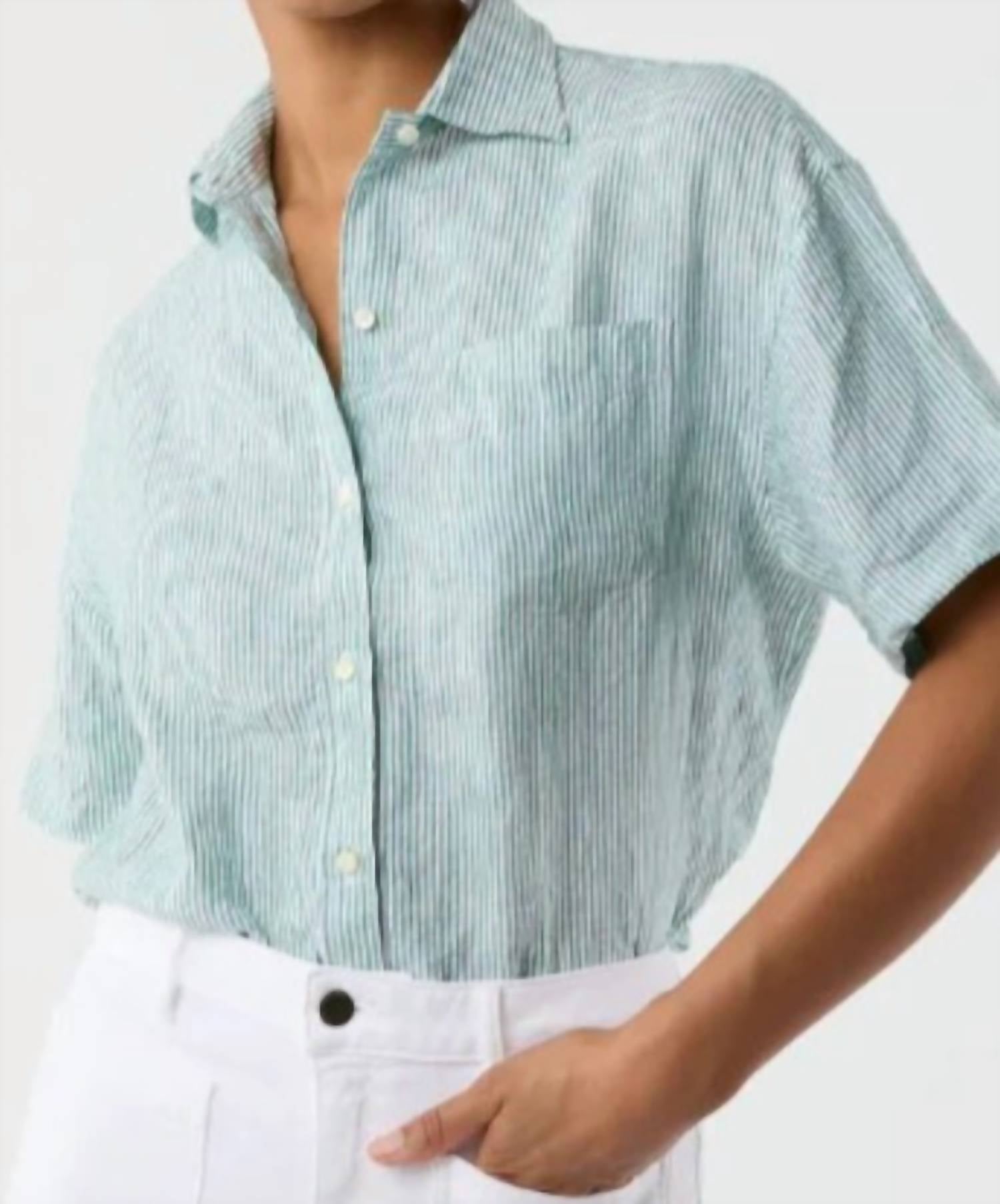 Perfectly tailored and soft to the touch. Meet the Agnes Stripe Shirt by Ann Mashburn, a minimalist masterpiece for women's spring style. This green and white button-down features easy-fitting short sleeves, a classic point collar, and a charming striped pattern. Crafted with Trocas shell buttons, it includes practical pockets and is garment-washed for an invitingly broken-in feel. Closure: Button closure. Care: Machine wash and line dry. Perfect for casual engagements and beyond.