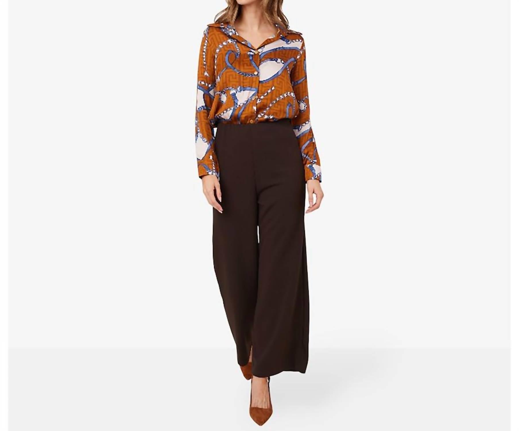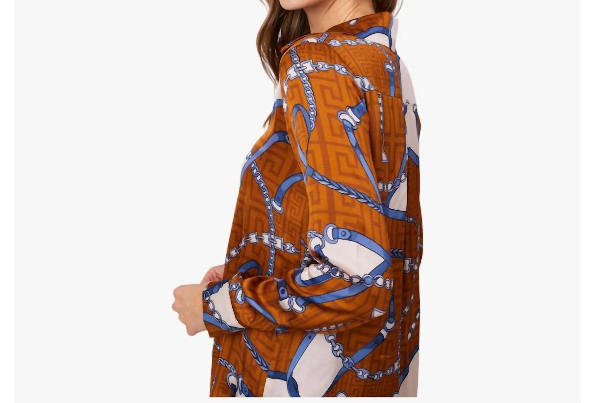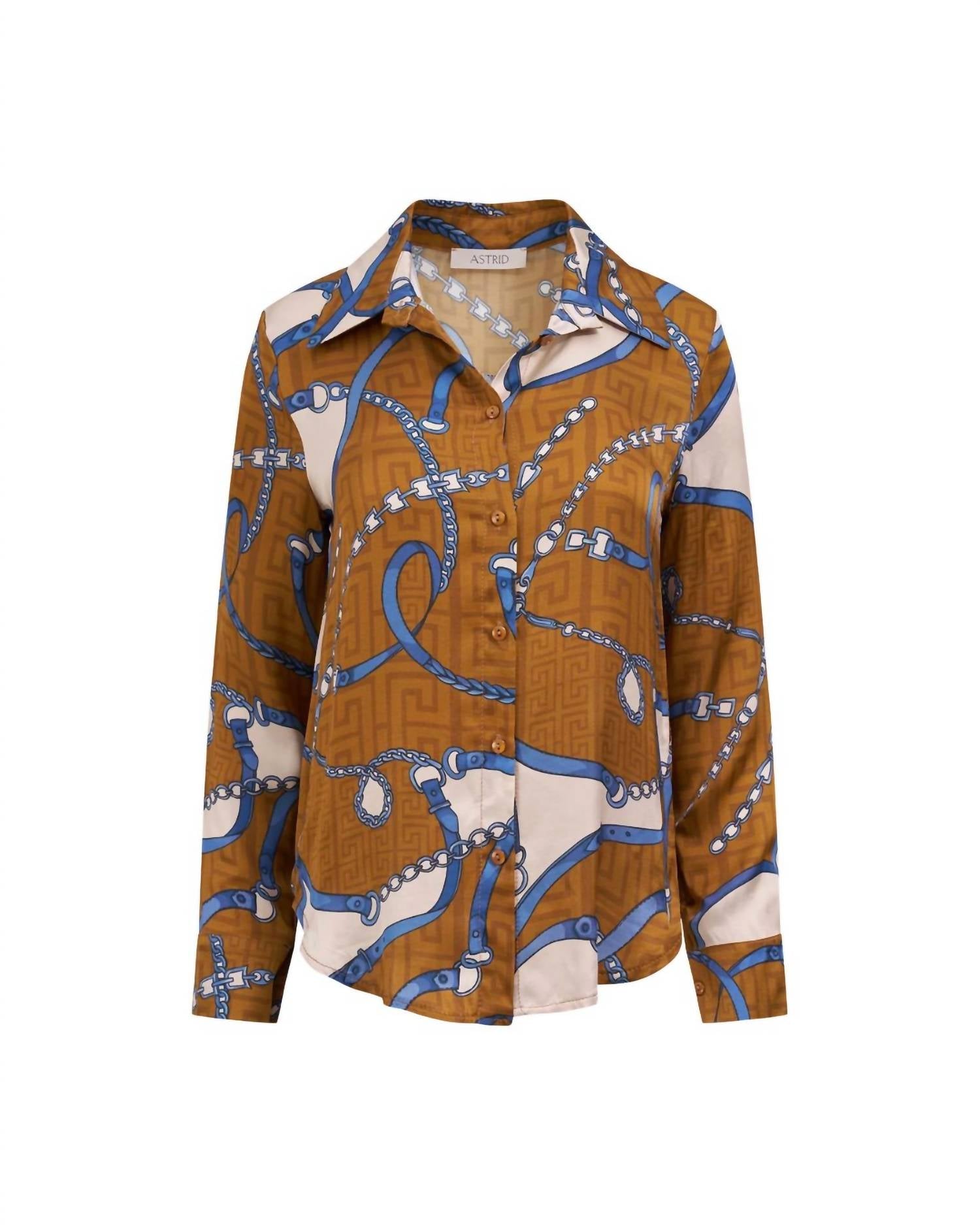 A classic button down shirt that will never go out of style. Introducing the Chain Button Down Blouse by ASTRID, an elegant choice for workwear or special occasions. This long sleeve blouse, crafted in 100% viscose, offers a relaxed fit in a Tobacco Hermes hue. Made in China, it features a button closure with a classic collar for a sophisticated look. For care, hand wash or machine wash in cold water is recommended, with a cool iron setting; lay flat to dry for best results.