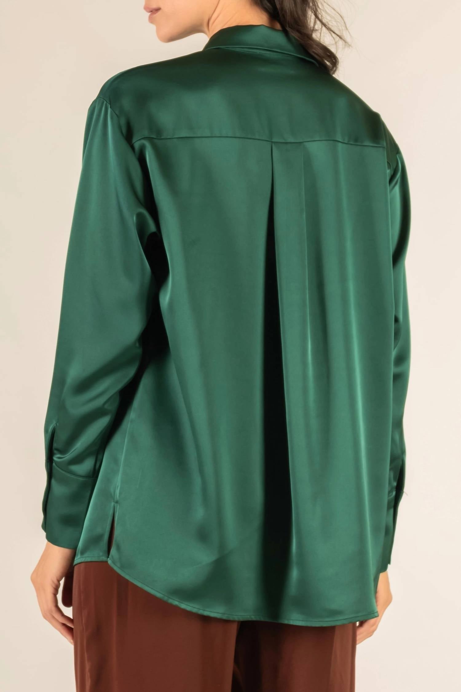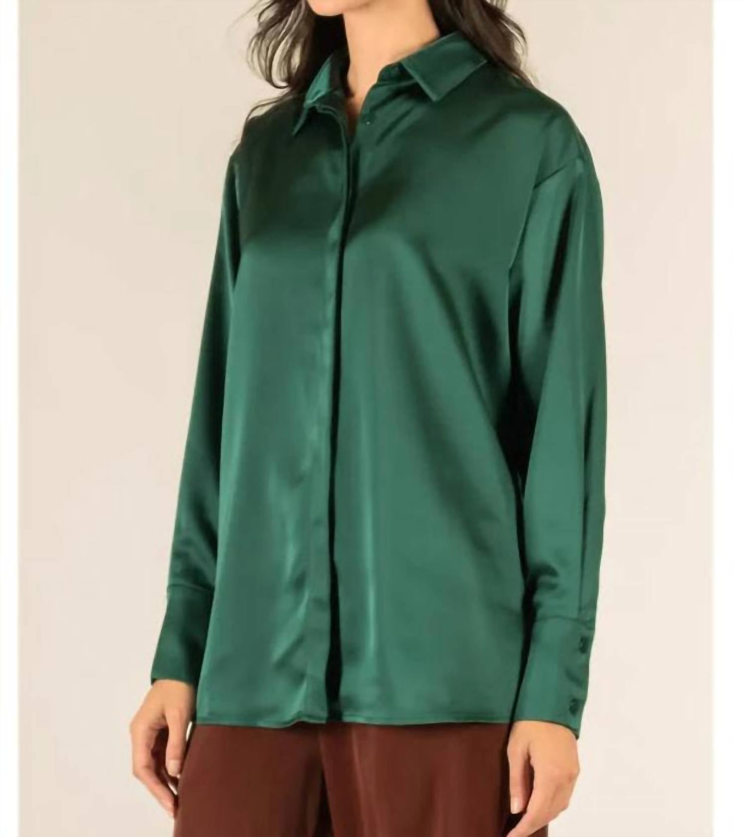 A classic button down shirt that will never go out of style. Introducing the Satin Placket Cover Button Up Shirt by Before You, a sleek and refined option for any wardrobe. Designed with long sleeves and a collared neckline, this emerald shirt is made from smooth satin, offering a subtle sheen that's perfect for both professional and off-duty looks. The concealed button placket adds a touch of elegance.