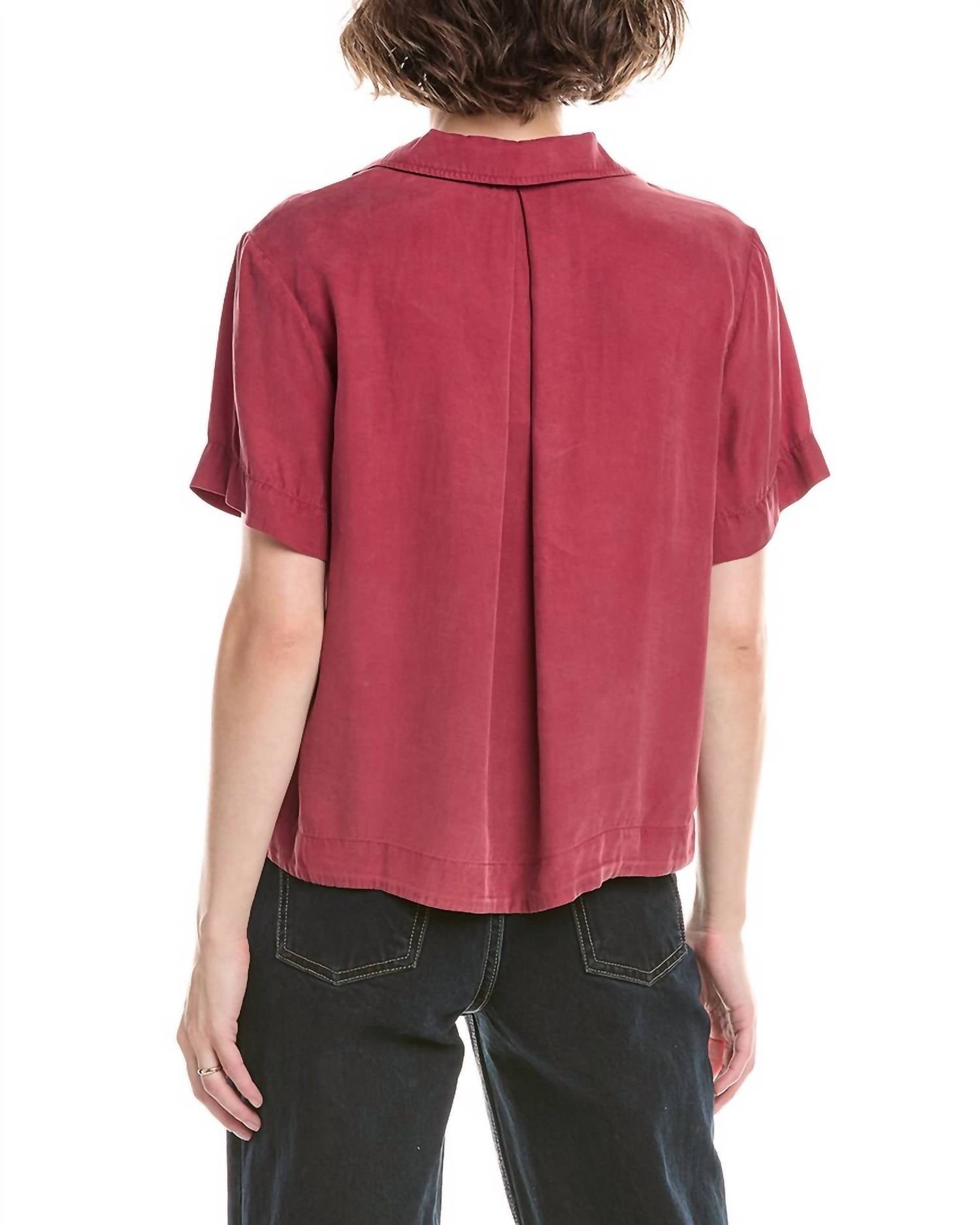 A classic button down shirt that will never go out of style. Introducing the Short Sleeve Flowy Button Shirt by Bella Dahl in a captivating Sweet Merlot hue, perfect for any back-to-school ensemble. This women's button-down shirt showcases a notch collar and straight hem, all crafted from a luxurious blend of 63% Lyocell Tencel and 37% Tencel Lyocell. Designed with short sleeves for a relaxed, chic look, this solid button-up offers both comfort and ease with its machine washable fabric. Closure: Button closure.