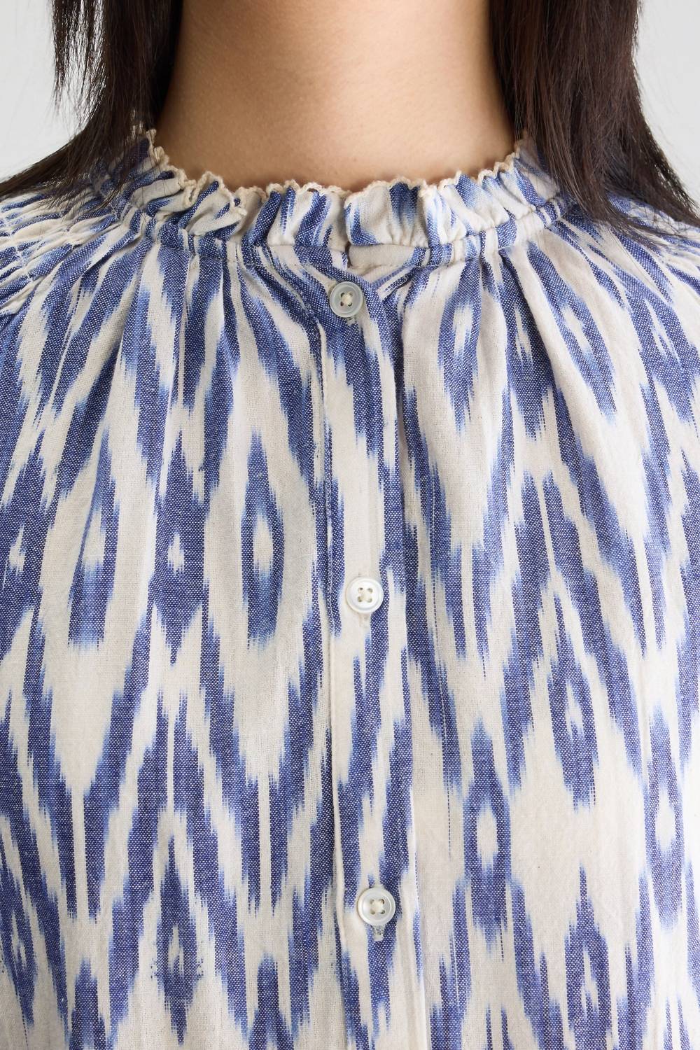 A classic button down shirt that will never go out of style. Elevate your wardrobe with the Cassis Button Down Top by Bellerose, a bold choice for those seeking a maximalist style. Featuring long raglan sleeves with smocked cuffs and a distinctive raised frilled collar, this top brings a unique touch to your vacation attire. Made from ikat cotton, it boasts smocked details on the shoulders and a high-low curved hem. Closure: Button closure. Care: Hand wash and line dry.