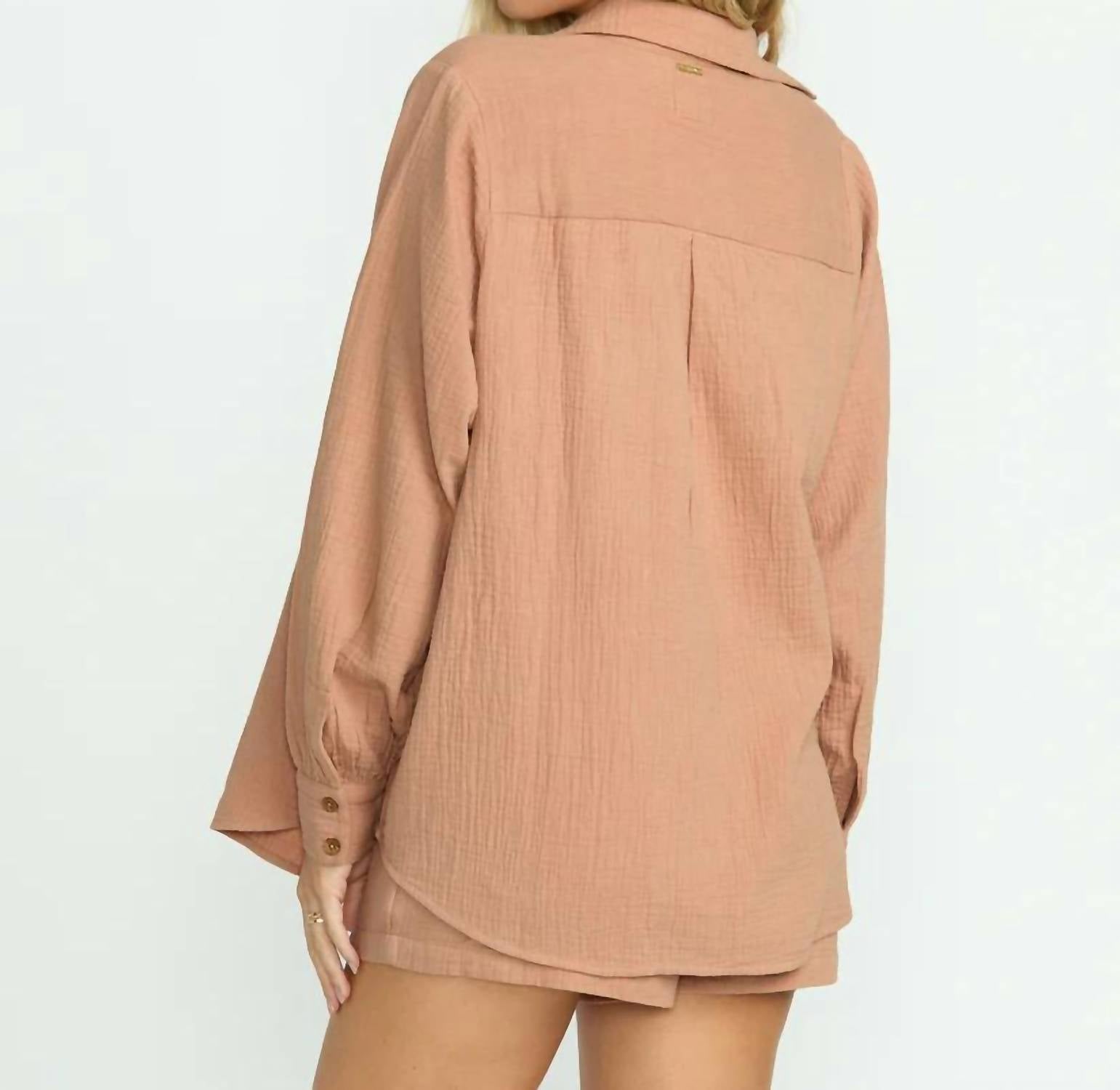 Perfectly tailored and soft to the touch. Elevate your wardrobe with the Billabong Sweet Swell Long Sleeve Shirt in Rose Brown, a stylish addition that's part of the Essentials collection. This women's shirt showcases a relaxed fit with a collar neck and long sleeves, crafted from 100% cotton double gauze fabric for a lightweight feel perfect for the season. Featuring a front button closure and practical chest pockets, this piece pairs classic design with modern functionality. Effortlessly maintain its crisp look with machine wash care and tumble dry instructions.