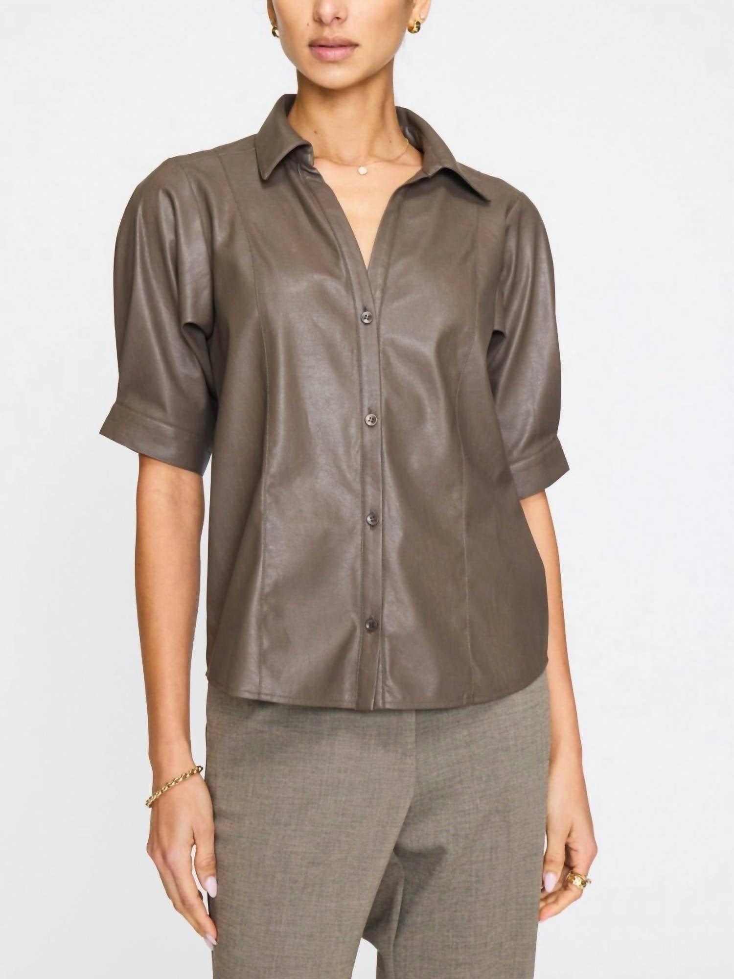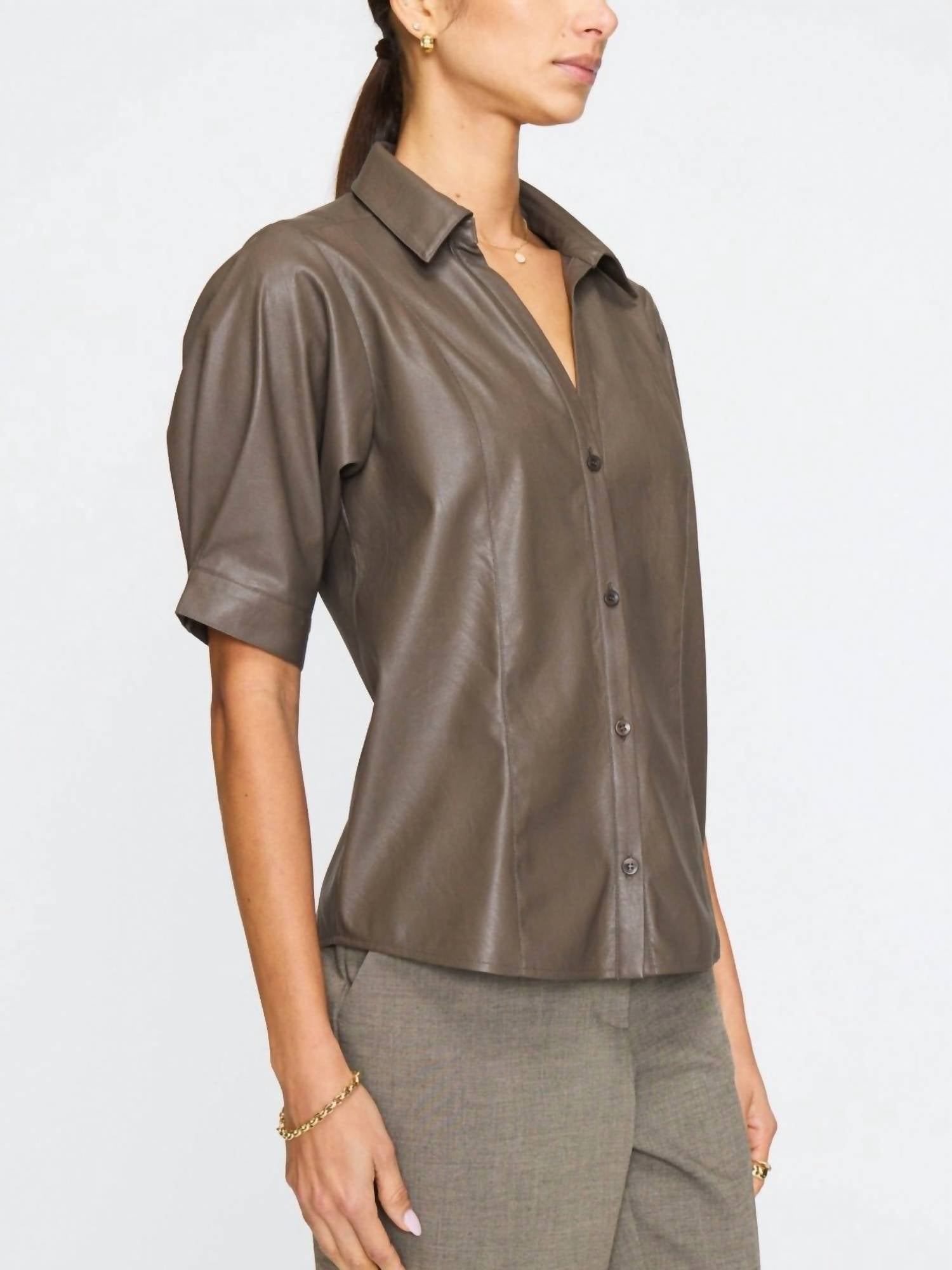 This button down shirt is comfortable yet polished. Elevate your style with the Max Puff Sleeve Shirt by Brochu Walker, tailored for sophistication in a rich Tanner hue. This women's button-down shirt features short sleeves and a classic collar, complemented by princess seams for a flattering silhouette. Crafted from 87% Polyester and 13% Polyurethane, this imported piece offers a minimalist look with no pockets and button-closed cuffs. Closure: Button front placket. Ideal for fall engagements, this solid pattern shirt captures the essence of minimalist chic.