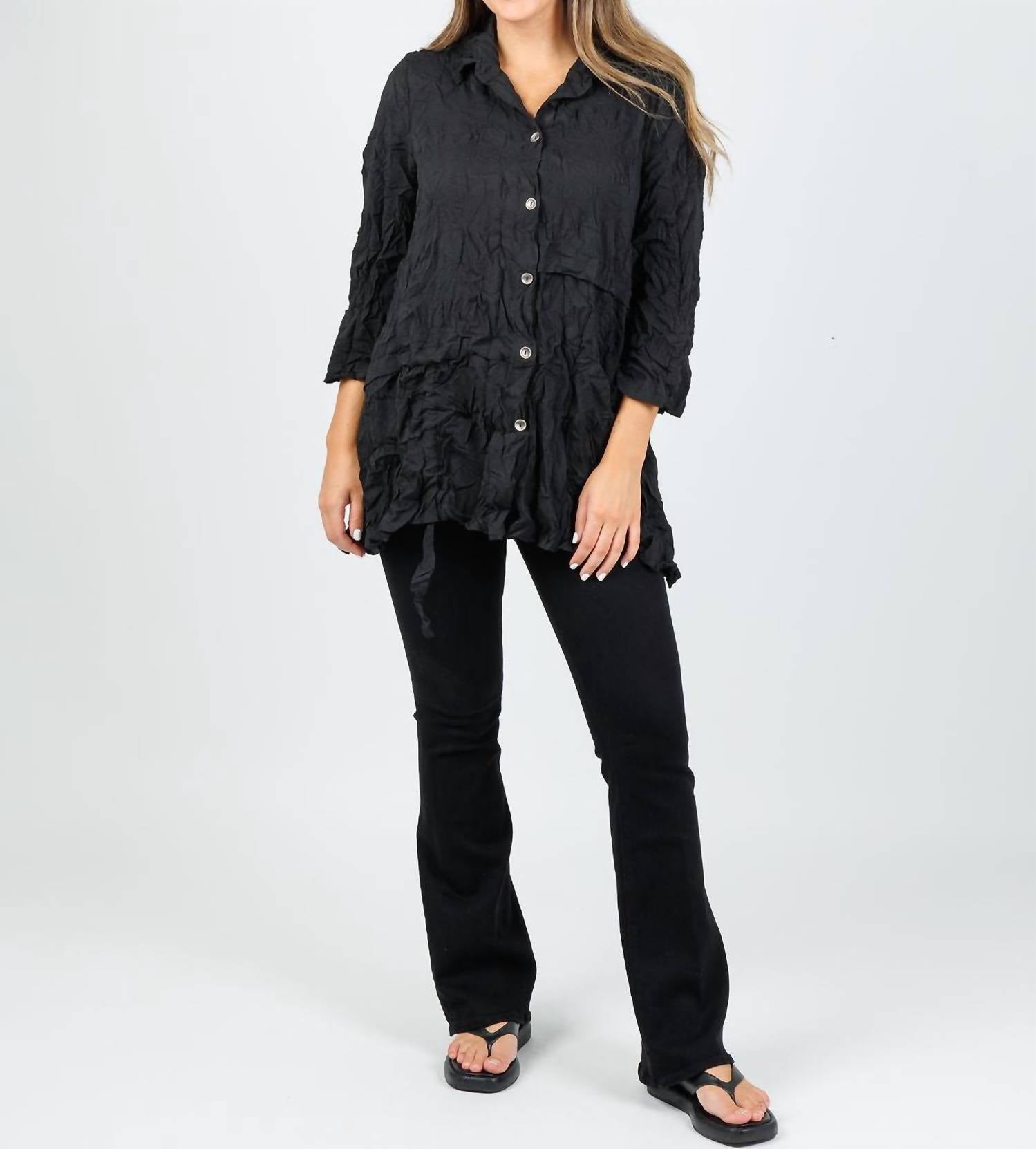 A classic button down shirt that will never go out of style. Elevate your style with the Inez 3/4 Sleeve Shirt by Chalet et Ceci, a modern take on the classic button-down. Crafted from a 99% polyester and 1% spandex blend, this black shirt features a relaxed silhouette with a subtle high-low hem, perfect for effortless layering. Designed with three-quarter sleeves and a distinctive button-front closure, it boasts tiered detailing for added dimension. Its wrinkle-resistant, lightweight, and packable nature makes it an ideal choice for travel, seamlessly transitioning from casual daywear to polished evening looks. Model is wearing a size XS (5'6" height, 34" bust, 28.5" waist, 31" hip).