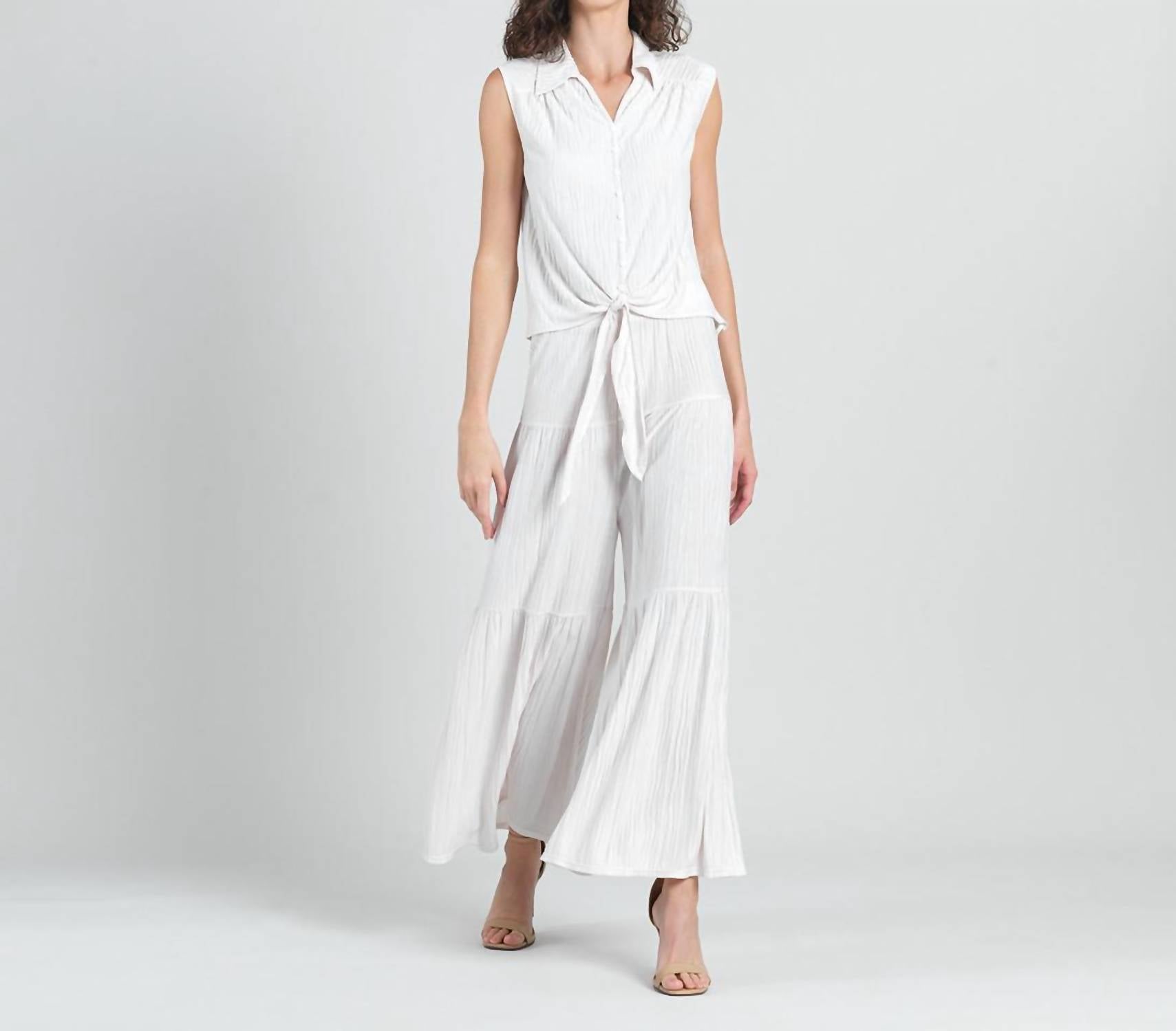 A classic button down shirt that will never go out of style. Elevate your vacation wardrobe with the Sleeveless Button Down Tie Hem Top from CLARA SUNWOO, crafted in a chic ivory shade. Designed for plus-size women, this piece boasts a textured pattern with a classic collar neckline. It features a short sleeve length, button closure, and is made from soft Rayon for a comfortable fit. For best results, hand wash this top and line dry.
