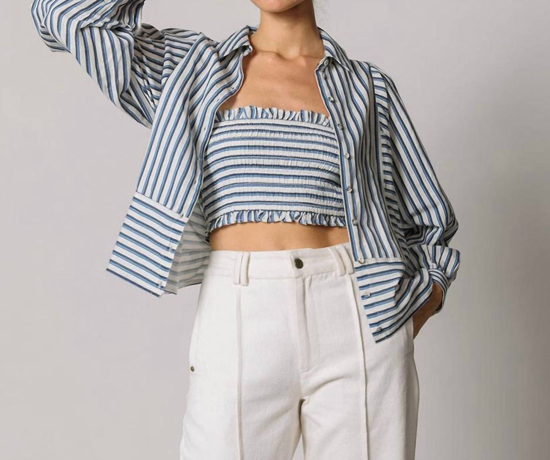 Introducing the Isadora Blouse by Cleobella, a stylish and sustainable choice for your summer wardrobe. This blue multi stripe blouse features long sleeves and a classic collar, embodying the essence of 90s fashion trends. Made from a breathable cotton blend, it is perfect for vacation wear. Closure: Button closure. Pair this with other pieces from Cleobella's collection for an effortlessly chic ensemble.