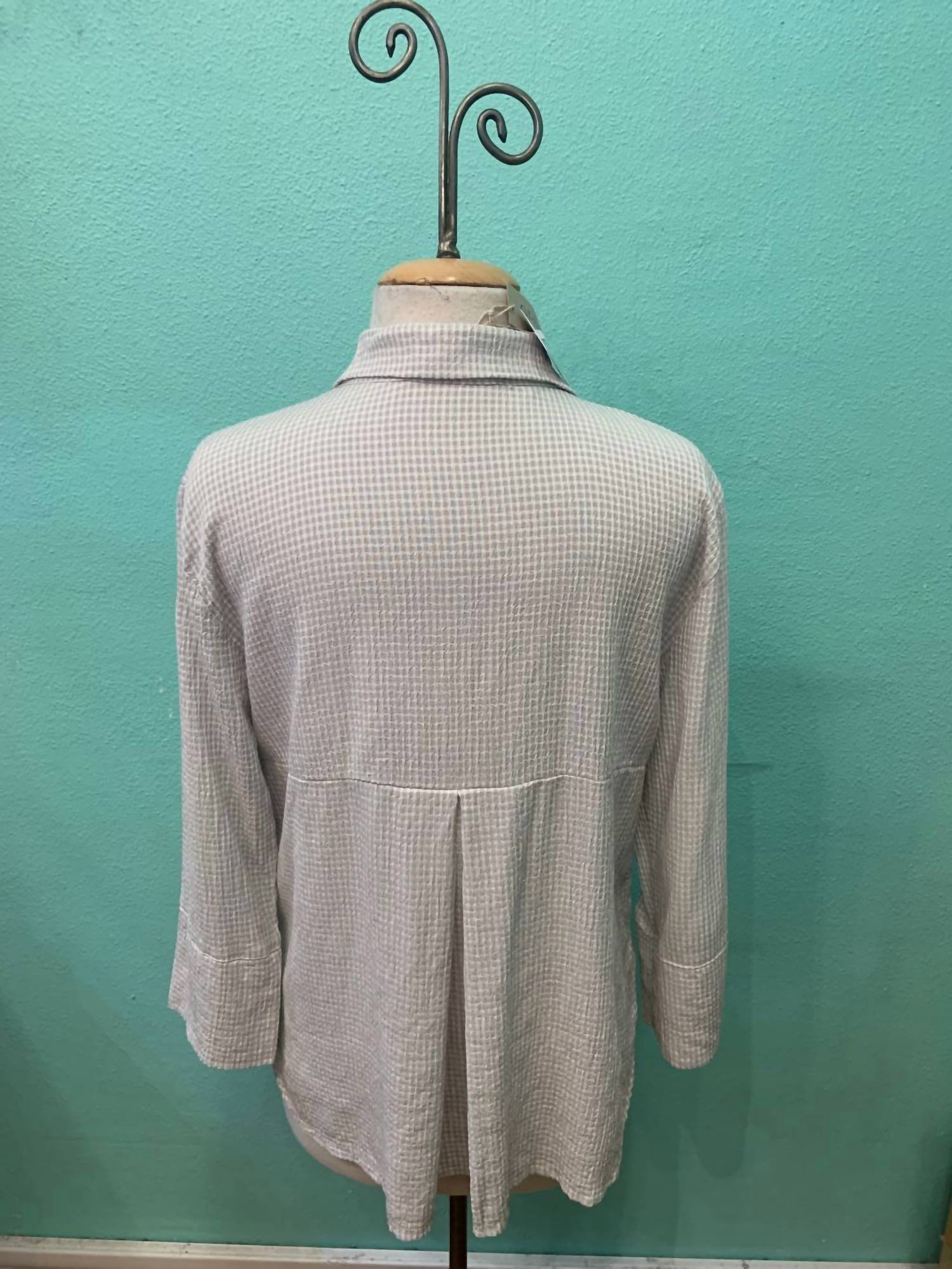 A classic button down shirt that will never go out of style. Discover the Cut Loose Women's Easy Crop Shirt in Solar, a stylish addition perfect for holiday gatherings. With its long sleeves and classic collar neckline, this piece offers comfortable elegance. Made with a crinkle check pattern, the composition blends 64% viscose and 36% poly, proudly made in San Francisco. Closure: Button closure. Care is a breeze with machine wash and options of tumble or line dry.