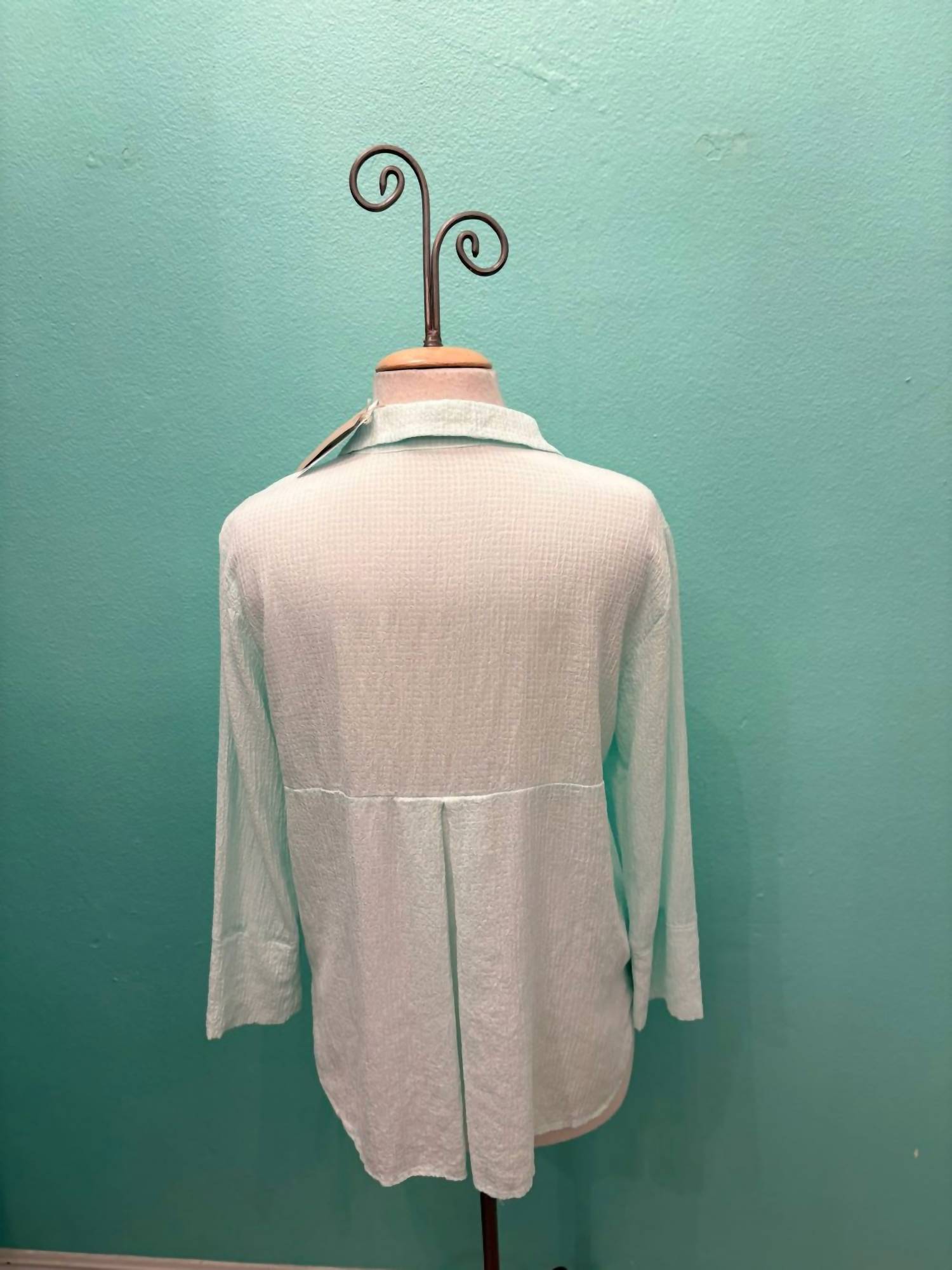 A classic button down shirt that will never go out of style. Discover the Cut Loose Women's Easy Crop Shirt in Solar, a stylish addition perfect for holiday gatherings. With its long sleeves and classic collar neckline, this piece offers comfortable elegance. Made with a crinkle check pattern, the composition blends 64% viscose and 36% poly, proudly made in San Francisco. Closure: Button closure. Care is a breeze with machine wash and options of tumble or line dry.