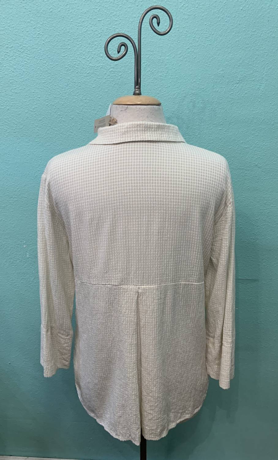 A classic button down shirt that will never go out of style. Discover the Cut Loose Women's Easy Crop Shirt in Solar, a stylish addition perfect for holiday gatherings. With its long sleeves and classic collar neckline, this piece offers comfortable elegance. Made with a crinkle check pattern, the composition blends 64% viscose and 36% poly, proudly made in San Francisco. Closure: Button closure. Care is a breeze with machine wash and options of tumble or line dry.