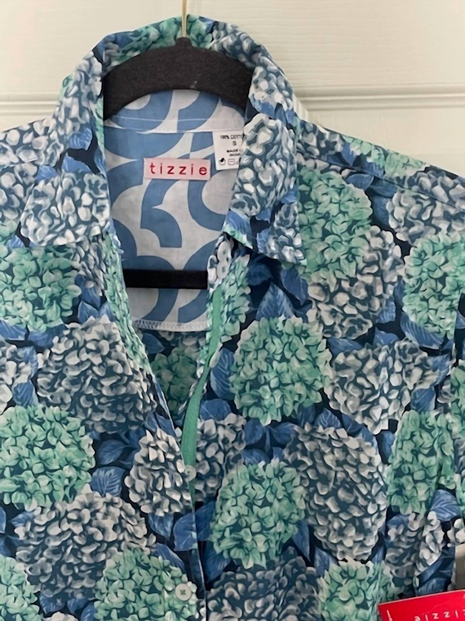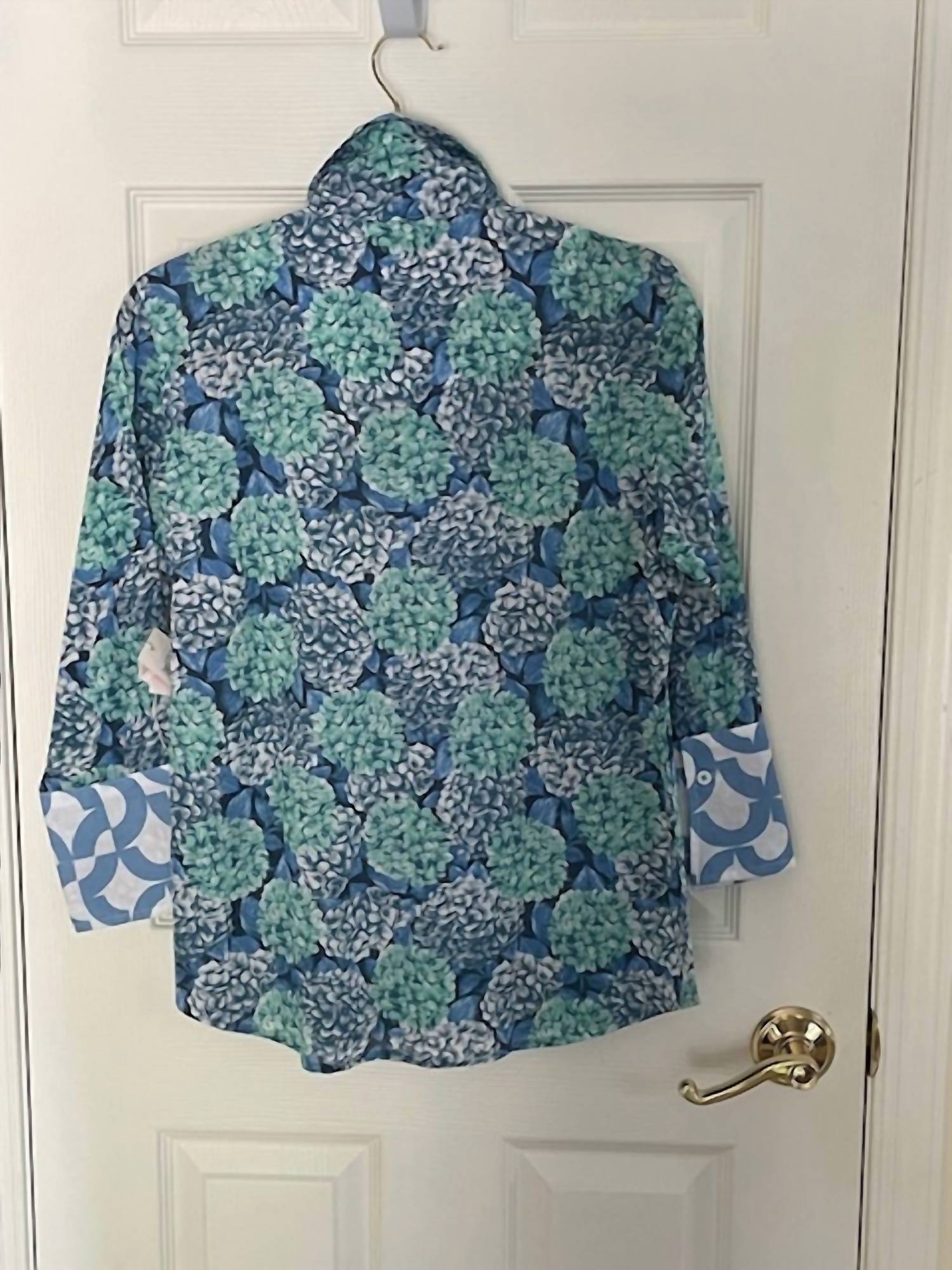 This button down shirt is comfortable yet polished. Vibrant addition to your spring wardrobe. Women's button-down shirt features three-quarter sleeves and a striking hydrangea floral pattern, accented with contrasting cuffs and collar. Crafted for travel occasions, offers a boho chic trend with a collar neckline and button closure. Care instructions recommend hand washing for optimal maintenance.