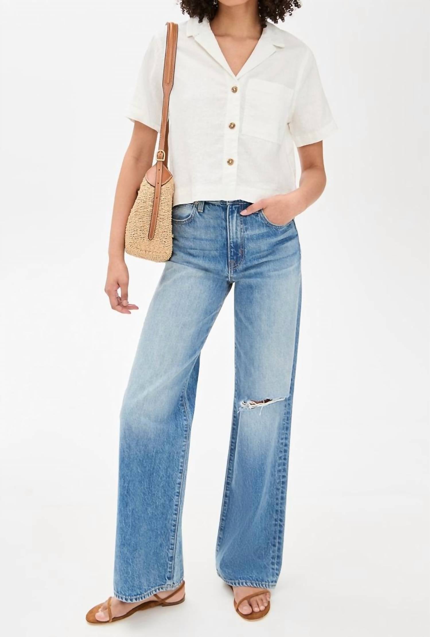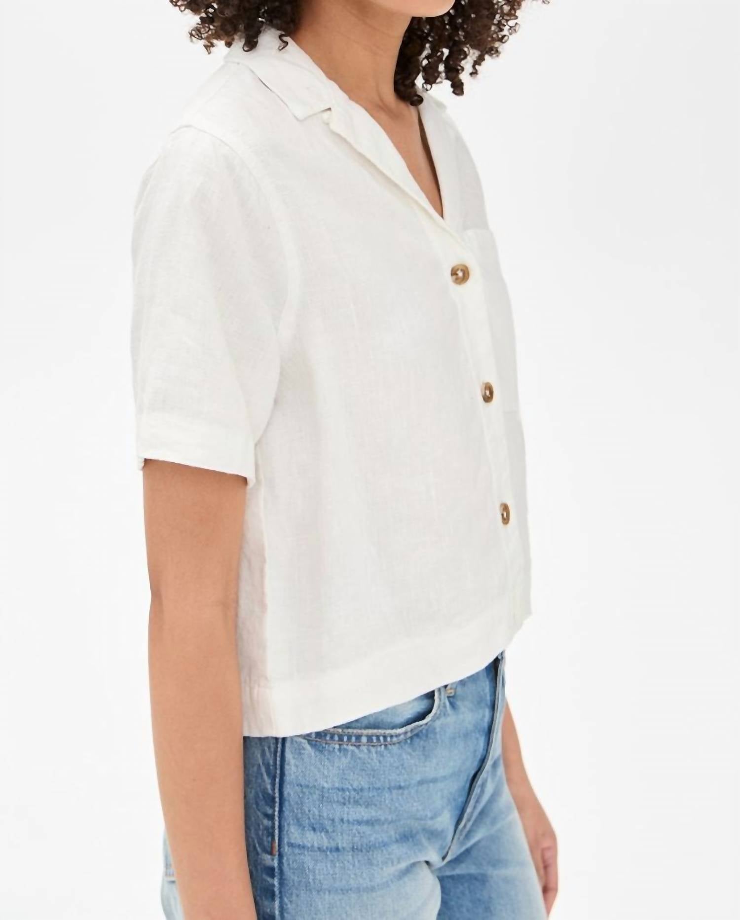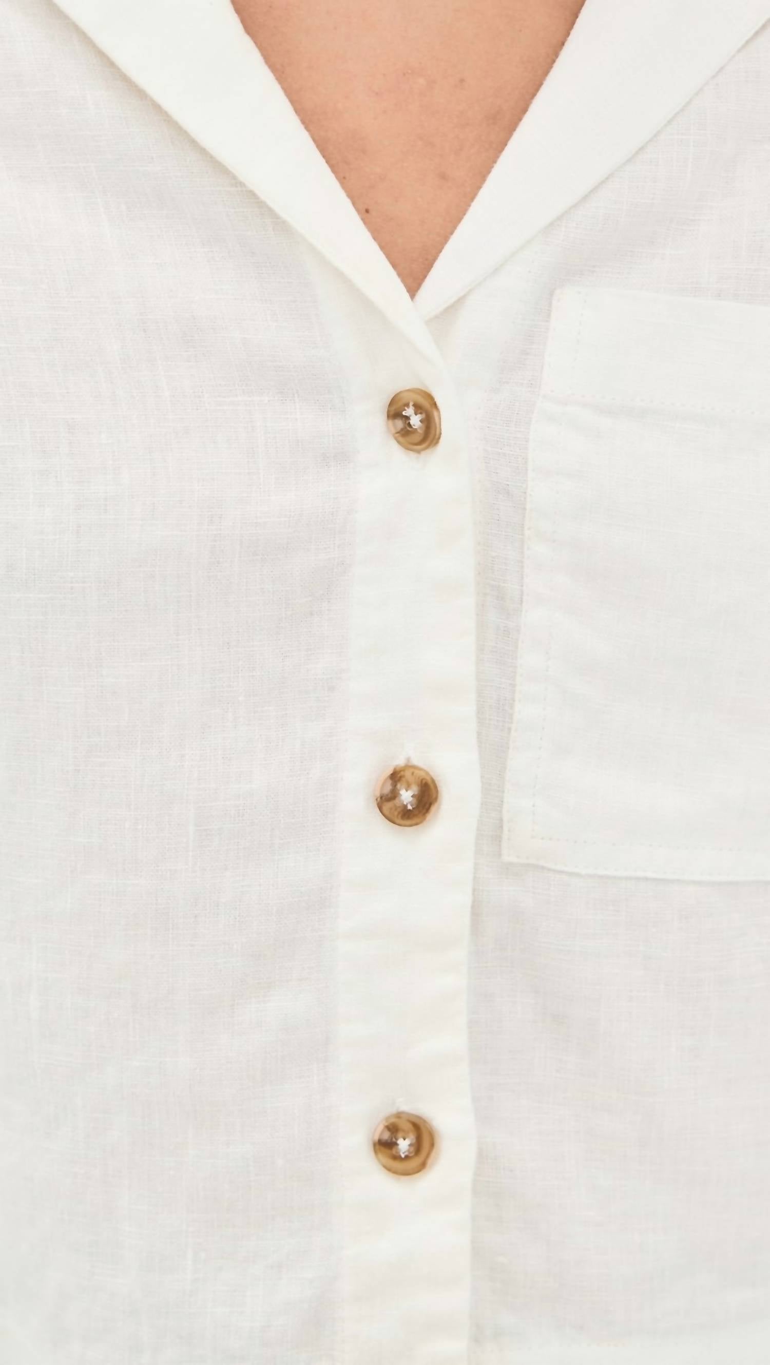 Perfectly tailored and soft to the touch. Introducing the DL1961 Hampton Linen Shirt, a crisp and cool choice for your sophisticated wardrobe. This short-sleeve piece is made from 100% linen, promising breezy comfort and effortless style. The cropped shirt features a classic button closure, contrasting brown buttons, and comes in a chic white linen hue. Care: Machine wash. With a length of 21 inches and a 40-inch chest circumference, it offers a relaxed yet polished fit for those warm spring days.