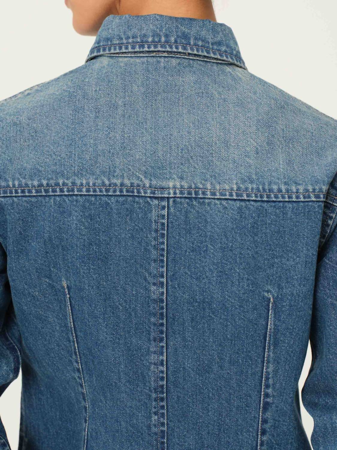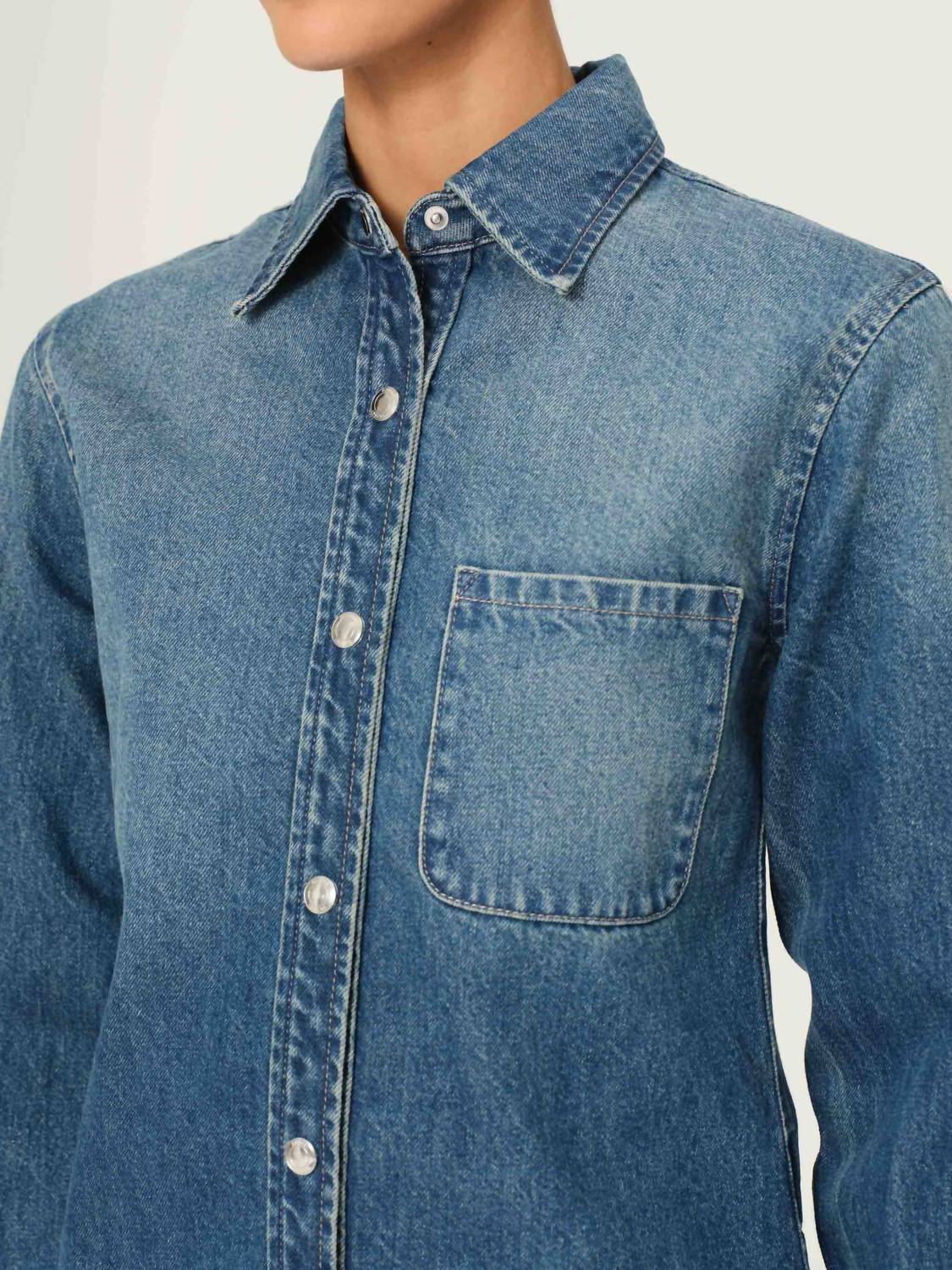 Perfectly tailored and soft to the touch. Embodiment of contemporary streetwear in a deep mid-indigo Seagate wash. This women's button-down shirt features long sleeves, a point collar, and a stylish rounded hem, showcasing shiny silver hardware with light khaki stitching for a polished finish. Button Closure. Machine wash and tumble dry.