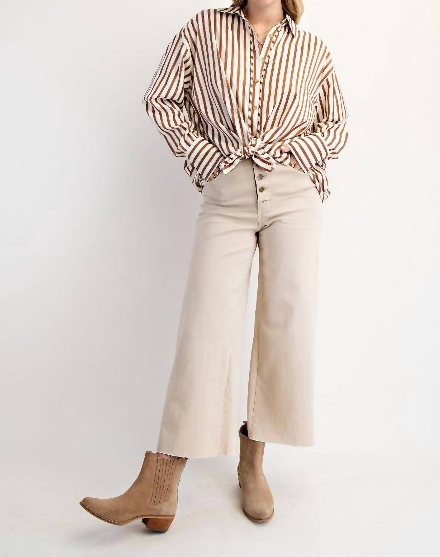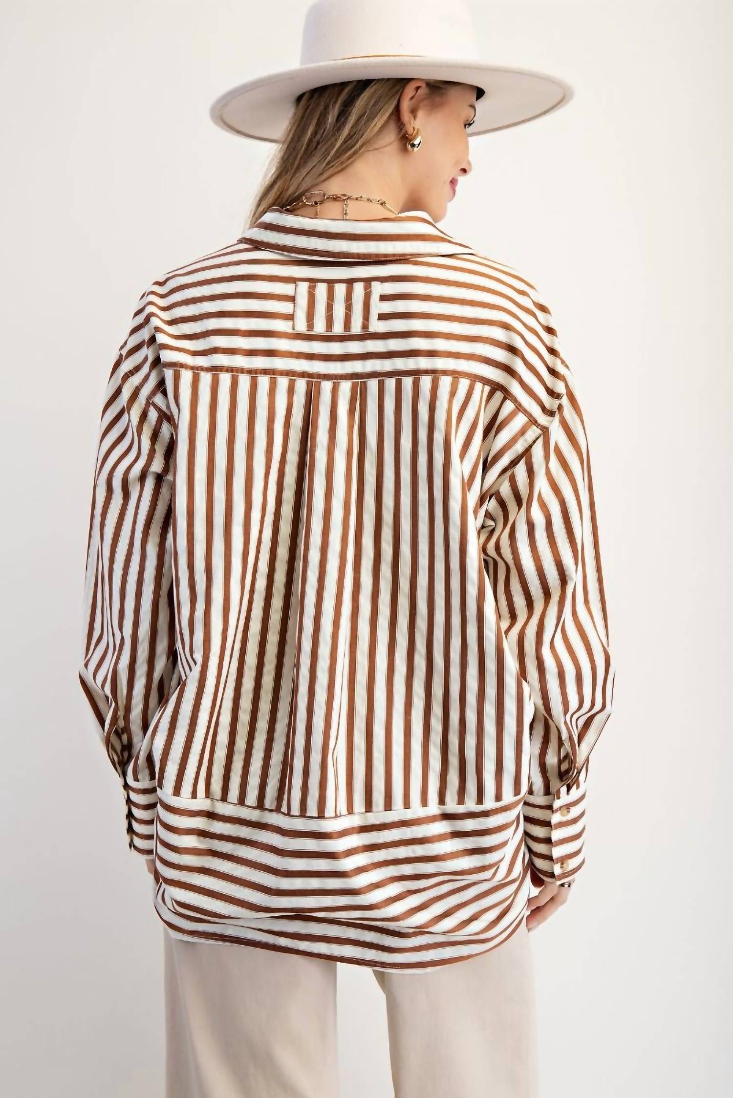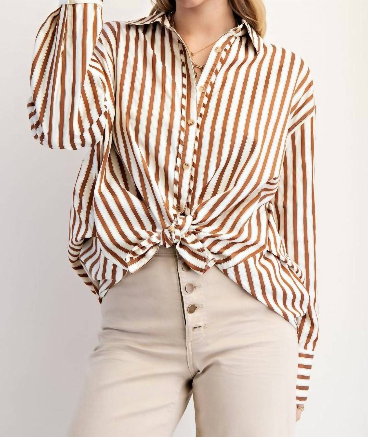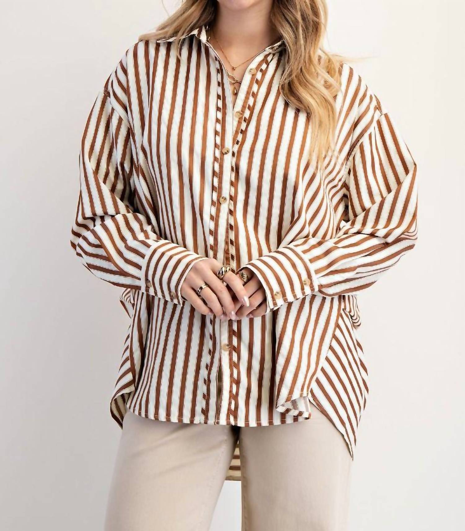 This button down shirt is comfortable yet polished. Introducing the Stripe Button Down Woven Shirt by Easel, a sophisticated piece in Brown Stripe that's perfect for any occasion. This long sleeve shirt features a classic collar and button closure for a polished look, with a loose fit that ensures all-day comfort. The shirt measures a flattering 27.75" in length and 24.5" in bust for size small, and the curved hemline adds a stylish flair. Care instructions include machine wash and line dry, making it ideal for casual or office wear.