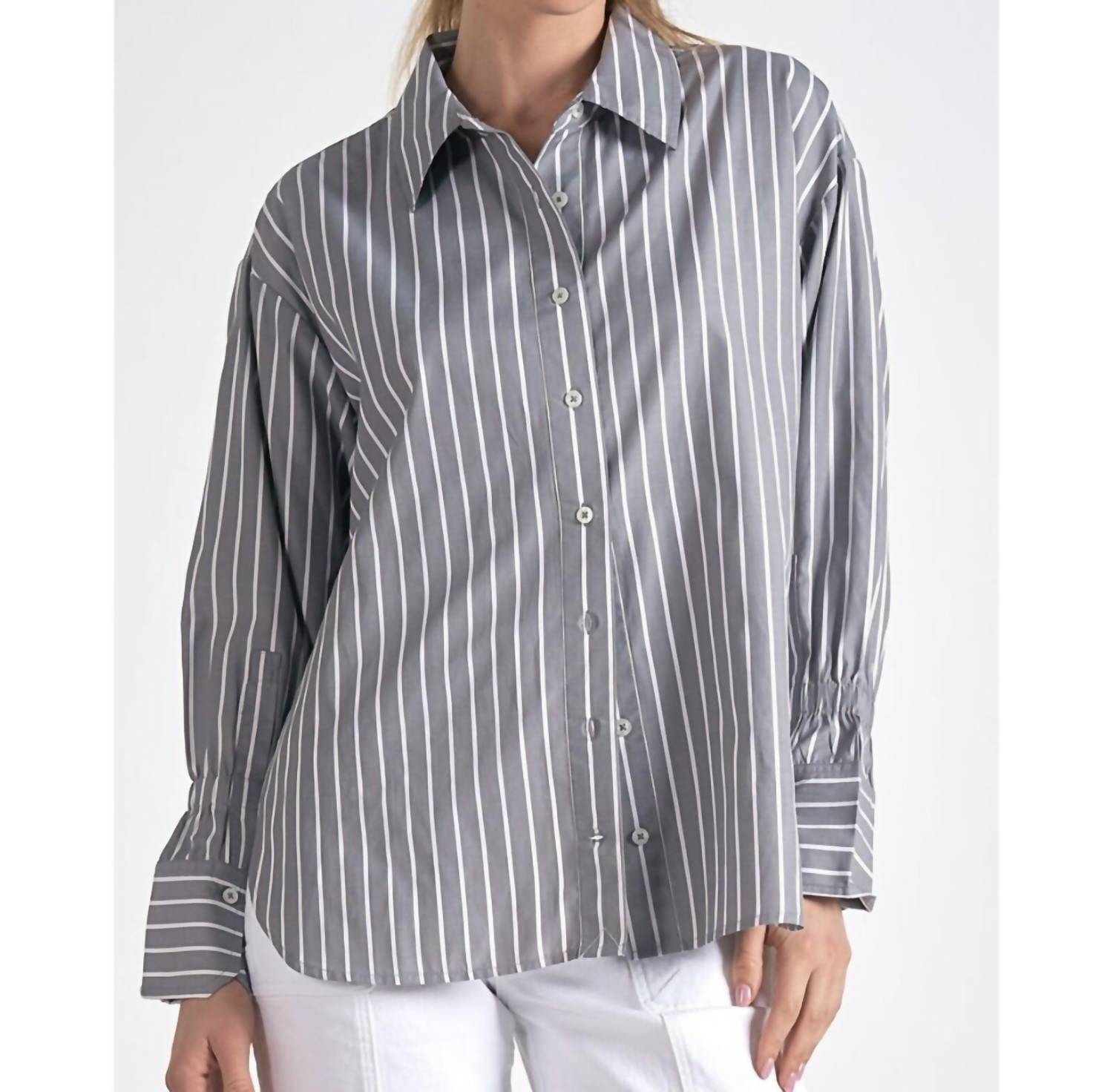 This button down shirt is comfortable yet polished. The Long Sleeve Smock Top with Wristband by ELAN is a stylish choice for any summer vacation wardrobe. This grey and white stripe shirt features a classic long sleeve design and a collar neckline, perfect for channeling 90s fashion. Closure Type: Button closure. It's an ideal pick for a casual outing, offering both comfort and style.