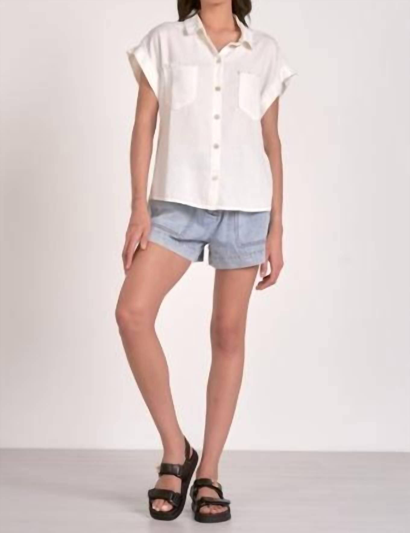 This button down shirt is comfortable yet polished. Elevate your summer wardrobe with the Pocketed Button Up Shirt by ELAN, a minimalist essential in solid white perfect for vacation style. Featuring cap sleeves and a classic collar neckline, this shirt incorporates practical pockets for additional convenience. Closure: Button closure. Care: Machine wash and line dry.