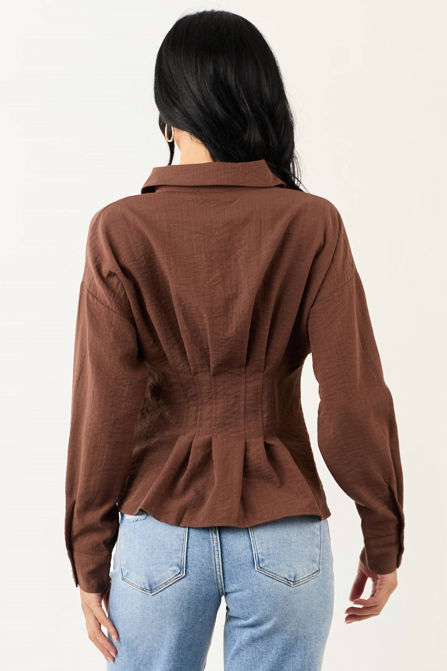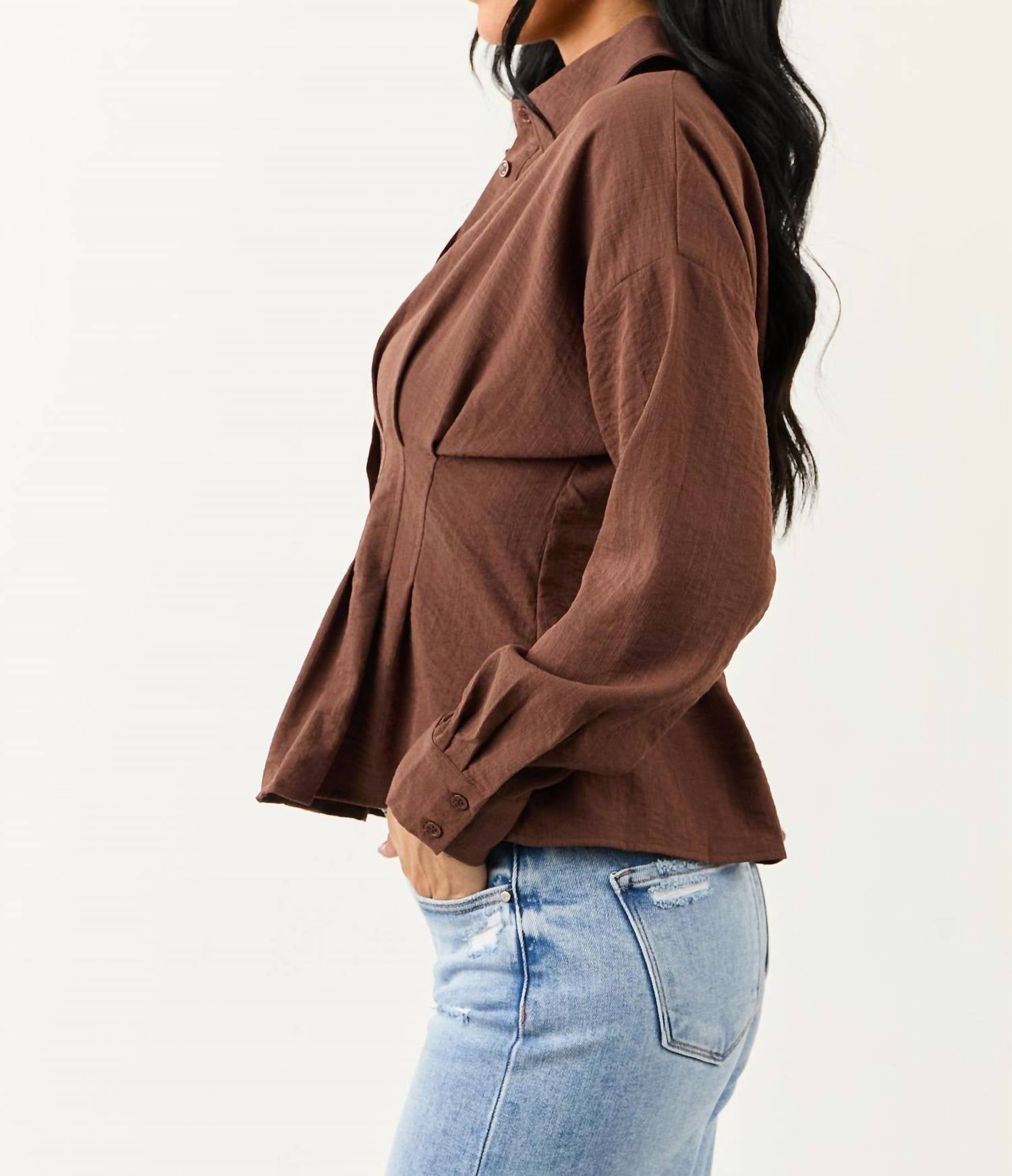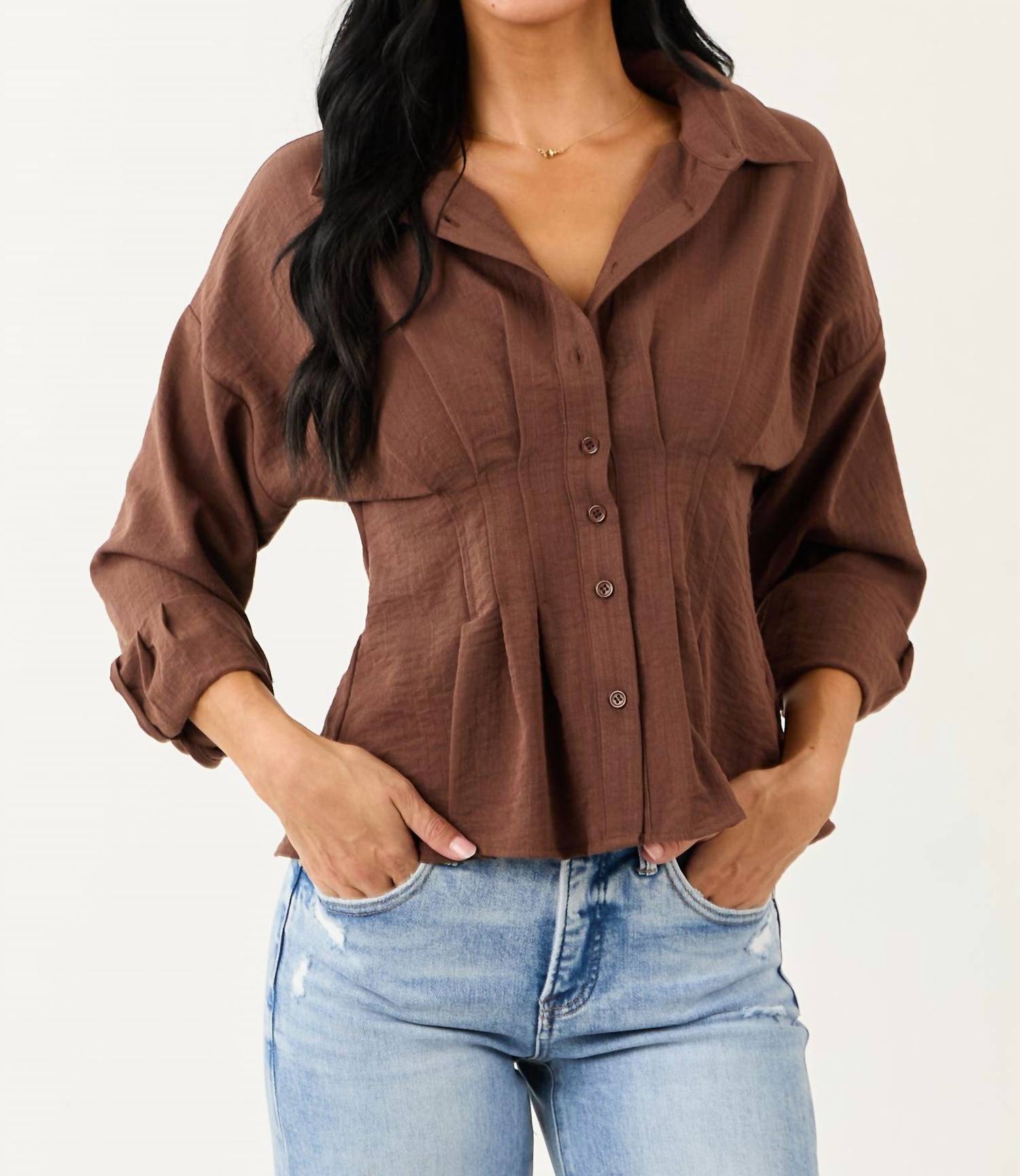 Introducing the Button Down Long Sleeve Pleated Top by Entro, a chic addition to any wardrobe with its timeless elegance in a rich cocoa hue. Featuring long sleeves and a collared neckline, this top showcases delicate pintuck pleats and banded double button cuffs. Crafted with a sleek striped pattern, it is ideal for summer vacations or a sophisticated Mother's Day ensemble. Enjoy the added convenience of a button closure, and maintain its refined look with hand washing and line drying.