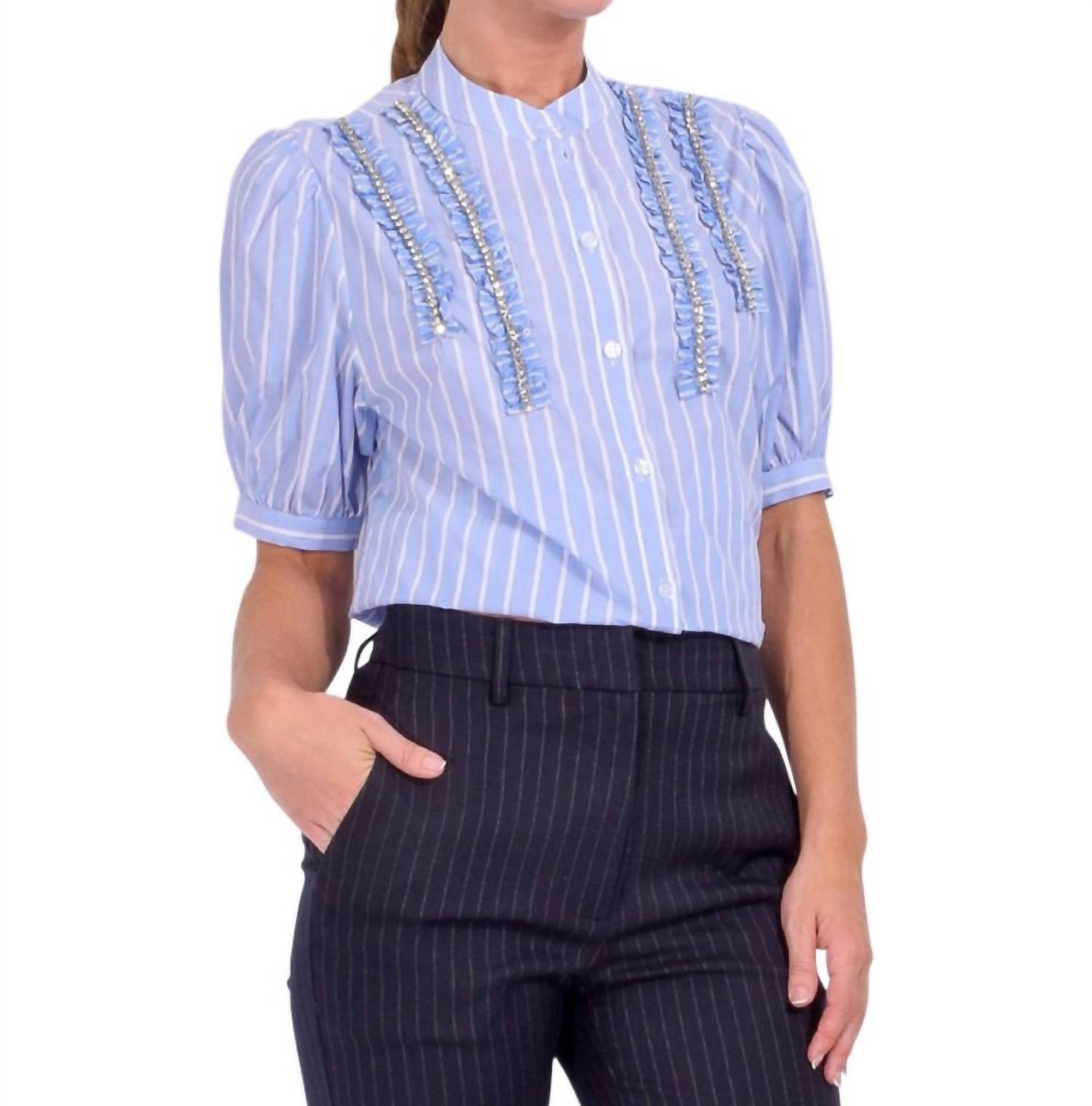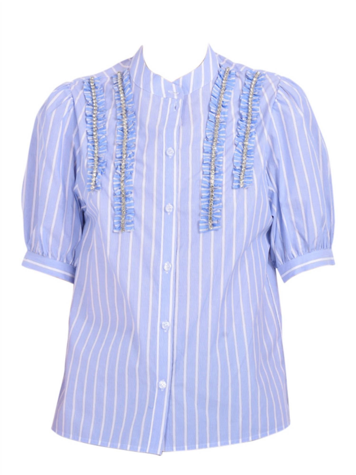 Perfectly tailored and soft to the touch. Introducing the Ifrill Rhinestone Frill Shirt by ESSENTIEL ANTWERP, a chic staple in Pale Kings Blue. This button-down shirt features playful short puff sleeves and a neat band collar, adorned with striking rhinestone and ruffle trim details for a feminine edge. Crafted from 100% cotton for a light and breathable feel, it's perfect for summer. Closure: Button closure. Care: Machine wash. Model is 5'8" and wearing a size XS.