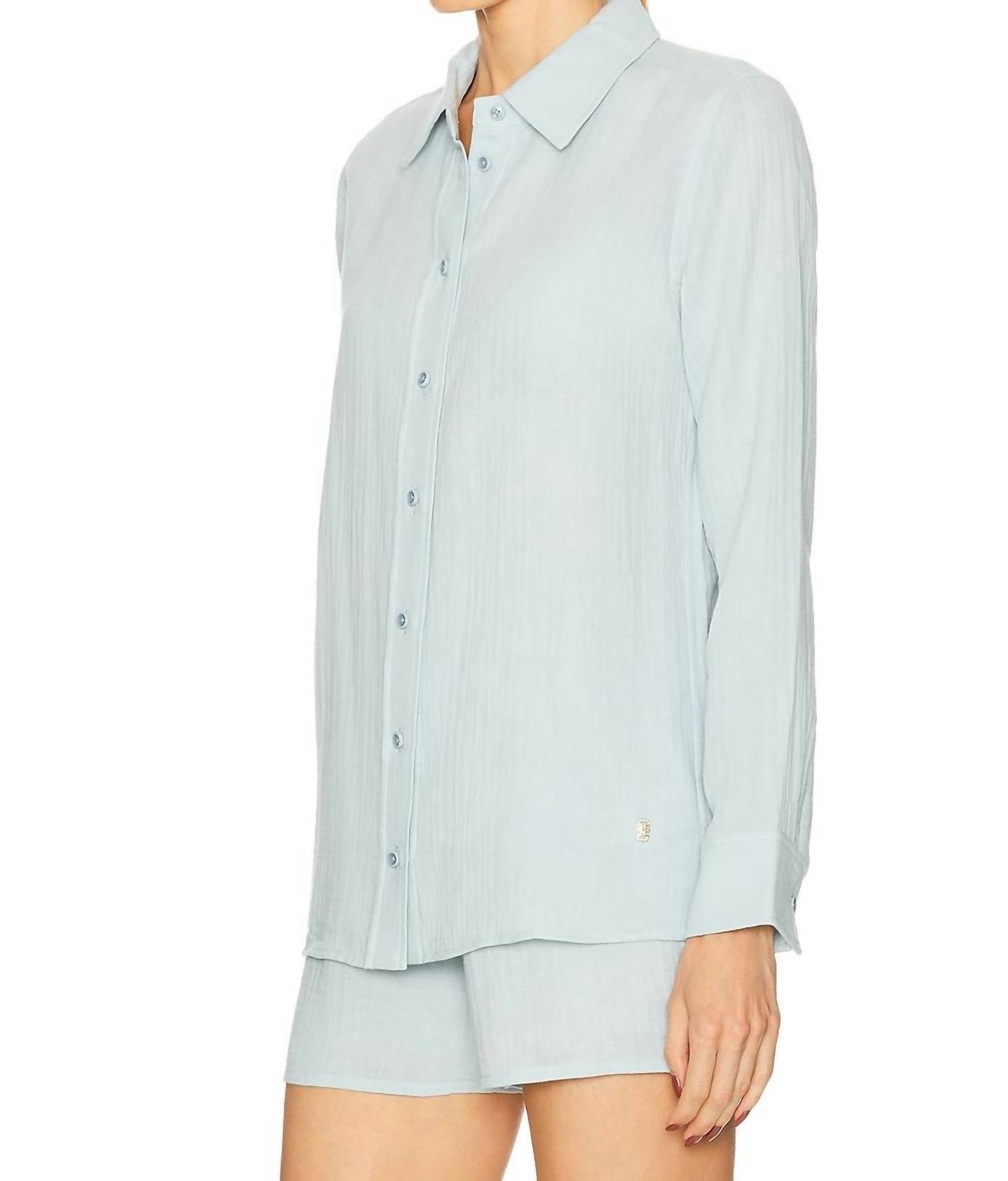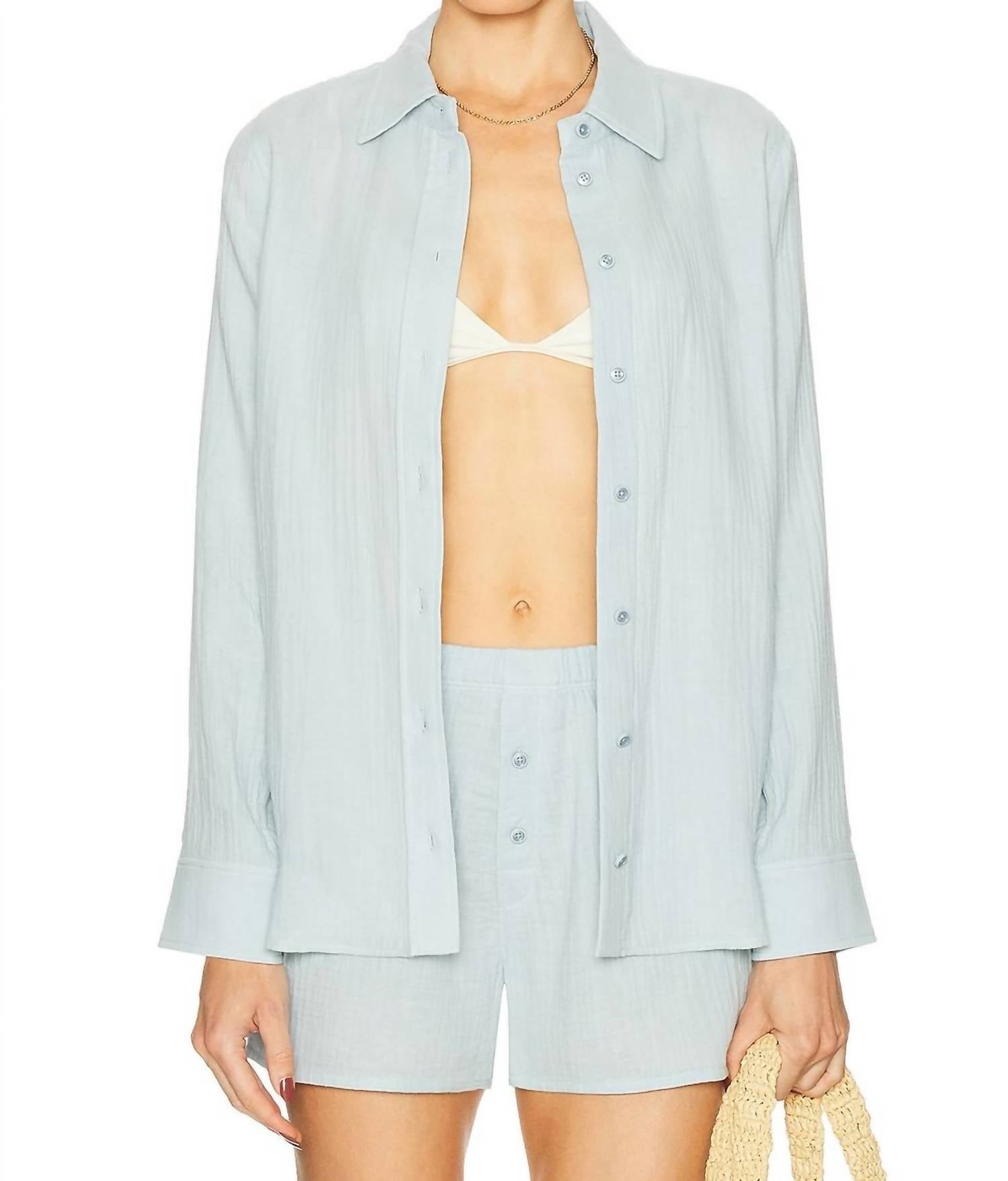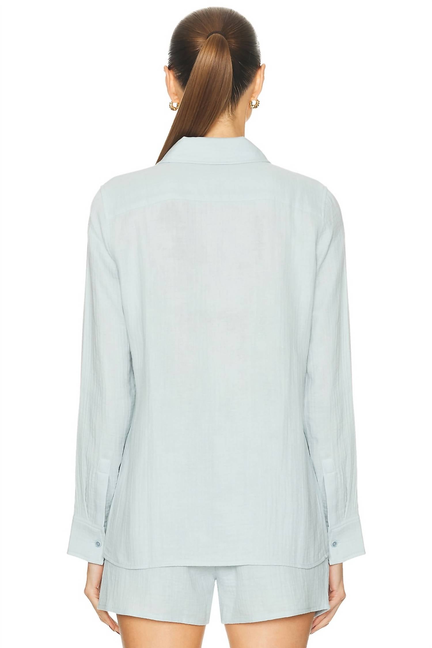 A classic button down shirt that will never go out of style. The Eterne Constance Gauze Shirt in Dusty Blue is a must-have for minimalist spring wardrobes. With its long sleeves and relaxed fit, this button-down top combines lightweight, breathable cotton gauze for understated style and comfort. Made with a solid pattern and a classic collar, this shirt is as versatile as it is chic. Enjoy easy maintenance with machine wash care while you embrace casual elegance with no pockets and a seamless button closure.