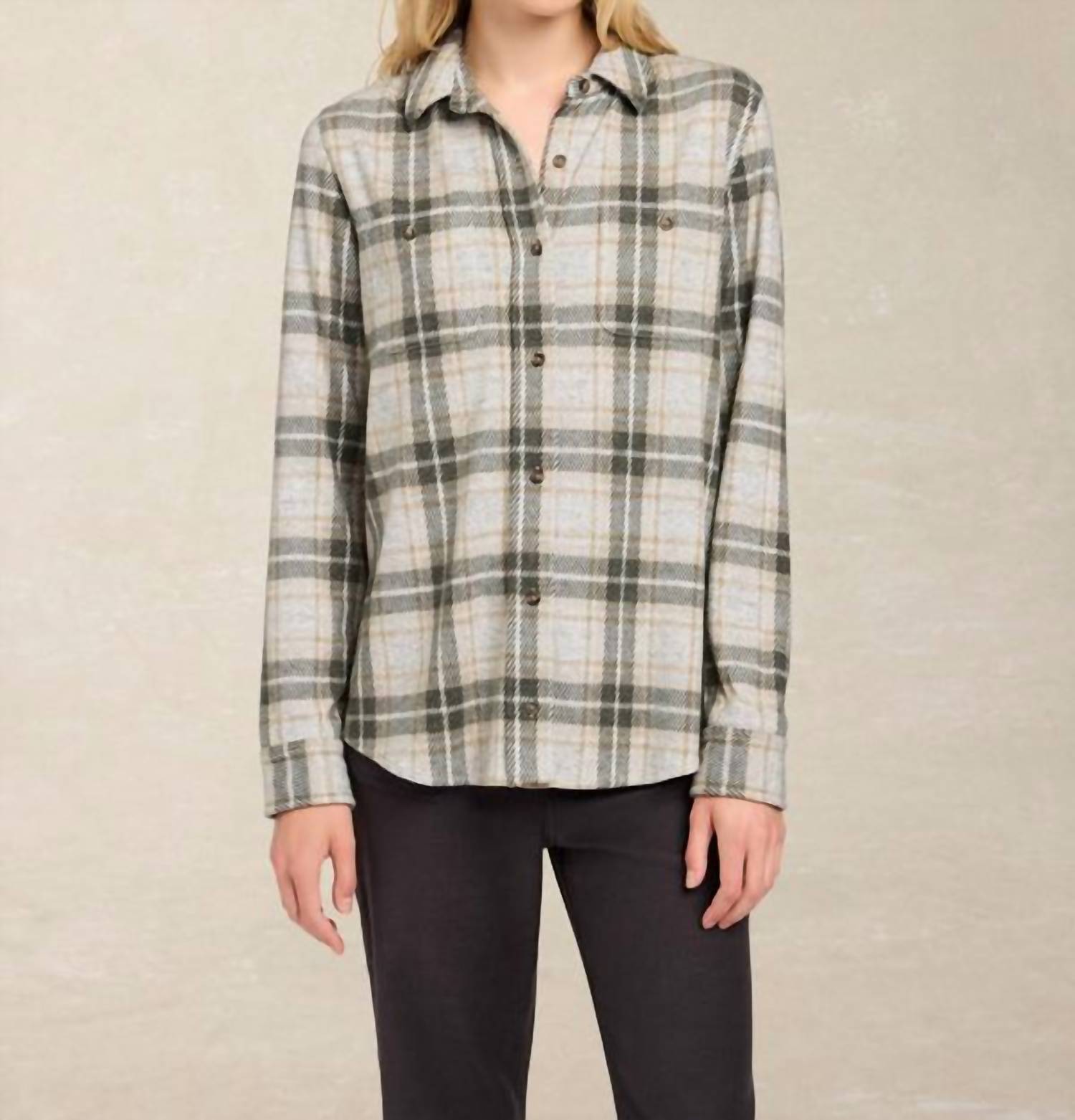 A classic button down shirt that will never go out of style. Introducing the Faherty Legend Sweater Shirt in Olive Grove, a button-down essential for your wardrobe inspired by 90s fashion. This women's piece features long sleeves and a classic collar, perfect for cool fall days. Adorned in a timeless plaid & check pattern, the shirt is crafted through a meticulous process to ensure softness. Closure: Button closure. Care: Machine wash and tumble dry for effortless maintenance.