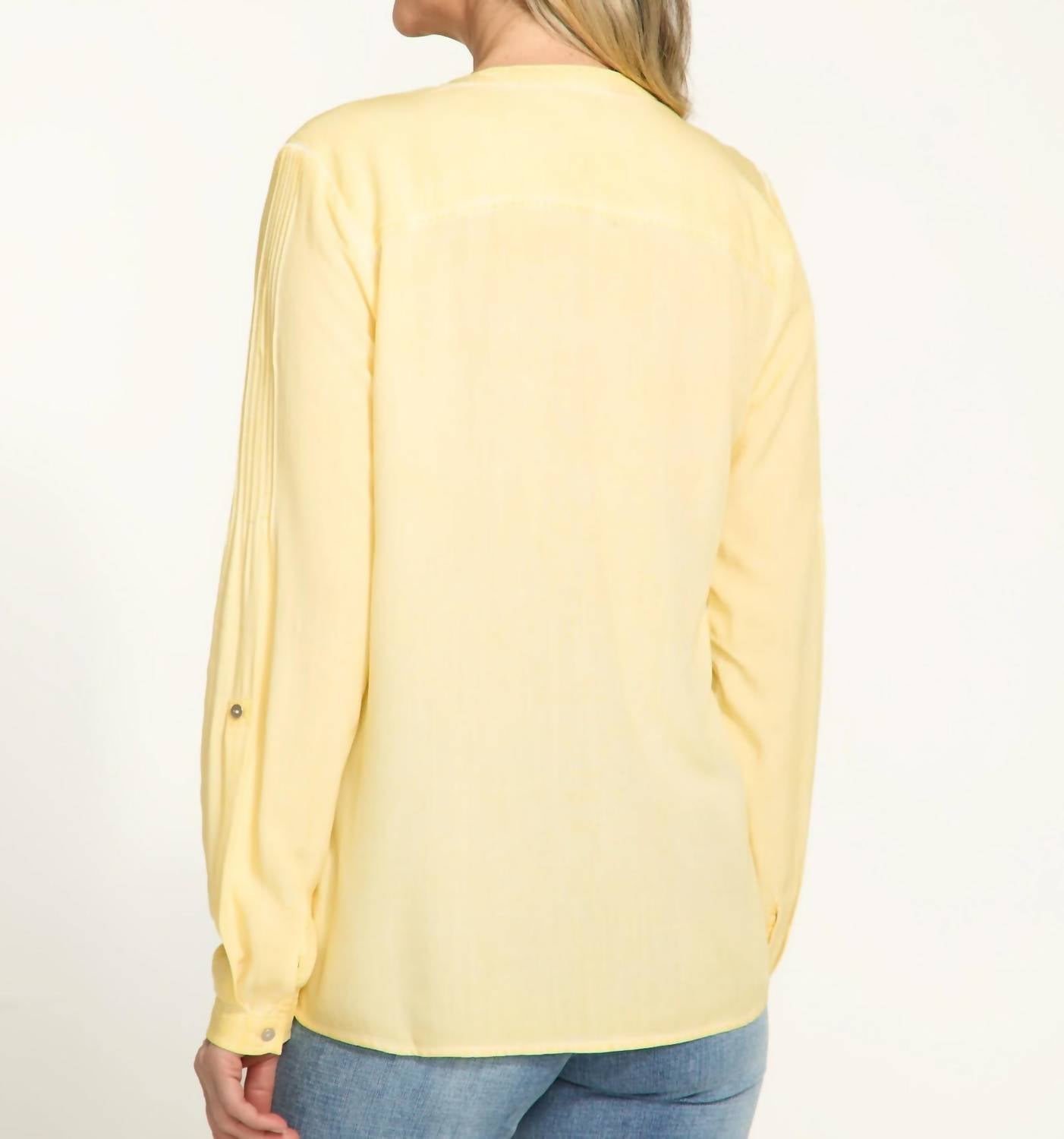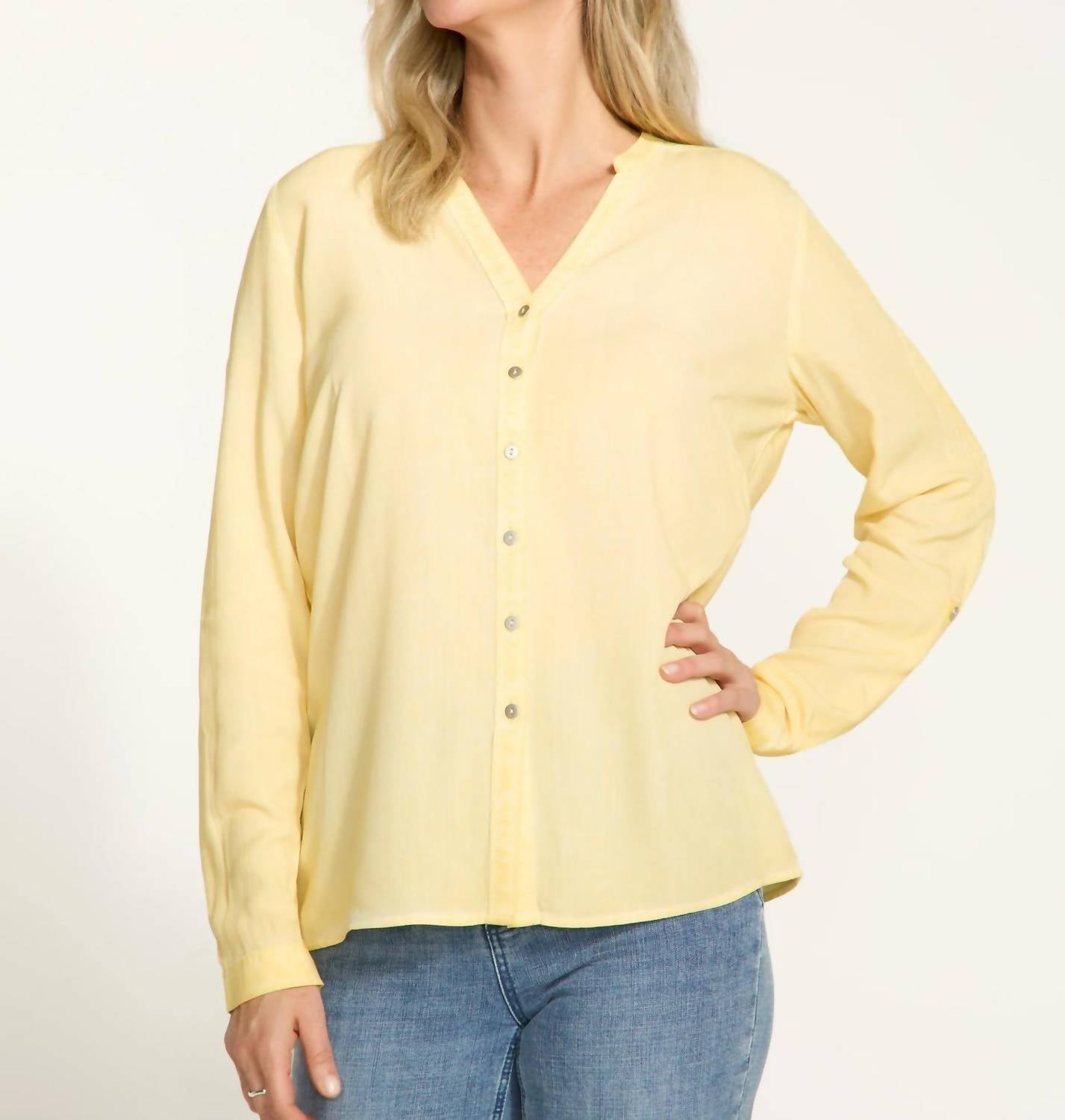 This button down shirt is comfortable yet polished. Introducing the Long Sleeve Roll-tab Shirt by FDJ, a chic addition to your wardrobe in a radiant light yellow. This versatile piece features long sleeves with a split V-neck and a convenient button closure, making it perfect for travel and workwear. Made from 100% viscose, this solid-patterned shirt is both stylish and comfortable. Care: Machine wash on the delicate cycle, inside out in cold water, do not bleach, hang to dry, and iron inside out at low temperature.