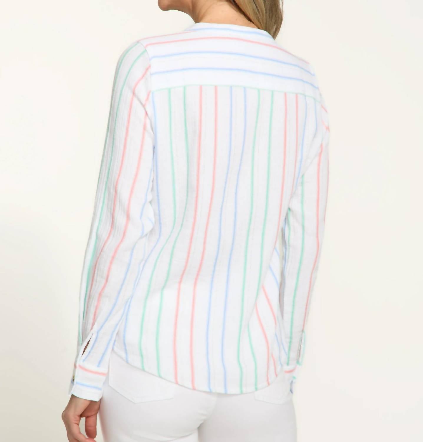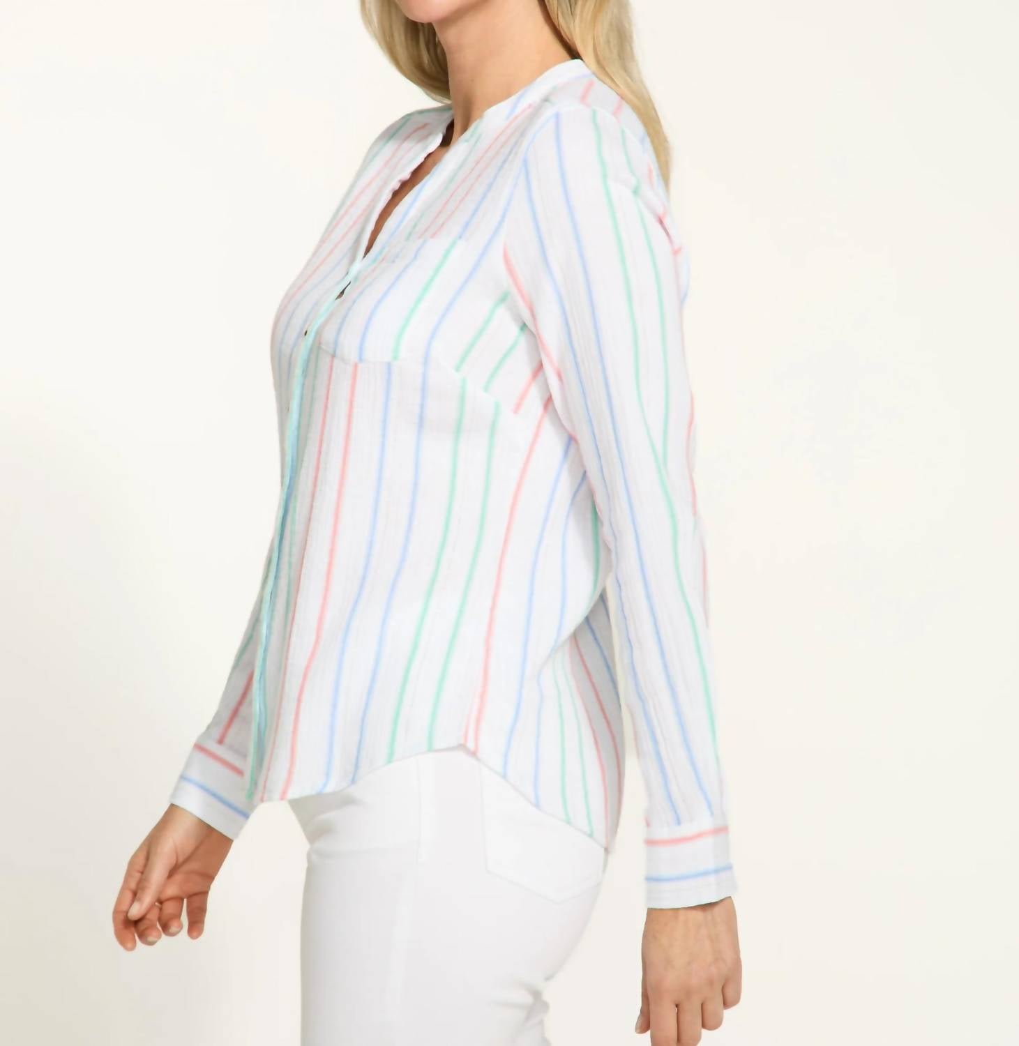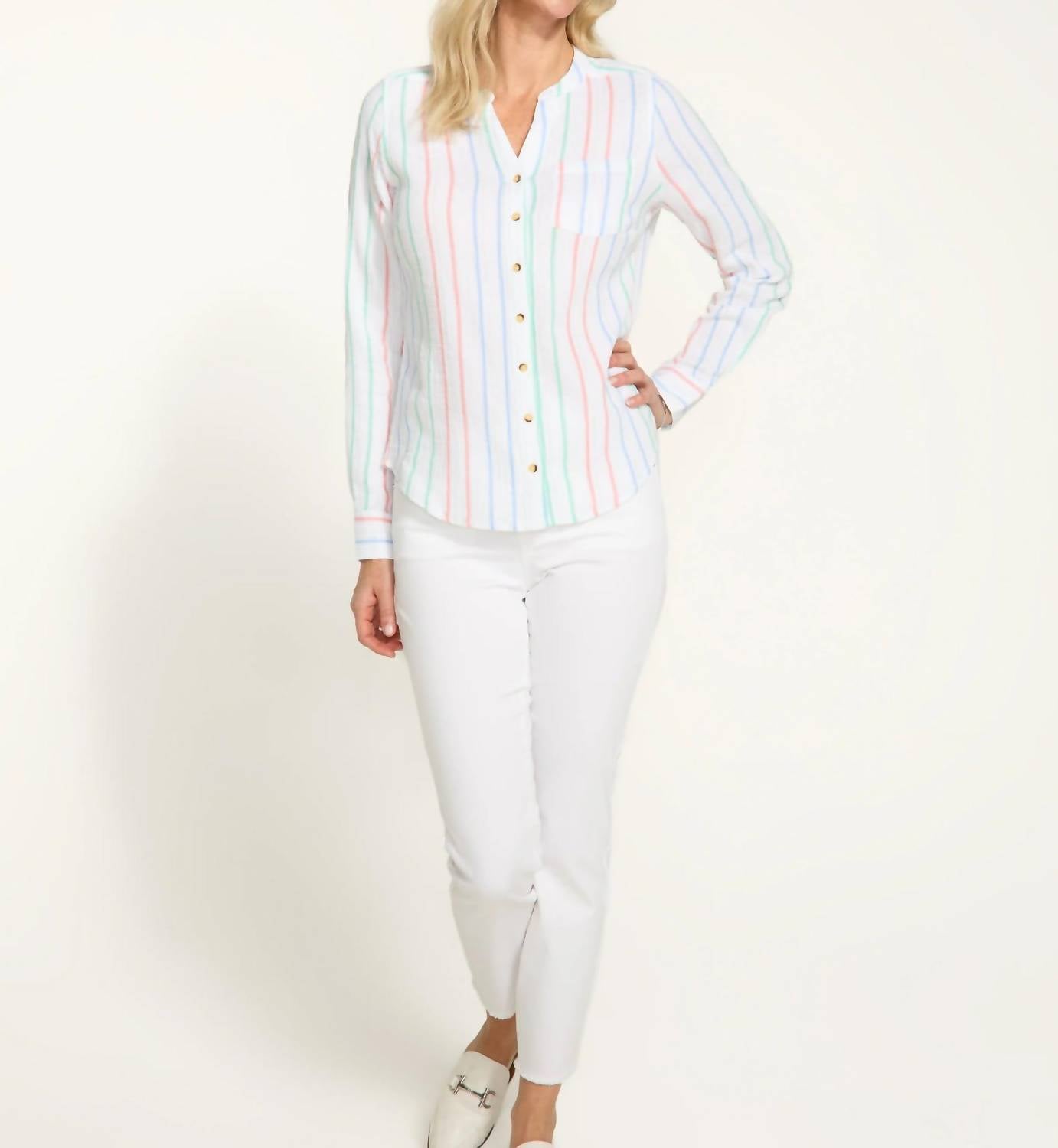 This button down shirt is comfortable yet polished. Elevate your travel wardrobe with the FDJ Long Sleeve Shirt in Monte Carlo Stripe, perfect for a casual yet chic look. Crafted from a cotton blend with 99% Cotton and 1% Lurex, this button-front tunic features a classic split V-neck and a playful multi-striped design. The functional pocket adds a touch of flair to this versatile piece, ideal for spring occasions. Care instructions include machine wash on a delicate cycle in cold water, hang to dry, and iron inside out at low temperature.