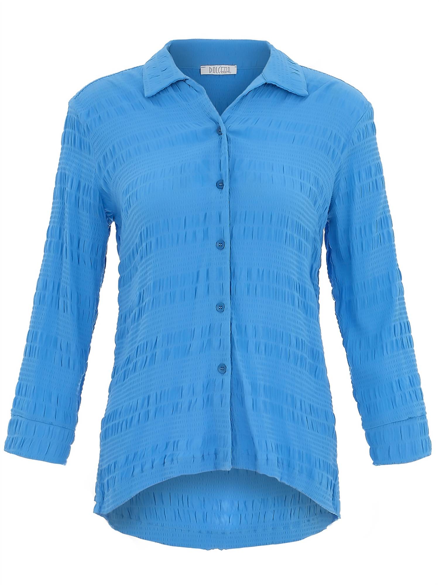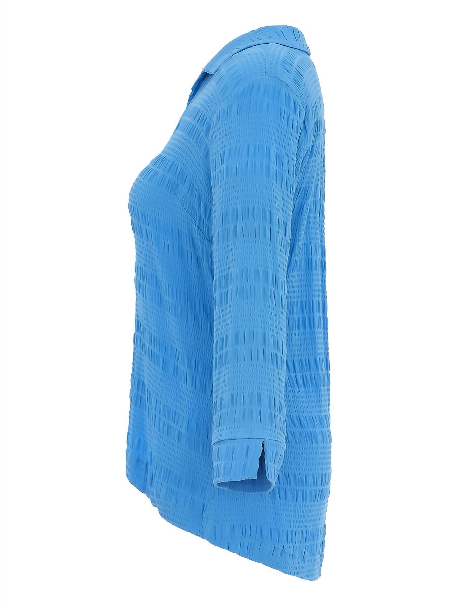 Perfectly tailored and soft to the touch. Introducing the On The Boardwalk Crinkle Shirt - Plus by FDJ in a striking cobalt hue. This button-down shirt is crafted from a viscose blend, ensuring comfort and a flattering fit with its three-quarter sleeves and collared neckline. Composition: 99% Viscose, 1% Elastane. Made in Canada, it features a secure button closure and requires hand washing.